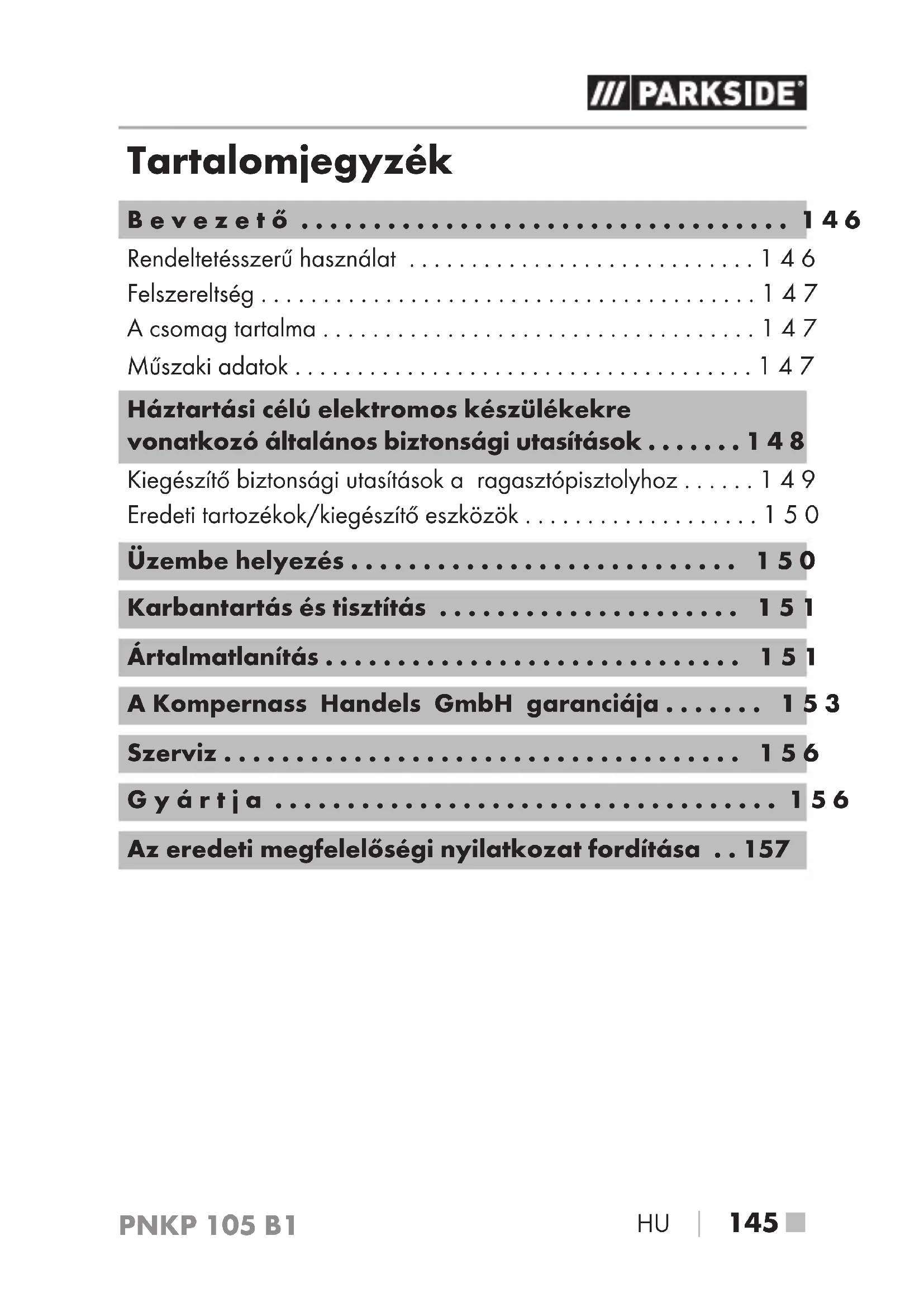 Találja meg az eszköz kézikönyvét ingyenesen PNKP 105 B1 PARKSIDE PDF formátumban.