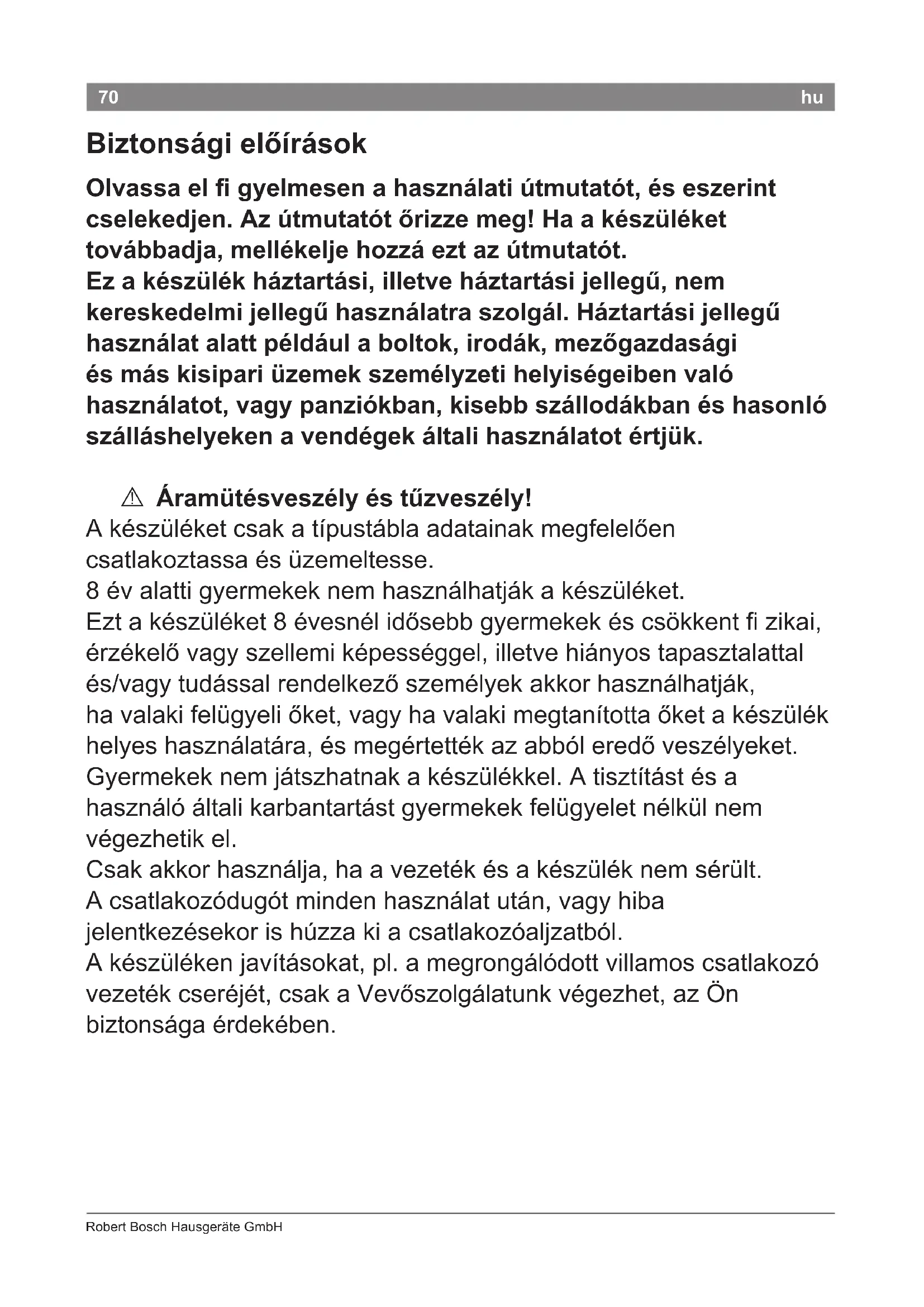 Vízzel teli kád, mosóteknő vagy egyéb edények közelében ne használja a készüléket. A Életveszély! Ne hagyja, hogy a készülék vízzel érintkezzen. Még akkor is életveszély áll fenn, ha kikapcsolta a készüléket, ezért használat után, vagy ha megszakítja a használatát, húzza ki a csatlakozódugóját. Nagyobb védelmet jelent, ha a lakás elektromos rendszerébe 30 mA-ig védő hibaáram-védőkapcsolót szereltet be. Kérjen tanácsot villanyszerelőtől.“ A Fulladásveszély! Ne engedje a gyermekeknek, hogy a csomagolóanyagokkal játszanak. A Megégetés veszélye! A formázófúvóka és a diffúzor felforrósodhat. Mielőtt levenné őket, várjon, amíg kihűlnek.72 Robert Bosch Hausgeräte GmbH