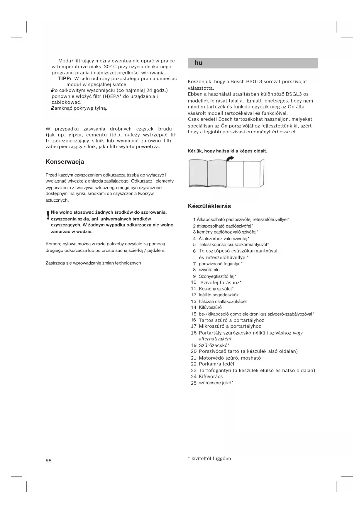-padlókefe* 5 Állatszőrhöz való szívófej* 6 Teleszkópcső csúszókarmantyúval* 7 Teleszkópcső csúszókarmantyúval és reteszelőhüvellyel* 8 porszívócső fogantyú* 9 szívótömlő 10 Szőnyegtisztító fej* 11 Szívófej fúráshoz* 12 Keskeny szívófej* 13 leállító segédeszköz 14 hálózati csatlakozókábel 15 Kifúvószűrő 16 be-/kikapcsoló gomb elektronikus szívóerő-szabályozóval* 17 Tartós szűrő a portartályhoz 18 Mikroszűrő a portartályhoz 19 Portartály szűrőzacskó nélküli szíváshoz vagy alternatívaként 20 Szűrőzacskó* 21 Porszívócső tartó (a készülék alsó oldalán) 22 Motorvédő szűrő, mosható 23 Porkamra fedél 24 Tartófogantyú (a készülék elülső és hátsó oldalán) 25 Kifúvórács Állatszőrhöz való szívófej* Teleszkópcső csúszókarmantyúval* Teleszkópcső csúszókarmantyúval és reteszelőhüvellyel* porszívócső fogantyú* szívótömlő Szőnyegtisztító fej* Szívófej fúráshoz* Keskeny szívófej* leállító segédeszköz hálózati csatlakozókábel Kifúvószűrő be-/kikapcsoló gomb elektronikus szívóerő-szabályozóval* Tartós szűrő a portartályhoz Mikroszűrő a portartályhoz Portartály szűrőzacskó nélküli szíváshoz vagy alternatívaként Szűrőzacskó* Porszívócső tartó (a készülék alsó oldalán) Motorvédő szűrő, mosható Porkamra fedél Tartófogantyú (a készülék elülső és hátsó oldalán) Kifúvórács szűrőcsere-jelző*