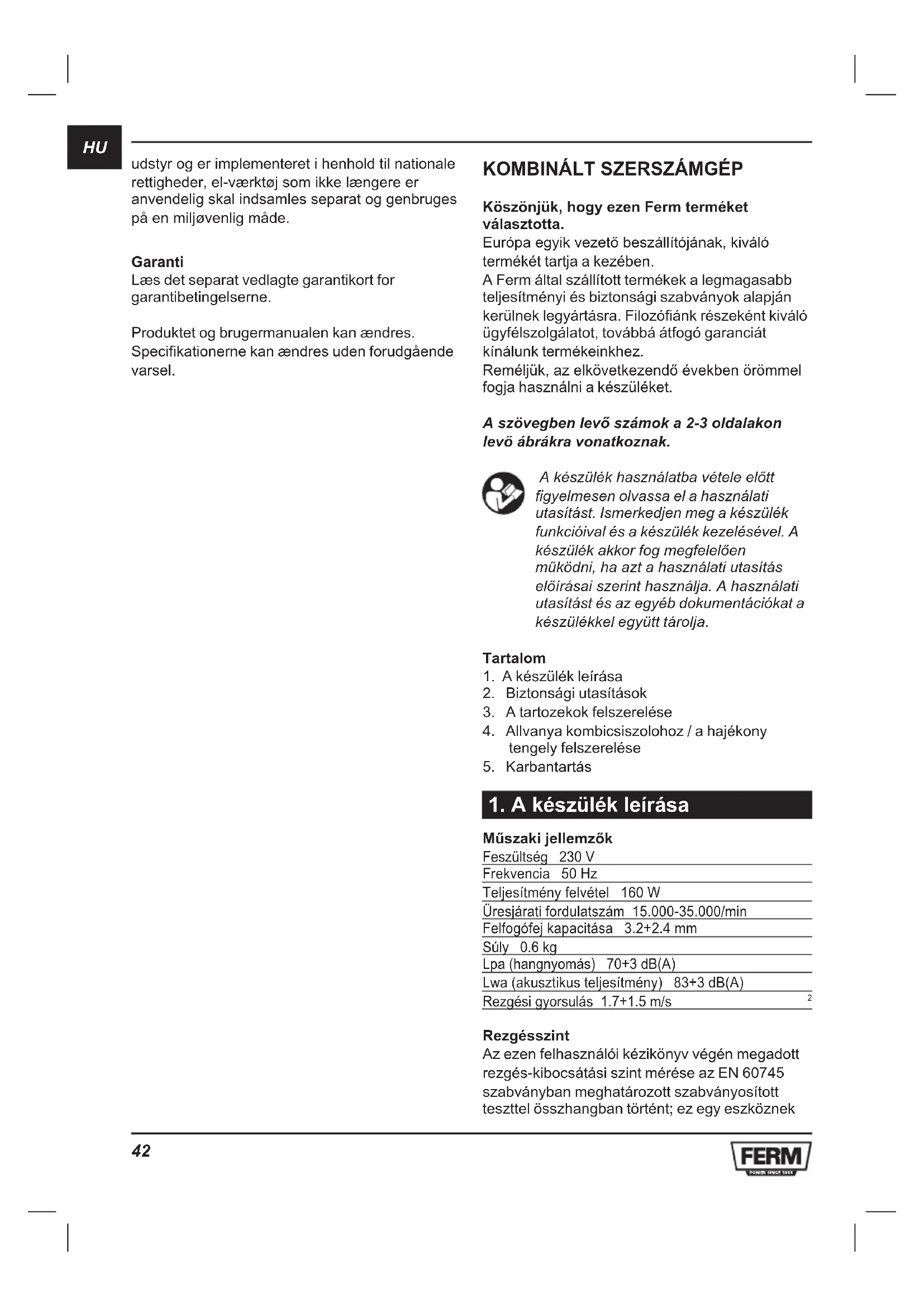 Köszönjük, hogy ezen Ferm terméket választotta. Európaegyikvezetőbeszállítójának,kiváló termékét tartja a kezében. A Ferm által szállított termékek a legmagasabb teljesítményi és biztonsági szabványok alapján kerülnek legyártásra. Filozófiánk részeként kiváló ügyfélszolgálatot, továbbá átfogó garanciát kínálunk termékeinkhez. Reméljük,azelkövetkezendőévekbenörömmel fogja használni a készüléket. A szövegben levő számok a 2-3 oldalakon levő ábrákra vonatkoznak. Akészülékhasználatbavételeelőtt figyelmesen olvassa el a használati utasítást. Ismerkedjen meg a készülék funkcióival és a készülék kezelésével. A készülékakkorfogmegfelelően működni,haaztahasználatiutasítás előírásaiszerinthasználja.Ahasználati utasítást és az egyéb dokumentációkat a készülékkel együtt tárolja. Tartalom