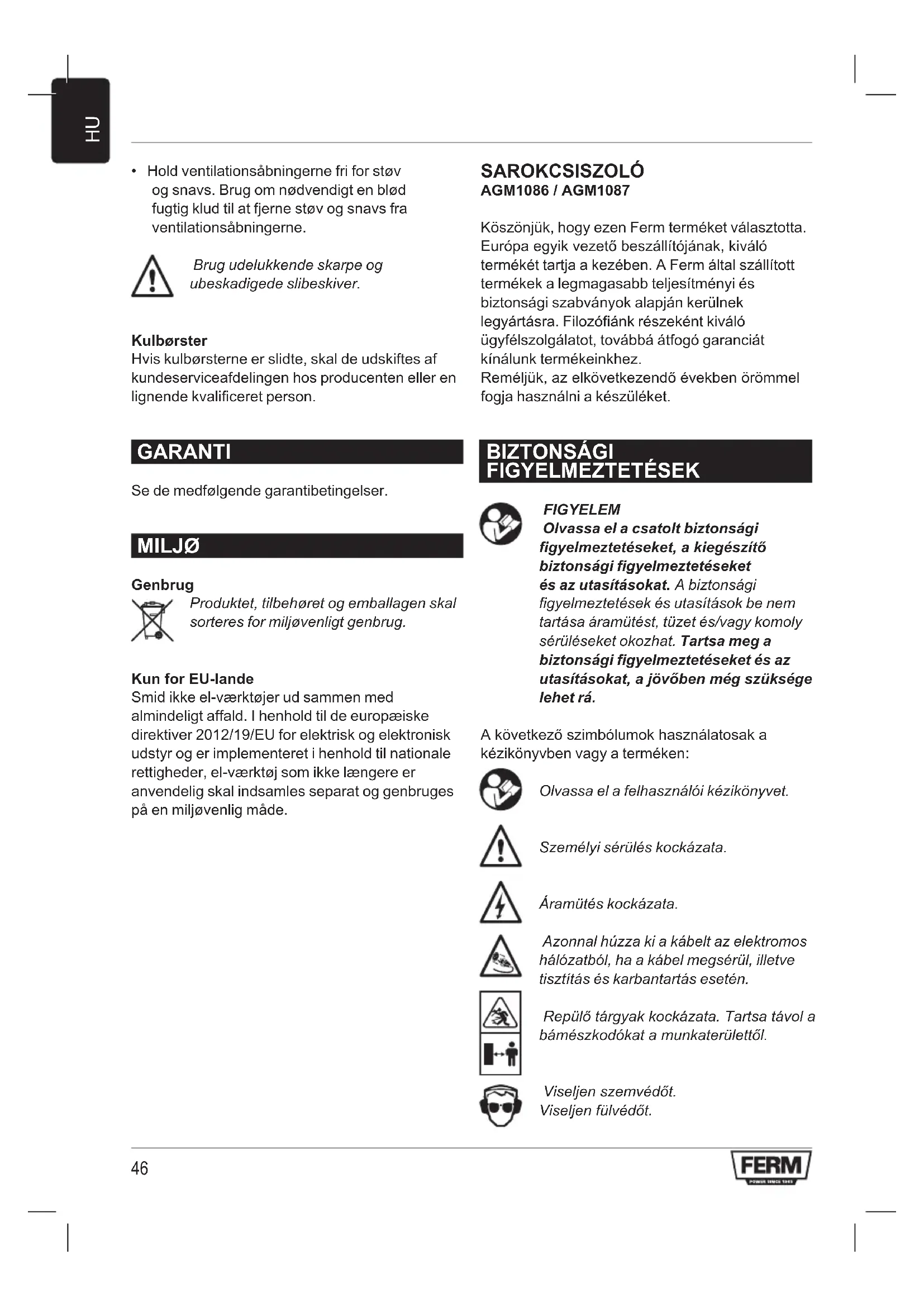 - Hold ventilationsåbningerne fri for støv og snavs. Brug om nødvendigt en blød fugtig klud til at fjerne støv og snavs fra ventilationsåbningerne. Brug udelukkende skarpe og ubeskadigede slibeskiver. Kulbørster Hvis kulbørsterne er slidte, skal de udskiftes af kundeserviceafdelingen hos producenten eller en lignende kvalificeret person. GARANTI Se de medfølgende garantibetingelser. MILJØ Genbrug Produktet, tilbehøret og emballagen skal sorteres for miljøvenligt genbrug. Kun for EU-lande Smid ikke el-værktøjer ud sammen med almindeligt affald. I henhold til de europæiske direktiver 2012/19/EU for elektrisk og elektronisk udstyr og er implementeret i henhold til nationale rettigheder, el-værktøj som ikke længere er anvendelig skal indsamles separat og genbruges på en miljøvenlig måde. SAROKCSISZOLÓ AGM1086 / AGM1087 Köszönjük, hogy ezen Ferm terméket választotta. Európa egyik vezető beszállítójának, kiváló termékét tartja a kezében. A Ferm által szállított termékek a legmagasabb teljesítményi és biztonsági szabványok alapján kerülnek legyártásra. Filozófiánk részeként kiváló ügyfélszolgálatot, továbbá átfogó garanciát kínálunk termékeinkhez. Reméljük, az elkövetkezendő években örömmel fogja használni a készüléket. BIZTONSÁGI FIGYELMEZTETÉSEK FIGYELEM Olvassa el a csatolt biztonsági figyelmeztetéseket, a kiegészítő biztonsági figyelmeztetéseket és az utasításokat. A biztonsági figyelmeztetések és utasítások be nem tartása áramütést, tüzet és/vagy komoly sérüléseket okozhat. Tartsa meg a biztonsági figyelmeztetéseket és az utasításokat, a jövőben még szüksége lehet rá. A következő szimbólumok használatosak a kézikönyvben vagy a terméken: Olvassa el a felhasználói kézikönyvet. Személyi sérülés kockázata. Áramütés kockázata. Azonnal húzza ki a kábelt az elektromos hálózatból, ha a kábel megsérül, illetve tisztítás és karbantartás esetén. Repülőtárgyakkockázata.Tartsatávola bámészkodókatamunkaterülettől. Viseljenszemvédőt. Viseljenfülvédőt.47