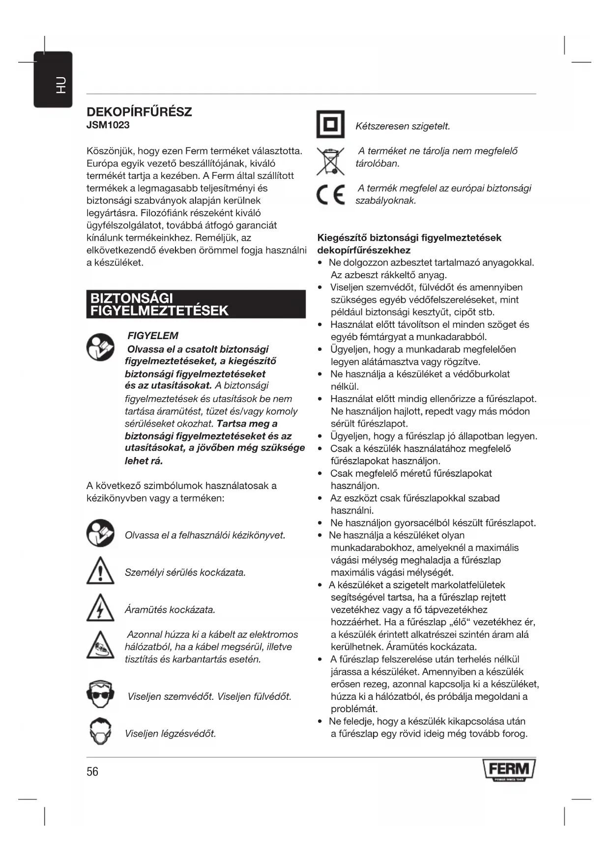 JSM1023 Köszönjük, hogy ezen Ferm terméket választotta. Európa egyik vezető beszállítójának, kiváló termékét tartja a kezében. A Ferm által szállított termékek a legmagasabb teljesítményi és biztonsági szabványok alapján kerülnek legyártásra. Filozófiánk részeként kiváló ügyfélszolgálatot, továbbá átfogó garanciát kínálunk termékeinkhez. Reméljük, az elkövetkezendő években örömmel fogja használni a készüléket. BIZTONSÁGI FIGYELMEZTETÉSEK FIGYELEM Olvassa el a csatolt biztonsági figyelmeztetéseket, a kiegészítő biztonsági figyelmeztetéseket és az utasításokat. A biztonsági figyelmeztetések és utasítások be nem tartása áramütést, tüzet és/vagy komoly sérüléseket okozhat. Tartsa meg a biztonsági figyelmeztetéseket és az utasításokat, a jövőben még szüksége lehet rá. A következő szimbólumok használatosak a kézikönyvben vagy a terméken: Olvassa el a felhasználói kézikönyvet. Személyi sérülés kockázata. Áramütés kockázata. Azonnal húzza ki a kábelt az elektromos hálózatból, ha a kábel megsérül, illetve tisztítás és karbantartás esetén. Viseljenszemvédőt.Viseljenfülvédőt. Viseljenlégzésvédőt. Kétszeresen szigetelt. Aterméketnetároljanemmegfelelő tárolóban. A termék megfelel az európai biztonsági szabályoknak. Kiegészítő biztonsági figyelmeztetések dekopírfűrészekhez