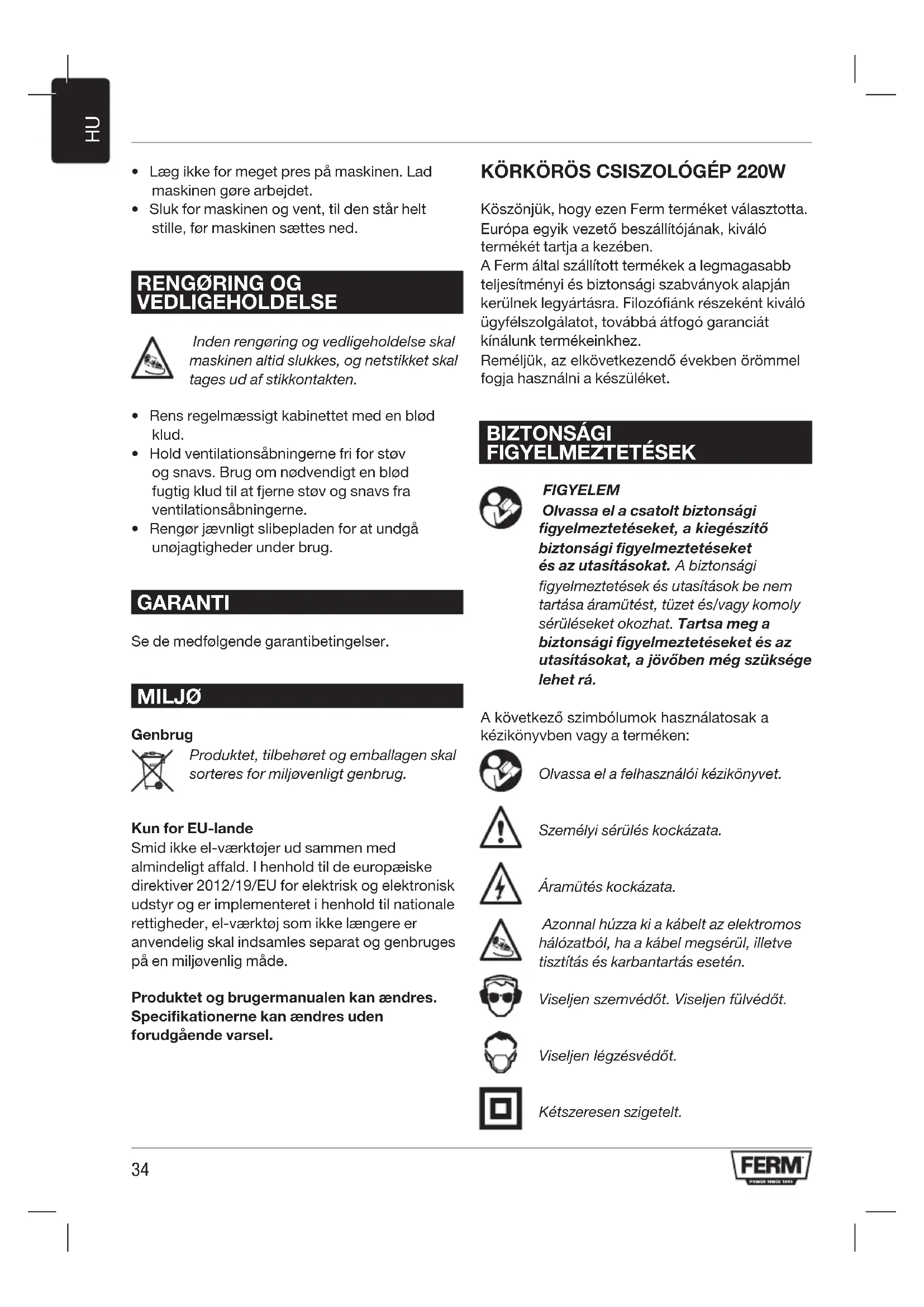 - Rengør jævnligt slibepladen for at undgå unøjagtigheder under brug. GARANTI Se de medfølgende garantibetingelser. MILJØ Genbrug Produktet, tilbehøret og emballagen skal sorteres for miljøvenligt genbrug. Kun for EU-lande Smid ikke el-værktøjer ud sammen med almindeligt affald. I henhold til de europæiske direktiver 2012/19/EU for elektrisk og elektronisk udstyr og er implementeret i henhold til nationale rettigheder, el-værktøj som ikke længere er anvendelig skal indsamles separat og genbruges på en miljøvenlig måde. Produktet og brugermanualen kan ændres. Specifikationerne kan ændres uden forudgående varsel. KÖRKÖRÖS CSISZOLÓGÉP 220W Köszönjük, hogy ezen Ferm terméket választotta. Európa egyik vezető beszállítójának, kiváló termékét tartja a kezében. A Ferm által szállított termékek a legmagasabb teljesítményi és biztonsági szabványok alapján kerülnek legyártásra. Filozófiánk részeként kiváló ügyfélszolgálatot, továbbá átfogó garanciát kínálunk termékeinkhez. Reméljük, az elkövetkezendő években örömmel fogja használni a készüléket. BIZTONSÁGI FIGYELMEZTETÉSEK FIGYELEM Olvassa el a csatolt biztonsági figyelmeztetéseket, a kiegészítő biztonsági figyelmeztetéseket és az utasításokat. A biztonsági figyelmeztetések és utasítások be nem tartása áramütést, tüzet és/vagy komoly sérüléseket okozhat. Tartsa meg a biztonsági figyelmeztetéseket és az utasításokat, a jövőben még szüksége lehet rá. A következő szimbólumok használatosak a kézikönyvben vagy a terméken: Olvassa el a felhasználói kézikönyvet. Személyi sérülés kockázata. Áramütés kockázata. Azonnal húzza ki a kábelt az elektromos hálózatból, ha a kábel megsérül, illetve tisztítás és karbantartás esetén. Viseljen szemvédőt. Viseljen fülvédőt. Viseljen légzésvédőt. Kétszeresen szigetelt.35