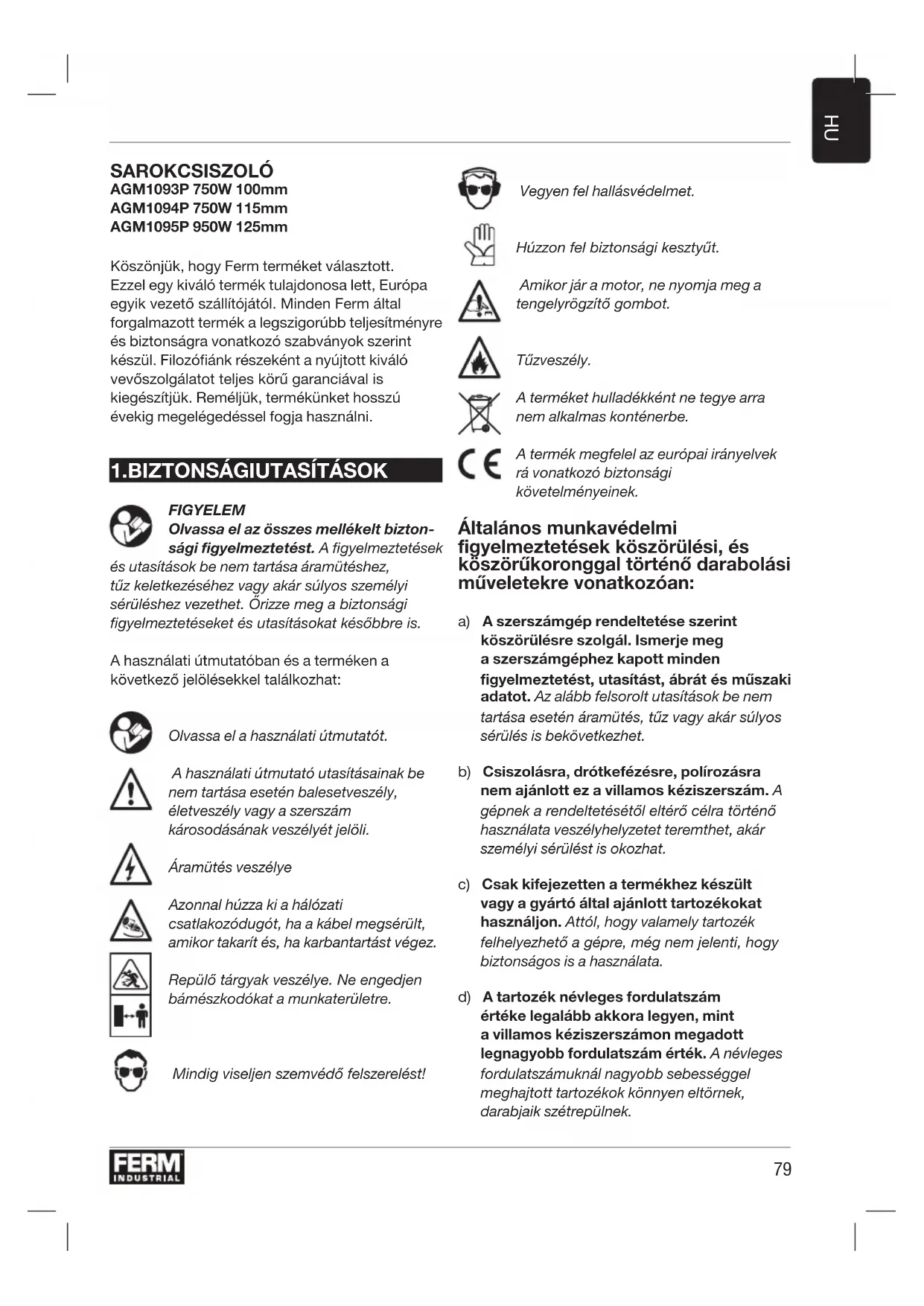 SAROKCSISZOLÓ AGM1093P 750W 100mm AGM1094P 750W 115mm AGM1095P 950W 125mm Köszönjük, hogy Ferm terméket választott. Ezzel egy kiváló termék tulajdonosa lett, Európa egyik vezető szállítójától. Minden Ferm által forgalmazott termék a legszigorúbb teljesítményre és biztonságra vonatkozó szabványok szerint készül. Filozófiánk részeként a nyújtott kiváló vevőszolgálatot teljes körű garanciával is kiegészítjük. Reméljük, termékünket hosszú évekig megelégedéssel fogja használni.