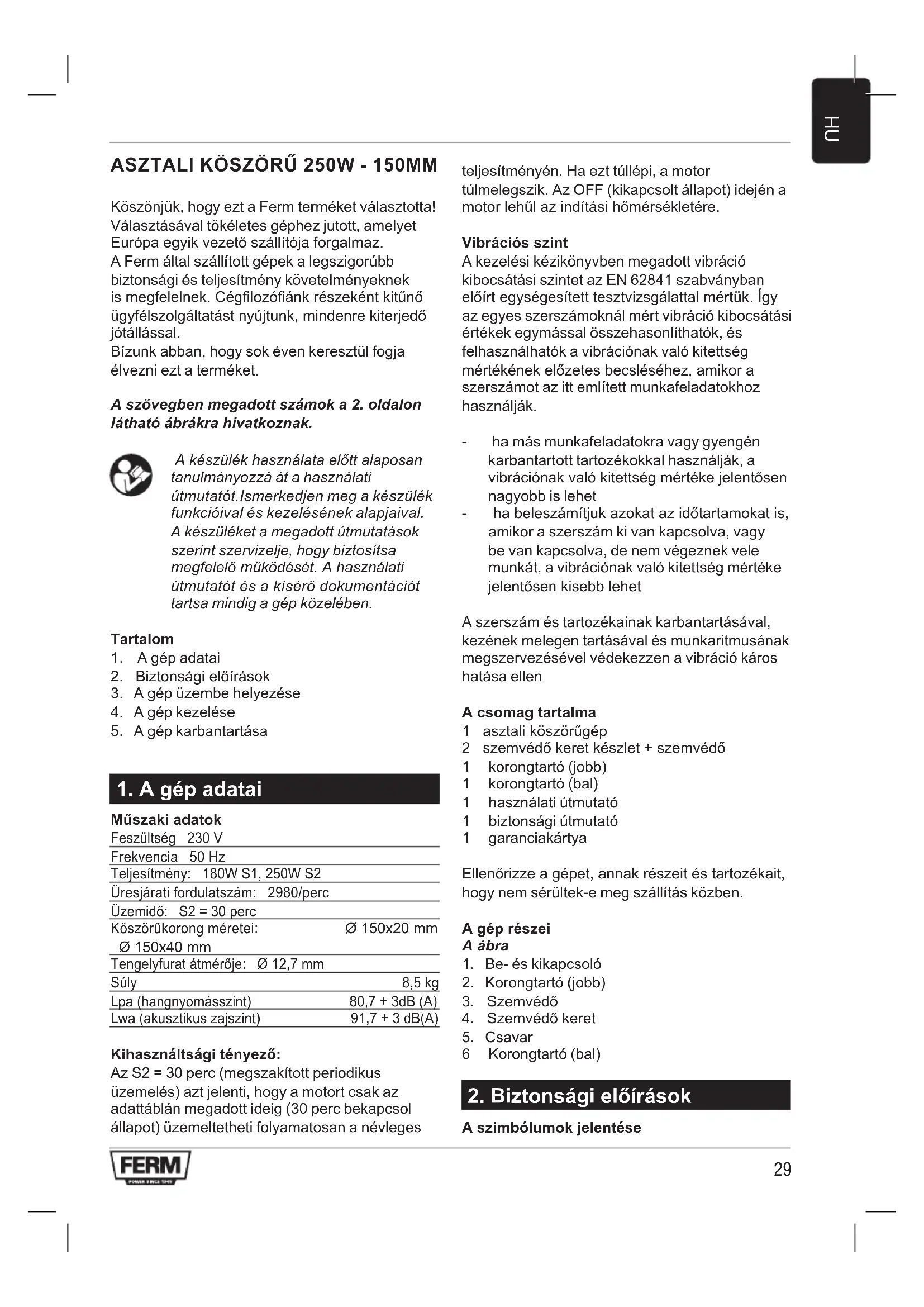 ASZTALI KÖSZÖRŰ 250W - 150MM Köszönjük, hogy ezt a Ferm terméket választotta! Választásával tökéletes géphez jutott, amelyet Európa egyik vezető szállítója forgalmaz. A Ferm által szállított gépek a legszigorúbb biztonsági és teljesítmény követelményeknek is megfelelnek. Cégfilozófiánk részeként kitűnő ügyfélszolgáltatást nyújtunk, mindenre kiterjedő jótállással. Bízunk abban, hogy sok éven keresztül fogja élvezni ezt a terméket. A szövegben megadott számok a 2. oldalon látható ábrákra hivatkoznak. Akészülékhasználataelőttalaposan tanulmányozzá át a használati útmutatót.Ismerkedjen meg a készülék funkcióival és kezelésének alapjaival. A készüléket a megadott útmutatások szerint szervizelje, hogy biztosítsa megfelelőműködését.Ahasználati útmutatótésakísérődokumentációt tartsa mindig a gép közelében. Tartalom