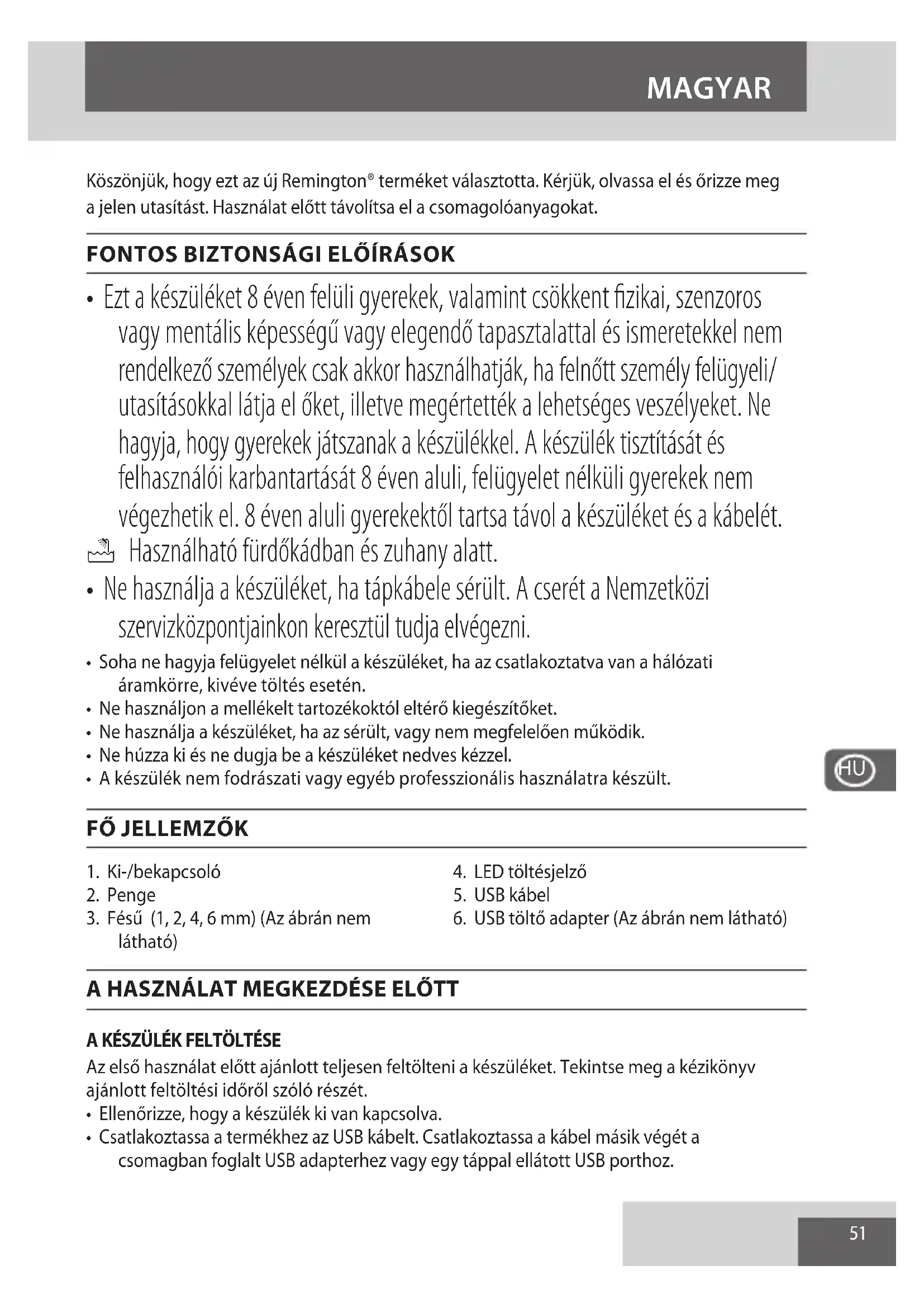 1. Ki-/bekapcsoló2. Penge3. Fésű (1, 2, 4, 6 mm) (Az ábrán nem látható)4. LED töltésjelző5. USB kábel6. USB töltő adapter (Az ábrán nem látható) A HASZNÁLAT MEGKEZDÉSE ELŐTT A KÉSZÜLÉK FELTÖLTÉSEAz első használat előtt ajánlott teljesen feltölteni a készüléket. Tekintse meg a kézikönyv ajánlott feltöltési időről szóló részét.• Ellenőrizze, hogy a készülék ki van kapcsolva.• Csatlakoztassa a termékhez az USB kábelt. Csatlakoztassa a kábel másik végét a csomagban foglalt USB adapterhez vagy egy táppal ellátott USB porthoz. MAGYAR