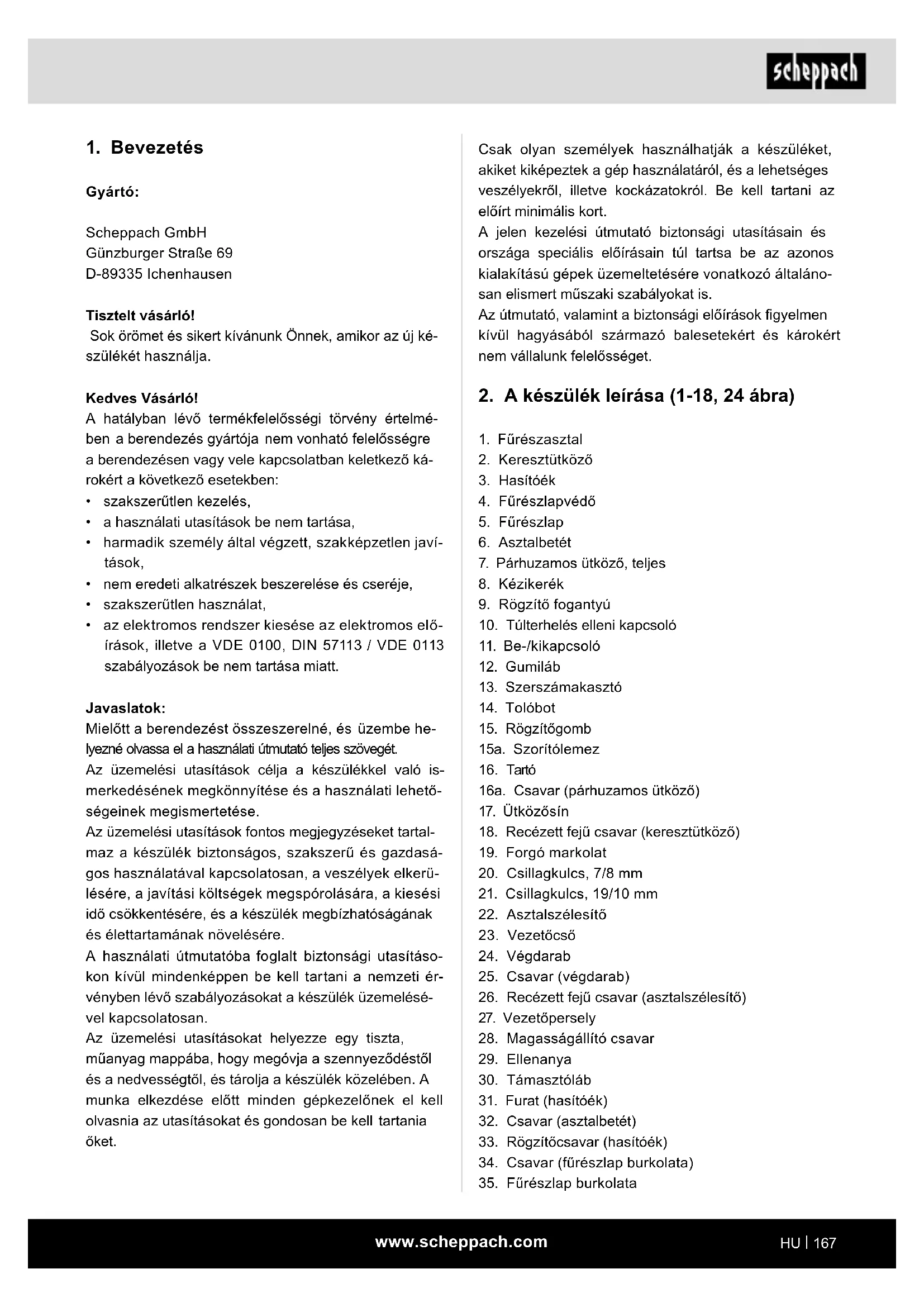 - az elektromos rendszer kiesése az elektromos elő- írások, illetve a VDE 0100, DIN 57113 / VDE 0113 szabályozások be nem tartása miatt. Javaslatok: Mielőtt a berendezést összeszerelné, és üzembe he- lyezné olvassa el a használati útmutató teljes szövegét. Az üzemelési utasítások célja a készülékkel való is- merkedésének megkönnyítése és a használati lehető- ségeinek megismertetése. Az üzemelési utasítások fontos megjegyzéseket tartal- maz a készülék biztonságos, szakszerű és gazdasá- gos használatával kapcsolatosan, a veszélyek elkerü- lésére, a javítási költségek megspórolására, a kiesési idő csökkentésére, és a készülék megbízhatóságának és élettartamának növelésére. A használati útmutatóba foglalt biztonsági utasításo- kon kívül mindenképpen be kell tartani a nemzeti ér- vényben lévő szabályozásokat a készülék üzemelésé- vel kapcsolatosan. Az üzemelési utasításokat helyezze egy tiszta, műanyag mappába, hogy megóvja a szennyeződéstől és a nedvességtől, és tárolja a készülék közelében. A munka elkezdése előtt minden gépkezelőnek el kell olvasnia az utasításokat és gondosan be kell tartania őket.www.scheppach.com