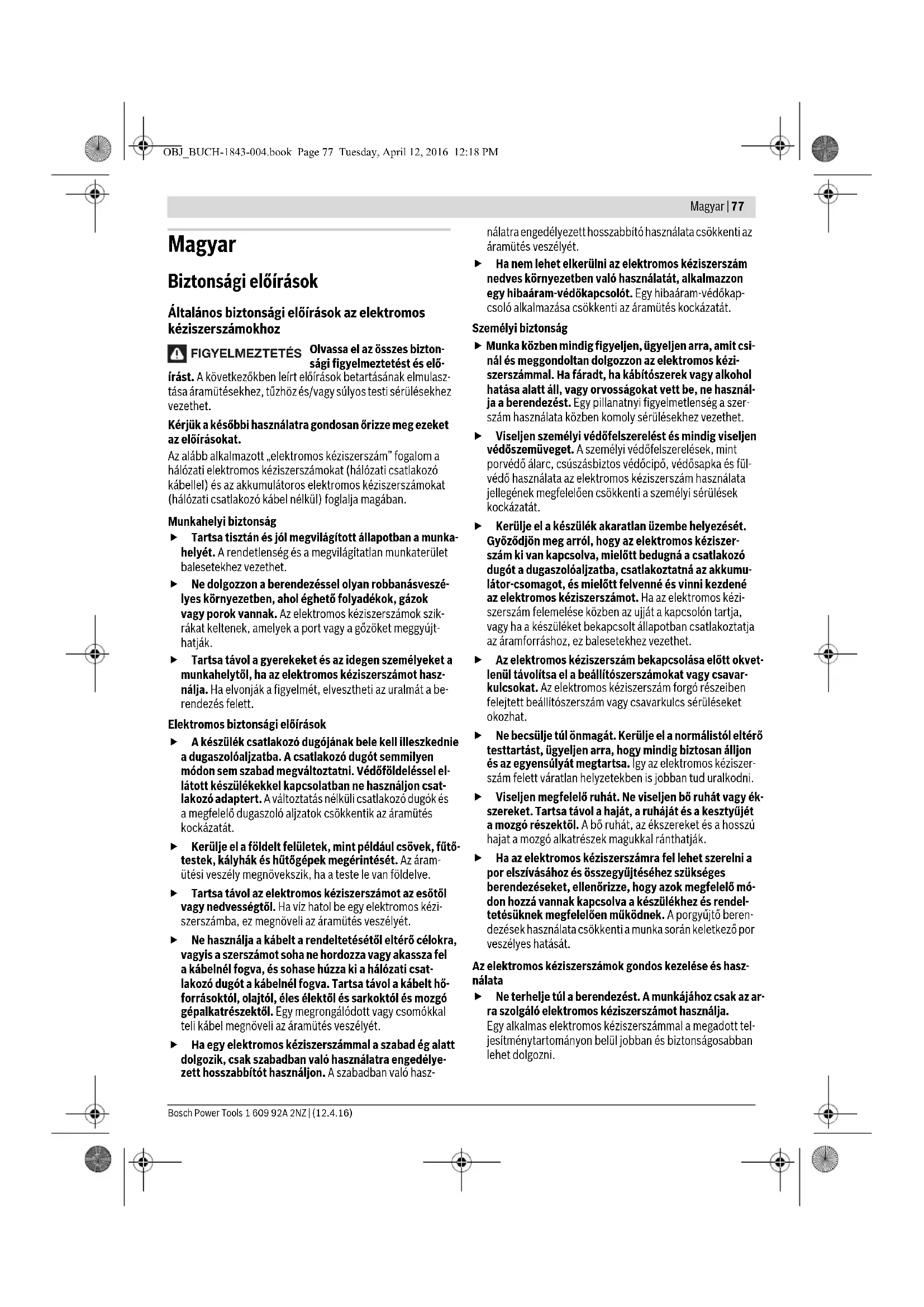 Súly az „EPTA-Procedure 01:2014” (01:2014 EPTA-eljá- rás) szerint kg 3,7 Érintésvédelmi osztály /II Az adatok [U] = 230 V névleges feszültségre vonatkoznak. Ettől eltérő feszültségek esetén és az egyes országok számára készült különleges ki-vitelekben ezek az adatok változhatnak. Henk Becker Executive Vice President Engineering Helmut Heinzelmann Head of Product Certification PT/ETM9 OBJ_BUCH-1843-004.book Page 79 Tuesday, April 12, 2016 12:18 PM80 | Magyar 1 609 92A 2NZ | (12.4.16) Bosch Power Tools A pótfogantyú felszerelése (lásd az „A” ábrát) Az elektromos kéziszerszámot csak az arra felszerelt 4 pótfogantyúval együtt szabad használni. Csavarja be a 4 pótfogantyút a munkának megfelelő helyzet- ben a hajtómű jobb vagy bal oldalába. A pótfogantyú beállítása (lásd a „B” ábrát) A 4 pótfogantyú helyzetét meg lehet változtatni, ha például nehezen hozzáférhető helyen kell munkát végezni. –Oldja ki a 2 rögzítőcsavart. –Forgassa el a 4 pótfogantyút a munkavégzési feltételeknek és az Ön munkavégzési helyzetének megfelelően. – Húzza meg ismét szorosra a 2 rögzítőcsavart. A csiszolószalag behelyezése/kicserélése (lásd a „C” ábrát) –Nyomja el a 7 szorítókart a 10 vezetőgörgő felé. Szükség esetén szerelje le a 9 csiszoló szalagot. – Benyomott 7 szorítókar mellett tegye fel az új 9 csiszoló- szalagot. Ügyeljen arra, hogy a csiszolószalag belső olda- lán és az elektromos kéziszerszám házán található nyilak iránya egybeessen. – Vezesse vissza a 7 szorítókart ismét a kiindulási helyzeté- be. Ügyeljen a 9 csiszolószalag helyes elhelyezkedésére a 8 és 10 vezetőgörgőn. A csiszolószalag kiválasztása A megmunkálásra kerülő anyagnak és a felület kívánt lemun- kálási mélységének megfelelően különböző csiszolószalagok állnak rendelkezésre: Üzemeltetés Üzembe helyezés Ügyeljen a helyes hálózati feszültségre! Az áramforrás feszültségének meg kell egyeznie az elektromos kézi- szerszám típustábláján található adatokkal. A 230 V-os berendezéseket 220 V hálózati feszültségről is szabad üzemeltetni. Be- és kikapcsolás Az elektromos kéziszerszám üzembe helyezéséhez nyomja be és tartsa benyomva a 6 be-/kikapcsolót. A benyomott 6 be-/kikapcsoló reteszeléséhez tolja tovább előre a benyomott 6 be-/kikapcsolót. Az elektromos kéziszerszám kikapcsolásához engedje el a 6 be-/kikapcsolót, illetve, ha az reteszelve van, nyomja be rö- vid időre a 6 be-/kikapcsolót, majd engedje el azt. Az energia megtakarítására az elektromos kéziszerszémot csak akkor kapcsolja be, ha használja. A szalag sebességének előzetes kiválasztása Az anyag megrongálódásának megelőzésére csak az al- kalmazásnak megfelelő szalag sebességgel dolgozzon. Az 5 szalagsebesség előválasztó szabályozókerékkel a szük- séges szalagsebesség üzem közben is megváltoztatható. A szükséges szalagsebesség a megmunkálásra kerülő anyag tulajdonságaitól és a munka egyéb feltételeitől függ, ezt a leg- jobb gyakorlati próbával megállapítani. A flíz szalag használata esetén legfeljebb a 4. fordulat- szám fokozatot állítsa be. Ellenkező esetben a flíz sza- lag túl erősen felforrósodik. Munkavégzési tanácsok A csövek a 8 és 10 vezetőgörgő között kerülnek megmunká- lásra (lásd a D ábrát). Minél kisebb a cső átmérője, annál nagyobb a lehetséges átfo- gási szög (≤270°). A csiszolási lemunkálási teljesítmény és a felület minősége lé- nyegében a csiszolószalag kiválasztásától és az előzetesen beállított szalagsebességtől függ. Lehetőleg csak enyhén nyomja rá a szalagot a munkadarabra, hogy a csiszolószalagok élettartama magasabb legyen. Ha a nyomást túl magasra növeli, a lehordási teljesítmény nem nö- vekszik, hanem csak a csiszolószalag és az elektromos kézi- szerszám használódik el gyorsabban. Mérsékelt előtolással dolgozzon és a csiszolást egymást átfe- dő párhuzamos csíkok végigmunkálásával hajtsa végre. Egy perfekt felület kialakításához a csiszoló szalag kiválasztá- sakor legfeljebb egy szemcseméretet szabad csak kihagyni. Csak eredeti Bosch gyártmányú csiszoló tartozékokat hasz- náljon. Jó csiszolási teljesítményt az elektromos kéziszerszámot kí- mélő használat mellett csak kifogástalan csiszolószalagok al- kalmazásával lehet elérni. Ne fogjon be elektromos kéziszerszámokat a munka- asztalba. A befogott elektromos kéziszerszámok és az éles betétszerszámok súlyos sérüléseket okozhatnak. A csiszolóanyag tárolása A csiszolóanyagot az eredeti csomagolásban, 15 °C – 25 °C szobahőmérsékleten és 40 % – 70 % nedvességtartalmú le- vegőben tárolja. Ne tárolja a csiszolóanyagot betonpadlón, nyitott ablakok és fűtőtestek közelében. Ne törje meg a csiszolószalagokat, mert ezek ellenkező eset- ben használhatatlanná válnak. Karbantartás és szerviz Karbantartás és tisztítás Az elektromos kéziszerszámon végzendő bármely munka megkezdése előtt húzza ki a csatlakozó dugót a dugaszolóaljzatból. Tartsa mindig tisztán az elektromos kéziszerszámot és annak szellőzőnyílásait, hogy jól és biztonságosan dol- gozhasson. Szemcsenagyság Száraz csiszoláshoz és előcsiszoláshoz durva 40, 60 Strukturáláshoz és kisebb egyenetlen- ségek kiegyenlítéséhez közepes 80, 120 Finom strukturáláshoz finom 180 Flíz szalagok OBJ_BUCH-1843-004.book Page 80 Tuesday, April 12, 2016 12:18 PMРусский | 81 Bosch Power Tools 1 609 92A 2NZ | (9.6.16) Az csiszolás során keletkező és az anyaghoz tapadó port egy ecsettel távolítsa el. Ha a csatlakozó vezetéket ki kell cserélni, akkor a cserével csak a magát a Bosch céget, vagy egy Bosch elektromos kézi- szerszám-műhely ügyfélszolgálatát szabad megbízni, nehogy a bi