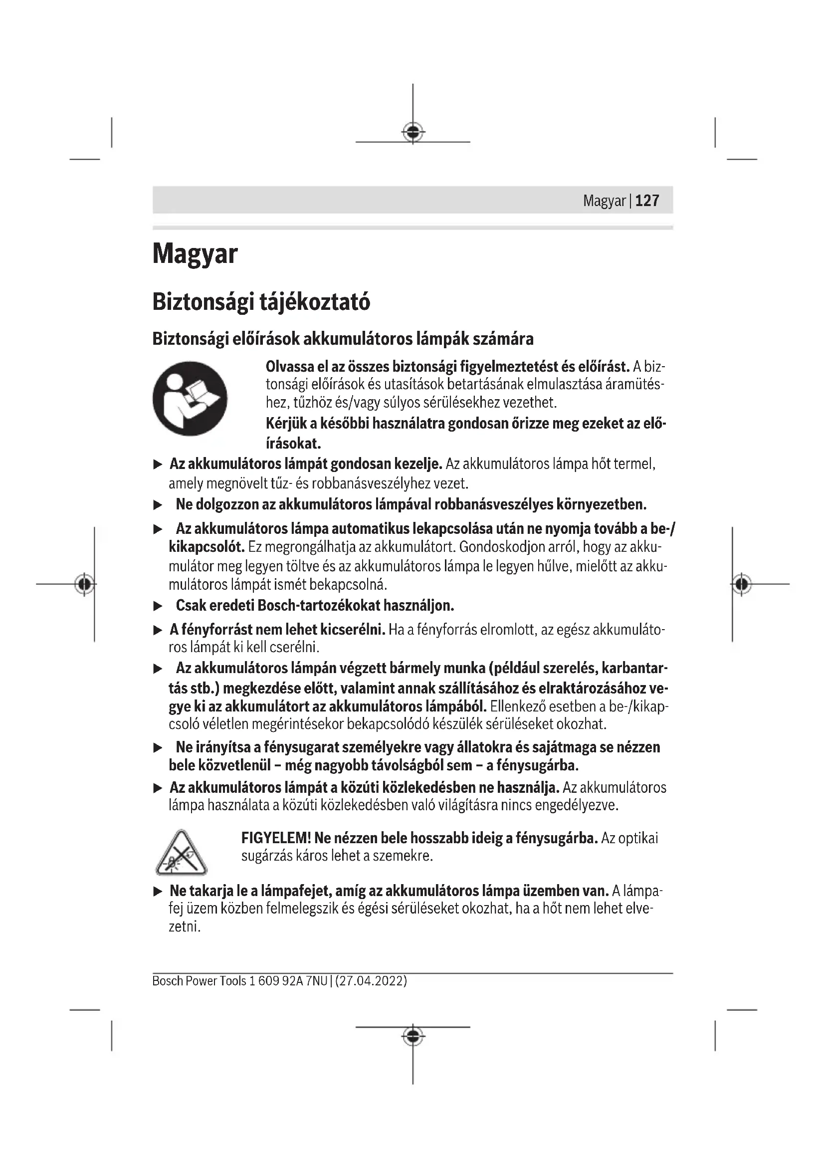 °C –20...+50 Javasolt akkumulátorok GBA 18V... ProCORE18V... Javasolt töltőkészülékek GAL 18... GAX 18... GAL 36... A) <0°C hőmérsékletek esetén korlátozott teljesítmény A megvilágított tárgyak színvisszadása hamis lehet. Összeszerelés Az akkumulátor feltöltése (tartozék) u Csak a Műszaki Adatoknál megadott töltőkészülékeket használja. Csak ezek a töl- tőkészülék vannak pontosan beállítva az Ön akkumulátoros lámpájában alkalmazásra kerülő lithium-ionos-akkumulátorok töltésére. Figyelem: Az akkumulátor részben feltöltve kerül kiszállításra. Az akkumulátor teljes tel- jesítményének biztosítására az első alkalmazás előtt töltse fel teljesen az akkumulátort a töltőkészülékben. A Li‑ion-akkumulátort bármikor fel lehet tölteni, anélkül, hogy ez megrövidítené az élet- tartamát. A töltési folyamat megszakítása nem árt az akkumulátornak. A lithium-ionos-akkumulátort az „Electronic Cell Protection (ECP)“ védi a túl erős kisülés ellen. Kisült akkumulátor esetén az akkumulátoros lámpát egy biztonsági védőkapcsolás lekapcsolja. u Az akkumulátoros lámpa automatikus lekapcsolása után ne nyomja tovább a be-/ kikapcsolót. Ez megrongálhatja az akkumulátort. Gondoskodjon arról, hogy az akku- mulátor meg legyen töltve és az akkumulátoros lámpa le legyen hűlve, mielőtt az akku- mulátoros lámpát ismét bekapcsolná. A (4)akkumulátor eltávolításához nyomja meg a (5)reteszelés feloldó gombot és húzza ki az akkumulátort az akkumulátoros lámpából. Ne erőltesse a kihúzást. Vegye figyelembe a hulladékba való eltávolítással kapcsolatos előírásokat. 1 609 92A 7NU | (27.04.2022) Bosch Power ToolsMagyar | 131 Üzemeltetés Üzembe helyezés Az akkumulátor beszerelése Helyezze be a feltöltött(4)akkumulátort a(3)lámpafejbe, amíg az érezhetően bepattan a helyére és egy síkban felfekszik a lámpafejre. Felállítás Állítsa az akkumulátoros lámpát egy stabil, sík alapra. Ügyeljen arra, hogy a lámpa bizto- san álljon. Be- és kikapcsolás Az akkumulátoros lámpa üzembe helyezéséhez nyomja meg a(2)be-/kikapcsolót. Az akkumulátoros lámpa kikapcsolásához nyomja meg még egyszer a(2)be-/kikapcso- lót. Hőmérsékletfüggő túlterhelés elleni védelem A 60°C megengedett hűtőtest hőmérséklet túllépése esetén az akkumulátoros lámpa 3- szor felvillan majd kikapcsolásra kerül. Várja meg, amíg az akkumulátoros lámpa lehűl, majd ismét kapcsolja be azt. Akkumulátor töltöttségi szint kijelző Az akkumulátor töltési szint kijelző display zöld LED-jei az akkumulátor töltési szintjét mutatják. A töltöttségi szintet biztonsági okokból csak használaton kívüli elektromos ké- ziszerszám esetén lehet lekérdezni. Nyomja meg a vagy a feltöltési szint kijelző gombot, hogy kijelezze a töltési szintet. Erre kivett akkumulátor esetén is van lehetőség. Ha az akkumulátor feltöltési szint kijelző gomb megnyomása után egy LED sem világít, az akkumulátor meghibásodott és ki kell cserélni. Akkumulátor típus: GBA 18V... LED-ek Kapacitás Tartós fény, 3× zöld 60−100% Tartós fény, 2× zöld 30−60% Tartós fény, 1× zöld 5−30% Villogó fény, 1× zöld 0−5% Bosch Power Tools 1 609 92A 7NU | (27.04.2022)132 | Magyar Akkumulátor típus: ProCORE18V... LED-ek Kapacitás Tartós fény, 5× zöld 80−100 % Tartós fény, 4× zöld 60−80 % Tartós fény, 3× zöld 40−60 % Tartós fény, 2× zöld 20−40 % Tartós fény, 1× zöld 5−20 % Villogó fény, 1× zöld 0−5 % Munkavégzési tanácsok Az akkumulátoros lámpa csökkentett fényerővel működik, amikor a maradék világítási időtartam ≤10perc. A lámpafej elfordítása (lásd aAábrát) A(3)lámpafejet 27°-os lépésekben legfeljebb 135°-ra el lehet fordítani. Tartópánt (lásd aBábrát) Az akkumulátoros lámpát a(7)tartópántnál fogva lehet vinni vagy valamilyen tárgyhoz hozzáerősíteni. Karbantartás és szerviz Karbantartás és tisztítás u Az akkumulátoros lámpán végzett bármely munka (például szerelés, karbantar- tás stb.) megkezdése előtt, valamint annak szállításához és elraktározásához ve- gye ki az akkumulátort az akkumulátoros lámpából. Ellenkező esetben a be‑/kikap- csoló véletlen megérintésekor bekapcsolódó készülék sérüléseket okozhat. Az akkumulátoros lámpának nincs szüksége karbantartásra és nem tartalmaz kicserélhe- tő vagy karbantartást igényló alkatrészeket. Az akkumulátor műanyag üvegét csak egy száraz, puha kendővel tisztítsa meg, hogy elke- rülje a megrongálódásokat.Tisztító- vagy oldószereket ne használjon. 1 609 92A 7NU | (27.04.2022) Bosch Power ToolsMagyar | 133 Vevőszolgálat és alkalmazási tanácsadás A vevőszolgálat a terméke javításával és karbantartásával, valamint a pótalkatrészekkel kapcsolatos kérdésekre szívesen válaszol. A pótalkatrészekkel kapcsolatos robbantott ábrák és egyéb információk a következő címen találhatók: www.bosch-pt.com A Bosch Alkalmazási Tanácsadó Team a termékeinkkel és azok tartozékaival kapcsolatos kérdésekben szívesen nyújt segítséget. Ha kérdései vannak vagy pótalkatrészeket szeretne rendelni, okvetlenül adja meg a ter- mék típustábláján található 10‑jegyű cikkszámot. Magyarország Robert Bosch Kft. 1103 Budapest Gyömrői út. 120. A www.bosch-pt.hu oldalon online megrendelheti készülékének javítását. Tel.:+3618798502 Fax: +3618798505 info.bsc@hu.bosch.com www.bosch-pt.hu További szerviz-címek itt találhatók: www.bosch-pt.com/serviceaddresses Szállítás A javasolt lítium-ion akkumulátorokra a veszélyes árukra vonatkozó követelmények érvé- nyesek.A felhasználók az akkumulátorokat a közúti szállításban minden további nélkül szállíthatják. Ha az akkumulátorok szállításával harmadik szem