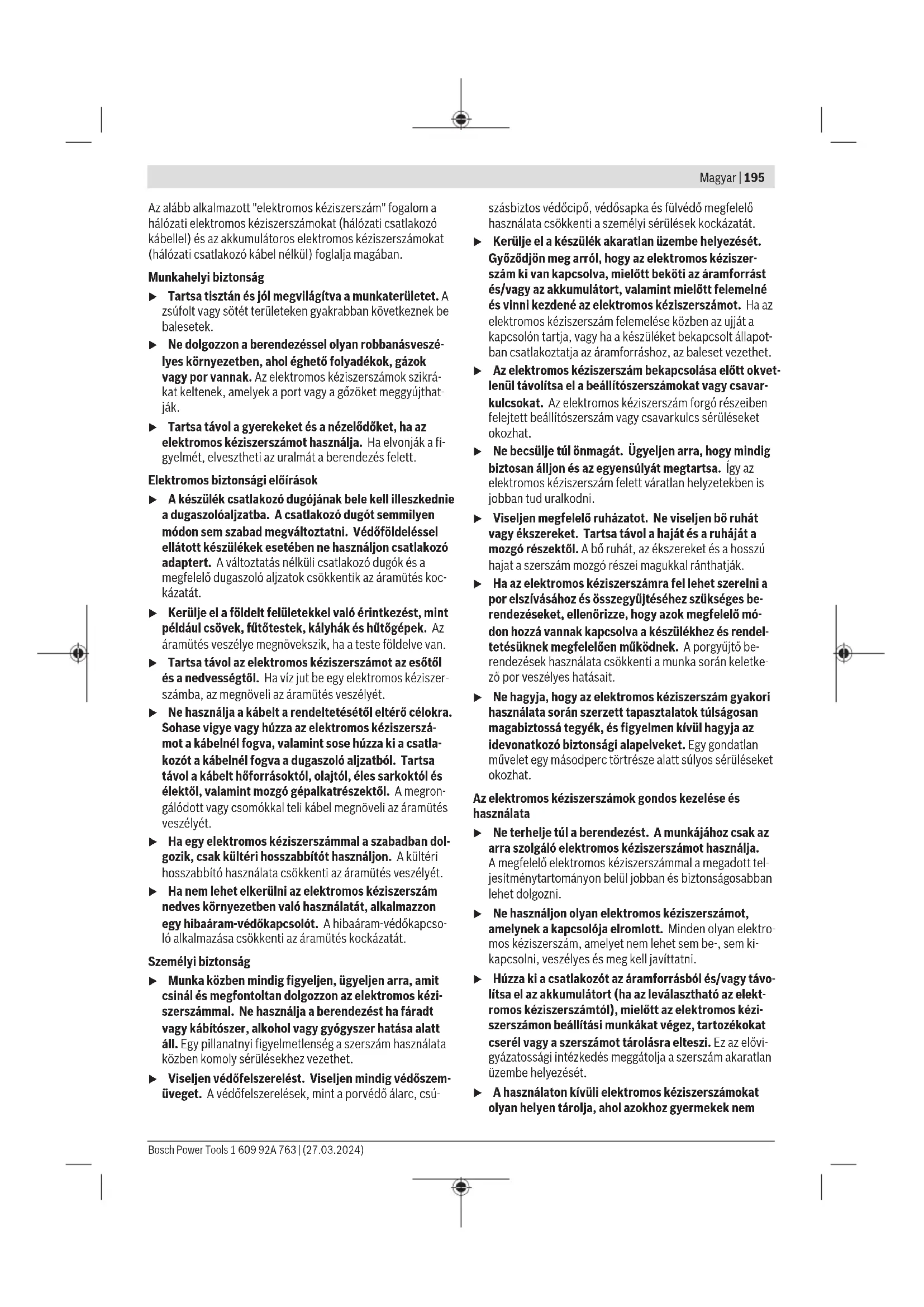125 6 10 22,2 >0 11800 80 125 21 – 22,2 – 11800 80 A hajtóműfej elfordítása (lásd aEábrát) u Az elektromos kéziszerszámon végzendő bármely munka megkezdése előtt húzza ki a csatlakozó dugót a dugaszolóaljzatból. u Minden elektromos kéziszerszámon végzett munka előtt (pl. karbantartás, szerszámcsere stb.) vegye ki az akkumulátort az elektromos kéziszerszámból. Ellen- kező esetben a be‑/kikapcsoló véletlen megérintésekor bekapcsolódó készülék sérüléseket okozhat. A hajtóműfejet 90°-os lépésekben el lehet forgatni. Így a be-/ kikapcsolót különleges munkavégzési esetekhez, például balkezes kezelők számára, egy előnyösebb helyzetbe lehet hozni. Csavarja teljesen ki a 4 csavart(➊). Óvatosan, és anélkül, hogy levenné a házról, forgassa el az új helyzetbe(➋) a haj- tóműfejet. Húzza meg ismét szorosra a 4 csavart(➌). Por- és forgácselszívás Az ólomtartalmú festékrétegek, egyes fafajták, ásványok és fémek pora egészségkárosító hatású lehet. A poroknak a ke- zelő vagy a közelben tartózkodó személyek által történő megérintése vagy belégzése allergikus reakciókat és/vagy a légutak megbetegedését vonhatja maga után. Egyes faporok, például tölgy- és bükkfaporok rákkeltő hatá- súak, főleg ha a faanyag kezeléséhez más anyagokat is fel- használtak (kromát, favédő vegyszerek). A készülékkel az- besztet tartalmazó anyagokat csak szakembereknek szabad megmunkálniuk. – A lehetőségek szerint használjon az anyagnak megfelelő porelszívást. – Gondoskodjon a munkahely jó szellőztetéséről. – Ehhez a munkához célszerű egy P2 szűrőosztályú porvé- dő álarcot használni. A feldolgozásra kerülő anyagokkal kapcsolatban tartsa be az adott országban érvényes előírásokat. u Gondoskodjon arról, hogy a munkahelyén ne gyűlhes- sen össze por. A porok könnyen meggyulladhatnak. Üzemeltetés u Ne terhelje annyira meg az elektromos kéziszerszá- mot, hogy az ettől leálljon. u Az elektromos kéziszerszámon végzendő bármely munka megkezdése előtt húzza ki a csatlakozó dugót a dugaszolóaljzatból. u Minden elektromos kéziszerszámon végzett munka előtt (pl. karbantartás, szerszámcsere stb.) vegye ki az akkumulátort az elektromos kéziszerszámból. Ellen- kező esetben a be‑/kikapcsoló véletlen megérintésekor bekapcsolódó készülék sérüléseket okozhat. u Tartófalakban való vágások esetén legyen óvatos, lásd a „Statikai megjegyzések“ című fejezetet. u Fogja be a munkadarabot, ha az a saját súlyánál fogva nem helyezkedik el biztonságosan. u Magas terhelés után hagyja még néhány percig üresjá- ratban működni az elektromos kéziszerszámot, hogy a betétszerszám lehűljön. u Ne használja az elektromos kéziszerszámot egy dara- boló állvánnyal. u Ne érjen hozzá a csiszoló- és darabolókorongokhoz, amíg le nem hűltek. A korongok a munka során igen erő- sen felforrósodnak. Munkavégzési tanácsok Nagyoló csiszolás u A ragasztott csiszolóeszközök használatával történő nagyoló csiszoláshoz mindig használja a(7)csiszolásra szolgáló védőbúrát. u Sohase használjon hasítókorongokat nagyoló csiszo- láshoz. u A nagyoló csiszolás során a(8)darabolásra szolgáló védőbúra vagy a(7)csiszolásra szolgáló védőbúra az arra felszerelt(9)darabolásra szolgáló fedéllel neki- ütközhet a munkadarabnak és ez ahhoz vezethet, hogy a kezelő elveszti a berendezés feletti uralmát. Nagyoló csiszolásnál a legjobb eredmények eléréséhez 30°– 40° állásszöget használjon. Mérsékelt nyomással mozgassa ide-oda az elektromos kéziszerszámot. Így a munkadarab nem lesz túl forró, nem színeződik el és nem keletkeznek raj- ta barázdák. u A csiszoláshoz és daraboláshoz is engedélyezett ragasz- tott tárcsák alkalmazása esetén a(8)darabolásra szolgáló védőbúrát, illetve a(7)csiszolásra szolgáló védőbúrát az arra felszerelt(9)darabolásra szolgáló fedéllel együtt kell használni. Felületek csiszolása legyezős csiszolókoronggal u A legyezős csiszolókoronggal végzendő csiszolási munkákhoz használja mindig a(7)csiszolásra szolgáló védőbúrát. A legyezős csiszolókoronggal (külön tartozék) homorú és domború felületeket és profilokat is meg lehet munkálni. A legyezős csiszolókorongoknak lényegesen nagyobb az élet- tartama, alacsonyabb a zajszintje és alacsonyabb csiszolási 1 609 92A 763 | (27.03.2024) Bosch Power ToolsMagyar | 205 hőmérsékletekhez vezetnek, mint a szokásos csiszolókoron- gok. Felületek csiszolása a csiszolótányérral u A (23) gumi csiszolótányérral végzendő munkákhoz mindig szerelje fel a (22) kézvédőt. A csiszolótányérral végzett csiszolást védőbúra nélkül is vég- re szabad hajtani. A szerelési sorrend az ábrás oldalon látható. Csavarozza fel a helyére és a kétkörmös kulccsal feszesen húzza meg a(25)hengeres anyát. Csészealakú kefe / Kefés tárcsa / Kúp alakú kefe u A kefés tárcsával történő megmunkáláshoz mindig használja a(7)csiszolásra szolgáló védőbúrát. A csé- sze alakú vagy a kúp alakú kefét védőbúra nélkül is szabad használni. u A csésze alakú vagy a kúp alakú tárcsával végzendő munkákhoz mindig szerelje fel a (22)kézvédőt. u A kefés tárcsa használatakor a tárcsa drótjai könnyen beleakadhatnak a védőbúrába és elszakadhatnak, ha a megengedettnél nagyobb átmérőjű kefés tárcsa kerül alkalmazásra. A szerelési sorrend az ábrás oldalon látható. Az M14 menettel ellátott csésze alakú kefét / kúp alakú ke- fét / kefés tárcsát annyira rá kell tudni csavarozni a csiszoló- tengelyre, hogy az a csiszolótengely menetének a végénél szorosan felfeküdjön a csiszolótengely karimájára. Húzza meg egy villáskulccsal szorosra a csésze alakú kefét/ a kúp alakú k