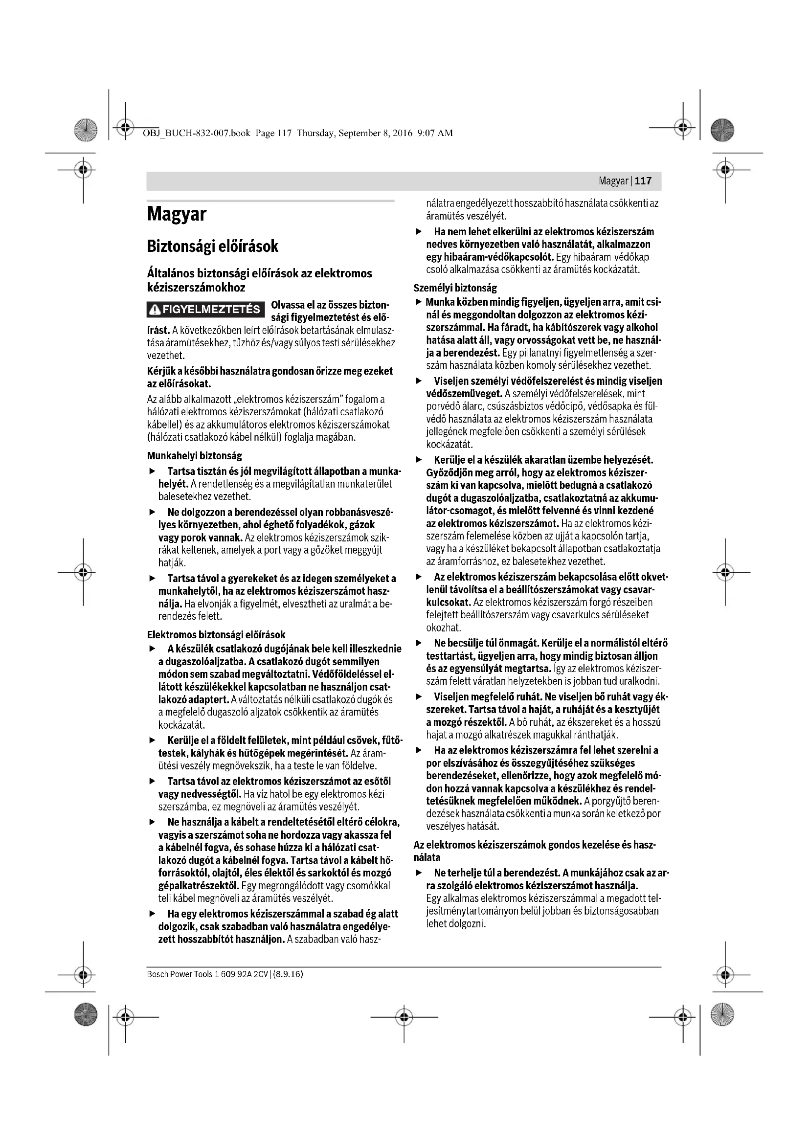 dĺžky skrutky. Upozornenie: Dávajte pozor na to, aby sa do ručného elek- trického náradia nedostali žiadne drobné kovové predmety. Sponka na upnutie na remeň Pomocou sponky na upnutie na remeň 4 si môžete zavesiť to- to ručné elektrické náradie napr. na opasok. V takom prípade budete mať obe ruky voľné a ručné elektrické náradie budete mať stále v pohotovosti. Pokyny pre optimálne zaobchádzanie s akumulátorom Chráňte akumulátor pred vlhkosťou a vodou. Akumulátor skladujte iba pri rozsahu teploty od –20 °C do 50 °C. Nenechávajte napríklad akumulátor v lete položený v automobile. Občas prečistite vetracie štrbiny akumulátora čistým jemným a suchým štetcom. Výrazne skrátená prevádzková doba akumulátora po nabití signalizuje, že akumulátor je opotrebovaný a treba ho vymeniť za nový. Dodržiavajte pokyny na likvidáciu. Údržba a servis Údržba a čistenie Vyberte akumulátor pred každou prácou na elektric- kom náradí (napr. údržba, výmena nástroja a pod.) ako aj pri preprave a úschove ručného elektrického nára- dia. V prípade neúmyselného zapnutia vypínača hrozí ne- bezpečenstvo poranenia. Ručné elektrické náradie a jeho vetracie štrbiny udržia- vajte vždy v čistote, aby ste mohli pracovať kvalitne a bezpečne. Výmena uhlíkov (pozri obrázok E) Kontrolujte dĺžku uhlíkov približne každé 2–3 mesiace a v prí- pade potreby uhlíky vymeňte za nové. Nikdy nevymieňajte iba jediný uhlík! Upozornenie: Používajte iba uhlíky zakúpené prostredníc- tvom firmy Bosch, ktoré sú určené pre Váš produkt. – Uvoľnite kryty 16 pomocou nejakého vhodného skrutkova- ča. –Uhlíky 15, ktoré sa nachádzajú pod tlakom pružín, vymeň- te a kryty opäť naskrutkujte na pôvodné miesto. Servisné stredisko a poradenstvo pri používaní Servisné stredisko Vám odpovie na otázky týkajúce sa opravy a údržby Vášho produktu ako aj náhradných súčiastok. Rozlo- žené obrázky a informácie k náhradným súčiastkam nájdete aj na web-stránke: www.bosch-pt.com Tím poradcov Bosch Vám s radosťou poskytne pomoc pri otázkach týkajúcich sa našich produktov a ich príslušenstva. Pri všetkých dopytoch a objednávkach náhradných súčiastok uvádzajte bezpodmienečne 10-miestne vecné číslo uvedené na typovom štítku výrobku. Slovakia Na www.bosch-pt.sk si môžete objednať opravu vášho stroja alebo náhradné diely online. Tel.: (02) 48 703 800 Fax: (02) 48 703 801 E-Mail: servis.naradia@sk.bosch.com www.bosch.sk Transport Priložené lítiovo-iónové akumulátory podliehajú požiadavkám pre transport nebezpečného nákladu. Tieto akumulátory smie používateľ náradia prepravovať po cestách bez ďalších opat- rení. Pri zasielaní tretími osobami (napr.: leteckou dopravou alebo prostredníctvom špedície) treba rešpektovať osobitné požia- davky na obaly a označenie. V takomto prípade treba pri príp- rave zásielky bezpodmienečne konzultovať s expertom pre prepravu nebezpečného tovaru. Akumulátory zasielajte iba vtedy, ak nemajú poškodený obal. Otvorené kontakty prelepte a akumulátor zabaľte tak, aby sa v obale nemohol posúvať. Rešpektujte aj prípadné doplňujúce národné predpisy. Likvidácia Ručné elektrické náradie, príslušenstvo a obal treba dať na recykláciu zodpovedajúcu ochrane životného prostredia. Neodhadzujte ručné elektrické náradie ani akumulátory/baté- rie do komunálneho odpadu! Len pre krajiny EÚ: Podľa Európskej smernice 2012/19/EÚ sa musí nepoužiteľné ručné elektrické náradie (elektrospotrebiče) a podľa európskej smernice 2006/66/ES sa musia poškode- né alebo opotrebované akumulátory/baté- rie zbierať separovane a treba ich dávať na recykláciu zodpovedajúcu ochrane životné- ho prostredia. Akumulátory/batérie: Li-Ion: Všimnite si láskavo pokyny v odseku „Transport“, strana 116. Zmeny vyhradené. OBJ_BUCH-832-007.book Page 116 Thursday, September 8, 2016 9:07 AMMagyar | 117 Bosch Power Tools 1 609 92A 2CV | (8.9.16) Magyar Biztonsági előírások Általános biztonsági előírások az elektromos kéziszerszámokhoz Olvassa el az összes bizton- sági figyelmeztetést és elő- írást. A következőkben leírt előírások betartásának elmulasz- tása áramütésekhez, tűzhöz és/vagy súlyos testi sérülésekhez vezethet. Kérjük a későbbi használatra gondosan őrizze meg ezeket az előírásokat. Az alább alkalmazott „elektromos kéziszerszám” fogalom a hálózati elektromos kéziszerszámokat (hálózati csatlakozó kábellel) és az akkumulátoros elektromos kéziszerszámokat (hálózati csatlakozó kábel nélkül) foglalja magában. Munkahelyi biztonság Tartsa tisztán és jól megvilágított állapotban a munka- helyét. A rendetlenség és a megvilágítatlan munkaterület balesetekhez vezethet. Ne dolgozzon a berendezéssel olyan robbanásveszé- lyes környezetben, ahol éghető folyadékok, gázok vagy porok vannak. Az elektromos kéziszerszámok szik- rákat keltenek, amelyek a port vagy a gőzöket meggyújt- hatják. Tartsa távol a gyerekeket és az idegen személyeket a munkahelytől, ha az elektromos kéziszerszámot hasz- nálja. Ha elvonják a figyelmét, elvesztheti az uralmát a be- rendezés felett. Elektromos biztonsági előírások A készülék csatlakozó dugójának bele kell illeszkednie a dugaszolóaljzatba. A csatlakozó dugót semmilyen módon sem szabad megváltoztatni. Védőföldeléssel el- látott készülékekkel kapcsolatban ne használjon csat- lakozó adaptert. A változtatás nélküli csatlakozó dugók és a megfelelő dugaszoló aljzatok csökkentik az áramütés kockázatát. Kerülje el a földelt felületek, mint például csövek, fűtő- testek, kályhák és hűtőgépek megérintését. Az áram- ütési veszély megnövekszik, ha a teste le van földelve. Tartsa távol az elektromos kézisze