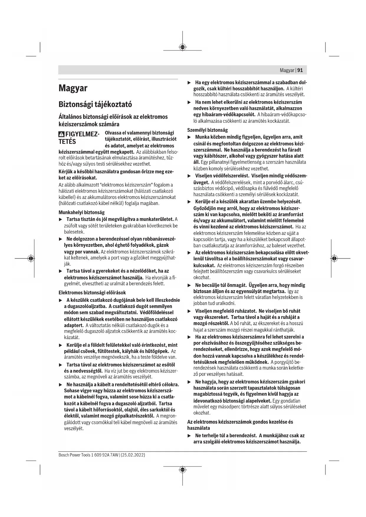 0,7 Hliník 200 2,0 Mastenie/chladenie razníka Aby ste predĺžili životnosť razníka(8), používajte mazivo sdobrou chladiacou schopnosťou (napr. rezný olej). Na hornú stranu plechu naneste pozdĺž plánovanej línie rezu čiaru maziva. Rezanie podľa nárysu alebo pomocou šablóny Rovné rezy sa dajú robiť ľahšie vtedy, keď vediete elektrické náradie pozdĺž pravítka. Kontúry možno rezať vedením elektrického náradia pozdĺž šablóny. Pri vnútorných výrezoch je potrebné najprv urobiť otvor spriemerom 22mm. Tepelná ochrana proti preťaženiu Pri používaní vsúlade surčením nemôže dôjsť kpreťaženiu náradia. Pri príliš intenzívnom zaťažovaní alebo nedodržaní prípustného teplotného rozsahu akumulátora sa zníži počet zdvihov alebo sa elektrické náradie vypne. Vprípade zníže- nia počtu zdvihov bude elektrické náradie znovu pracovať splným počtom zdvihov až po dosiahnutí prípustnej teploty Bosch Power Tools 1 609 92A 7AW | (25.02.2022)90 | Slovenčina akumulátora. Pri automatickom vypnutí elektrické náradie vypnite, nechajte ochladnúť akumulátor aelektrické náradie opäť zapnite. Údržba aservis Údržba ačistenie u Pred všetkými prácami na elektrickom náradí (naprí- klad údržba, výmena nástroja apodobne), ako aj pri jeho preprave auskladnení vyberte akumulátor zelektrického náradia. Vprípade neúmyselného aktivo- vania vypínača hrozí nebezpečenstvo poranenia. u Elektrické náradie ajeho vetracie štrbiny udržiavajte vždy včistote, aby ste mohli pracovať dobre abezpeč- ne. Razník(8) amatricu(9) vyčistite anaolejujte každé 3 pre- vádzkové hodiny. Vprípade opotrebovania zavčasu vymeňte razník aj matricu, pretože len ostré nástroje zabezpečujú dobrý rezací výkon ašetria ručné elektrické náradie. Razník(8) amatrica(9) sa nesmú dodatočne brúsiť. Výmena matrice Vyskrutkujte ryhovanú skrutku(11) zdržiaka matrice(7). Vyberte matricu(9). Vprípade potreby vyčistite držiak matrice(7). Do držiaka matrice nasaďte novú, dobre naolejovanú matricu(9). Dá- vajte pritom pozor na vyrovnanie sploštenej strany. Opäť zaskrutkujte ryhovanú skrutku(11) snasadeným gu- movým krúžkom(10). Utiahnite skrutku proti odporu gumo- vého krúžku (3−4Nm) pomocou kľúča svnútorným šesť- hranom. Výmena razníka Povoľte skrutku(4) držiaka matrice avytiahnite držiak matrice(7) úplne zkrytu. Odsuňte razník(8) zupnutia nabok avytiahnite ho dolu. Do drážky upnutia nasaďte nový, dobre naolejovaný razník(8) avycentrujte ho. Opatrne zasuňte držiak matrice(7) cez razník naspäť do krytu. Otočte držiak matrice podľa želaného smeru rezu do jednej ztroch možných polôh. Skrutku(4) držiaka matrice dobre utiahnite. Zákaznícka služba aporadenstvo ohľadom použitia Servisné stredisko Vám odpovie na otázky týkajúce sa opravy aúdržby Vášho produktu ako aj náhradných dielov. Rozkladové výkresy ainformácie onáhradných dieloch náj- dete tiež na: www.bosch-pt.com Vprípade otázok týkajúcich sa našich výrobkov apríslušen- stva Vám ochotne pomôže poradenský tím Bosch. Vprípade akýchkoľvek otázok aobjednávok náhradných dielov uvádzajte bezpodmienečne 10‑miestne vecné číslo uvedené na typovom štítku výrobku. Slovakia Na www.bosch-pt.sk si môžete objednať opravu vášho stroja alebo náhradné diely online. Tel.: +421 2 48 703 800 Fax: +421 2 48 703 801 E-Mail: servis.naradia@sk.bosch.com www.bosch-pt.sk Ďalšie adresy servisov nájdete na: www.bosch-pt.com/serviceaddresses Transport Odporúčané lítiovo-iónové akumulátory podliehajú požiadavkám na transport nebezpečného nákladu. Tieto aku- mulátory smie používateľ náradia prepravovať po cestách bez ďalších opatrení. Pri zasielaní tretími osobami (napr.: leteckou dopravou alebo prostredníctvom špedície) treba rešpektovať osobitné požiadavky na obaly aoznačenie. Vtakomto prípade treba pri príprave zásielky bezpodmienečne konzultovať sodborní- kom na prepravu nebezpečného tovaru. Akumulátory zasielajte iba vtedy, ak nemajú poškodený obal. Otvorené kontakty prelepte aakumulátor zabaľte tak, aby sa vobale nemohol posúvať. Rešpektujte aj prípadné doplňujú- ce národné predpisy. Likvidácia Ručné elektrické náradie, príslušenstvo aobal treba dať na recykláciu zodpovedajúcu ochrane životného prostredia. Neodhadzujte ručné elektrické náradie ani aku- mulátory/batérie do komunálneho odpadu! Len pre krajinyEÚ: Podľa európskej smernice 2012/19/EÚ oodpade zelektrických aelektronických zariadení apodľa jej trans- pozície vnárodnom práve sa musí už nepoužiteľné elektrické náradie a, podľa európskej smernice 2006/66/ES, po- škodené alebo vybité akumulátory/batérie zbierať separova- ne aodovzdať na recykláciu vsúlade sochranou životného prostredia. Pri nesprávnej likvidácii môžu mať staré elektrické aelektro- nické zariadenia kvôli možnej prítomnosti nebezpečných látok škodlivý vplyv na životné prostredie aľudské zdravie. Akumulátory/batérie: Li-Ion: Dodržujte pokyny uvedené včasti Transport (pozri „Trans- port“, Stránka90). 1 609 92A 7AW | (25.02.2022) Bosch Power ToolsMagyar | 91 Magyar Biztonsági tájékoztató Általános biztonsági előírások az elektromos kéziszerszámok számára FIGYELMEZ- TETÉS Olvassa el valamennyi biztonsági tájékoztatót, előírást, illusztrációt és adatot, amelyet az elektromos kéziszerszámmal együtt megkapott. Az alábbiakban felso- rolt előírások betartásának elmulasztása áramütéshez, tűz- höz és/vagy súlyos testi sérülésekhez vezethet. Kérjük a későbbi használatra gondosan őrizze meg eze- ket az előírásokat. Az alább alkalmazott "elektromos kéziszerszám" fogalom a hálózati elektromos kéziszerszámokat (hálózati csatlakozó kábellel) és az akkumulátoros elektromos