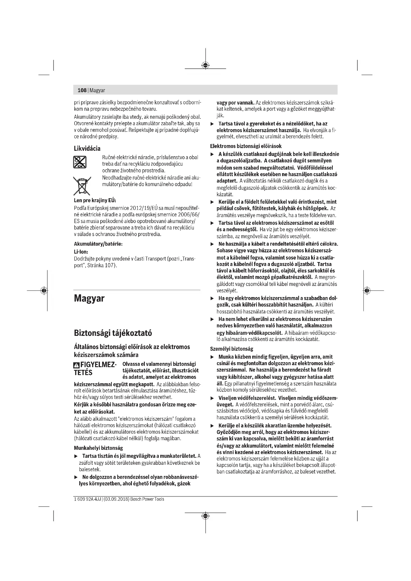M6 2.71 3.61 4.52 4.8 5.42 6.02 7.22 8.13 9.7 13.6 16.2 M8 6.57 8.7 11 11.6 13.1 14.6 17.5 19.7 23 33 39 M10 13 17.5 22 23 26 29 35 39 47 65 78 M12 22.6 30 37.6 40 45 50 60 67 80 113 135 M14 36 48 60 65 72 79 95 107 130 180 215 M16 55 73 92 98 110 122 147 165 196 275 330 Tipy Pred skrutkovaním väčších adlhších skrutiek do tvrdých materiálov by ste mali vrtákom spriemerom rovným jadru závitu skrutky predvŕtať otvor do 2/3 dĺžky skrutky. Upozornenie: Dávajte pozor na to, aby sa do elektrického náradia nedostali drobné kovové predmety. Spona na opasok (pozri obrázok E) Pomocou spony na opasok (17) si môžete zavesiť elektrické náradie napr. na opasok. Vtakom prípade budete mať obe ruky voľné aručné elektrické náradie budete mať stále vpo- hotovosti. Farebná spona (pozri obrázok F) Pomocou farebnej spony (18) môžete elektrické náradie in- dividuálne označiť. Upozornenia týkajúce sa optimálneho zaobchádzania sakumulátorom Chráňte akumulátor pred vlhkosťou avodou. Akumulátor skladujte iba pri teplote vrozsahu od -20°C do 50°C. Nenechávajte akumulátor napríklad vlete položený vautomobile. Príležitostne vyčistite vetracie štrbiny akumulátora čistým, mäkkým asuchým štetcom. Výrazne skrátená doba prevádzky akumulátora po nabití sig- nalizuje, že akumulátor je opotrebovaný atreba ho vymeniť za nový. Dodržiavajte upozornenia týkajúce sa likvidácie. Údržba aservis Údržba ačistenie u Pred všetkými prácami na elektrickom náradí (naprí- klad údržba, výmena nástroja apodobne), ako aj pri jeho preprave auskladnení vyberte akumulátor zelektrického náradia. Vprípade neúmyselného aktivo- vania vypínača hrozí nebezpečenstvo poranenia. u Elektrické náradie ajeho vetracie štrbiny udržiavajte vždy včistote, aby ste mohli pracovať dobre abezpeč- ne. Zákaznícka služba aporadenstvo ohľadom použitia Servisné stredisko Vám odpovie na otázky týkajúce sa opravy aúdržby Vášho produktu ako aj náhradných dielov. Rozkladové výkresy ainformácie onáhradných dieloch náj- dete tiež na: www.bosch-pt.com Vprípade otázok týkajúcich sa našich výrobkov apríslušen- stva Vám ochotne pomôže poradenský tím Bosch. Vprípade akýchkoľvek otázok aobjednávok náhradných súčiastok uvádzajte bezpodmienečne 10‑miestne vecné číslo uvedené na typovom štítku výrobku. Slovakia Na www.bosch-pt.sk si môžete objednať opravu vášho stroja alebo náhradné diely online. Tel.: +421 2 48 703 800 Fax: +421 2 48 703 801 E-Mail: servis.naradia@sk.bosch.com www.bosch-pt.sk Transport Priložené lítiovo-iónové akumulátory podliehajú požiadav- kám na transport nebezpečného nákladu. Tieto akumulátory smie používateľ náradia prepravovať po cestách bez ďalších opatrení. Pri zasielaní tretími osobami (napr.: leteckou dopravou alebo prostredníctvom špedície) treba rešpektovať osobitné požiadavky na obaly aoznačenie. Vtakomto prípade treba Slovenčina | 107 Bosch Power Tools 1 609 92A 4JJ | (03.09.2018)108 | Magyar 1 609 92A 4JJ | (03.09.2018) Bosch Power Tools pri príprave zásielky bezpodmienečne konzultovať sodborní- kom na prepravu nebezpečného tovaru. Akumulátory zasielajte iba vtedy, ak nemajú poškodený obal. Otvorené kontakty prelepte aakumulátor zabaľte tak, aby sa vobale nemohol posúvať. Rešpektujte aj prípadné doplňujú- ce národné predpisy. Likvidácia Ručné elektrické náradie, príslušenstvo aobal treba dať na recykláciu zodpovedajúcu ochrane životného prostredia. Neodhadzujte ručné elektrické náradie ani aku- mulátory/batérie do komunálneho odpadu! Len pre krajinyEÚ: Podľa Európskej smernice 2012/19/EÚ sa musí nepoužiteľ- né elektrické náradie apodľa európskej smernice 2006/66/ ES sa musia poškodené alebo opotrebované akumulátory/ batérie zbierať separovane atreba ich dávať na recykláciu vsúlade sochranou životného prostredia. Akumulátory/batérie: Li-Ion: Dodržujte pokyny uvedené včasti Transport (pozri „Trans- port“, Stránka107). Magyar Biztonsági tájékoztató Általános biztonsági előírások az elektromos kéziszerszámok számára FIGYELMEZ- TETÉS Olvassa el valamennyi biztonsági tájékoztatót, előírást, illusztrációt és adatot, amelyet az elektromos kéziszerszámmal együtt megkapott. Az alábbiakban felso- rolt előírások betartásának elmulasztása áramütéshez, tűz- höz és/vagy súlyos testi sérülésekhez vezethet. Kérjük a későbbi használatra gondosan őrizze meg eze- ket az előírásokat. Az alább alkalmazott "elektromos kéziszerszám" fogalom a hálózati elektromos kéziszerszámokat (hálózati csatlakozó kábellel) és az akkumulátoros elektromos kéziszerszámokat (hálózati csatlakozó kábel nélkül) foglalja magában. Munkahelyi biztonság u Tartsa tisztán és jól megvilágítva a munkaterületet. A zsúfolt vagy sötét területeken gyakrabban következnek be balesetek. u Ne dolgozzon a berendezéssel olyan robbanásveszé- lyes környezetben, ahol éghető folyadékok, gázok vagy por vannak. Az elektromos kéziszerszámok szikrá- kat keltenek, amelyek a port vagy a gőzöket meggyújthat- ják. u Tartsa távol a gyerekeket és a nézelődőket, ha az elektromos kéziszerszámot használja. Haelvonják a fi- gyelmét, elvesztheti az uralmát a berendezés felett. Elektromos biztonsági előírások u A készülék csatlakozó dugójának bele kell illeszkednie a dugaszolóaljzatba. A csatlakozó dugót semmilyen módon sem szabad megváltoztatni. Védőföldeléssel ellátott készülékek esetében ne használjon csatlakozó adaptert. Aváltoztatás nélküli csatlakozó dugók és a megfelelő dugaszoló aljzatok csökkentik az áramütés koc- kázatát. u Kerülje el a földelt felületekkel való érintkezést, mint például csövek, fűtőtestek, kályhák és hűtőgépek. Az áramütés veszélye megnöve