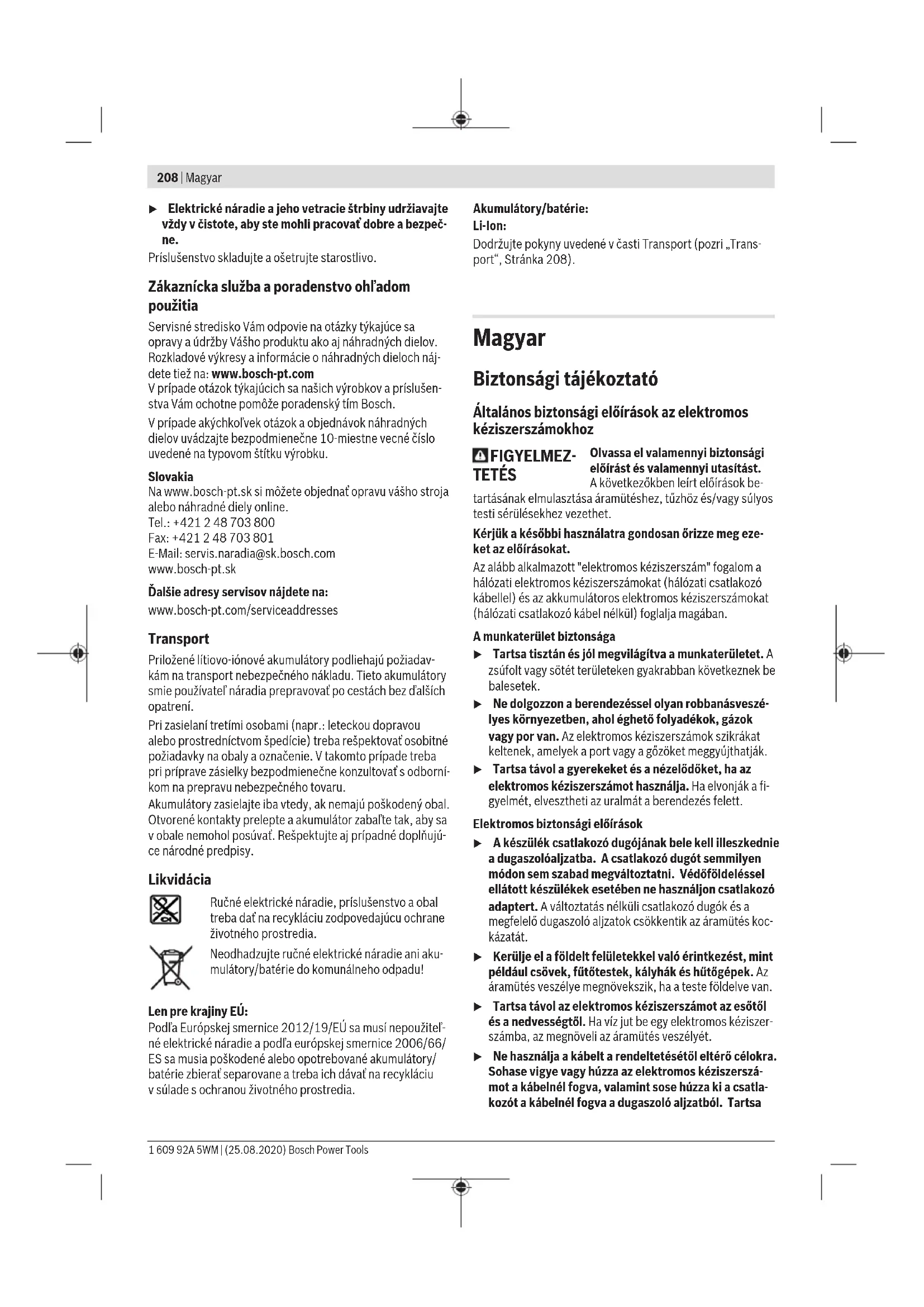 ] [m/s] 125 7 22,2 9000 80 125 – – 9000 80 75 30 M 14 9000 45 82 – M 14 9000 80 A hajtóműfej elforgatása (GWS 18V-10 PC) u Az elektromos kéziszerszámon végzendő minden munka (például karbantartás, szerszámcsere, stb.) megkezdése előtt, valamint szállításhoz és tároláshoz Bosch Power Tools 1 609 92A 5WM | (25.08.2020)218 | Magyar vegye ki az akkumulátort az elektromos kéziszerszám- ból. Ellenkező esetben a be‑/kikapcsoló véletlen megérin- tésekor bekapcsolódó készülék sérüléseket okozhat. A hajtóműfejet 90°-os lépé- sekben el lehet forgatni. Így a be-/kikapcsolót különle- ges munkavégzési esetek- hez, például balkezes keze- lők számára, egy előnyö- sebb helyzetbe lehet hozni. Teljesen csavarja ki a 4 csa- vart. Óvatosan, és anélkül, hogy levenné a házról, for- gassa el az új helyzetbe a hajtóműfejet. Húzza meg ismét szo- rosra a 4 csavart. Por- és forgácselszívás Az ólomtartalmú festékrétegek, egyes fafajták, ásványok és fémek pora egészségkárosító hatású lehet. A poroknak a ke- zelő vagy a közelben tartózkodó személyek által történő megérintése vagy belégzése allergikus reakciókhoz és/vagy a légutak megbetegedését vonhatja maga után. Egyes faporok, például tölgy- és bükkfaporok rákkeltő hatá- súak, főleg ha a faanyag kezeléséhez más anyagok is vannak bennük (kromát, favédő vegyszerek). A készülékkel azbesz- tet tartalmazó anyagokat csak szakembereknek szabad meg- munkálniuk. – Gondoskodjon a munkahely jó szellőztetéséről. – Ehhez a munkához célszerű egy P2 szűrőosztályú porvé- dő álarcot használni. A feldolgozásra kerülő anyagokkal kapcsolatban tartsa be az adott országban érvényes előírásokat. u Gondoskodjon arról, hogy a munkahelyén ne gyűlhes- sen össze por. A porok könnyen meggyulladhatnak. Üzemeltetés Üzembe helyezés Az akkumulátor beszerelése Tolja be a megtöltött (8) akkumulátort elölről az elektromos kéziszerszám lábrészébe, amíg az akkumulátor biztonságo- san reteszelésre kerül. Be- és kikapcsolás Az elektromos kéziszerszám üzembe helyezéséhez tolja előre a (10) reteszelés feloldó kart, majd nyomja fel a (6) be-/kikapcsolót. Az elektromos kéziszerszám kikapcsolásához eressze el a (6) be-/kikapcsolót. u Minden használat előtt ellenőrizze a csiszolószerszá- mokat. Győződjön meg arról, hogy a csiszolószerszám helyesen van felszerelve és szabadon forog. Hajtson végre egy terhelés nélküli, legalább 1 perces próbafu- tást. Megrongálódott, nem kerek, vagy berezgő csi- szolószerszámokat ne használjon. A megrongálódott csiszolószerszámok széttörhetnek és sérüléseket okoz- hatnak. Visszarugási kikapcsolás Az elektromos kéziszerszám hirtelen visszarú- gásakor, például daraboló vágásnál egy leblok- kolás esetén, a motor áramellátását a rendszer elektronikus úton megszakítja. Ekkor a (4) munkahely megvilágító lámpa fehér színben, a (37) állapot kijelző pedig piros színben villog. Az ismételt üzembe helyezéshez hozza a (6) be-/kikapcsolót kikapcsolt helyzetbe és kapcsolja ismét be az elektromos ké- ziszerszámot. Újraindulás elleni védelem Az újraindulás elleni védelem az áramellátás megszakítása majd helyreállítása esetén meggátolja az elektromos kézi- szerszám akaratlan újraindulását. Ha az újraindulás elleni védelem aktiválva van, a (37) állapot kijelző piros színben villog. Az ismételt üzembe helyezéshez hozza a (6) be-/kikapcso- lót a kikapcsolt helyzetbe, majd ismét kapcsolja be az elekt- romos kéziszerszámot. Felhasználó interfész (lásd a D ábrát) A (5) felhasználó interfész a fordulatszám-előválasztásra, va- lamint az elektromos kéziszerszám állapotának kijelzésére szolgál. Fordulatszám-előválasztás (GWS 18V-10 PSC) A (36) fordulatszám előválasztó gombbal a szükséges fordulatszámot üzem közben is ki lehet jelölni. Az alábbi táblázatban ta- lálható adatok javasolt értékek. Anyag Alkalmazás betétszerszám Fordulatszám-fokozat választás