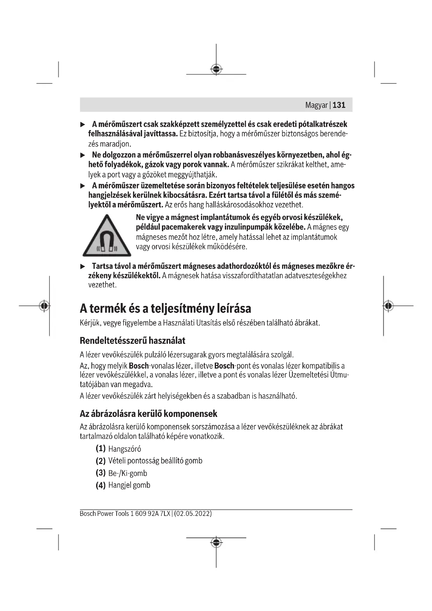 1 609 92A 7LX | (02.05.2022) Bosch Power ToolsMagyar | 133 Lézer vevőegység LR 7 Vételi szög 90° Vételi pontosság