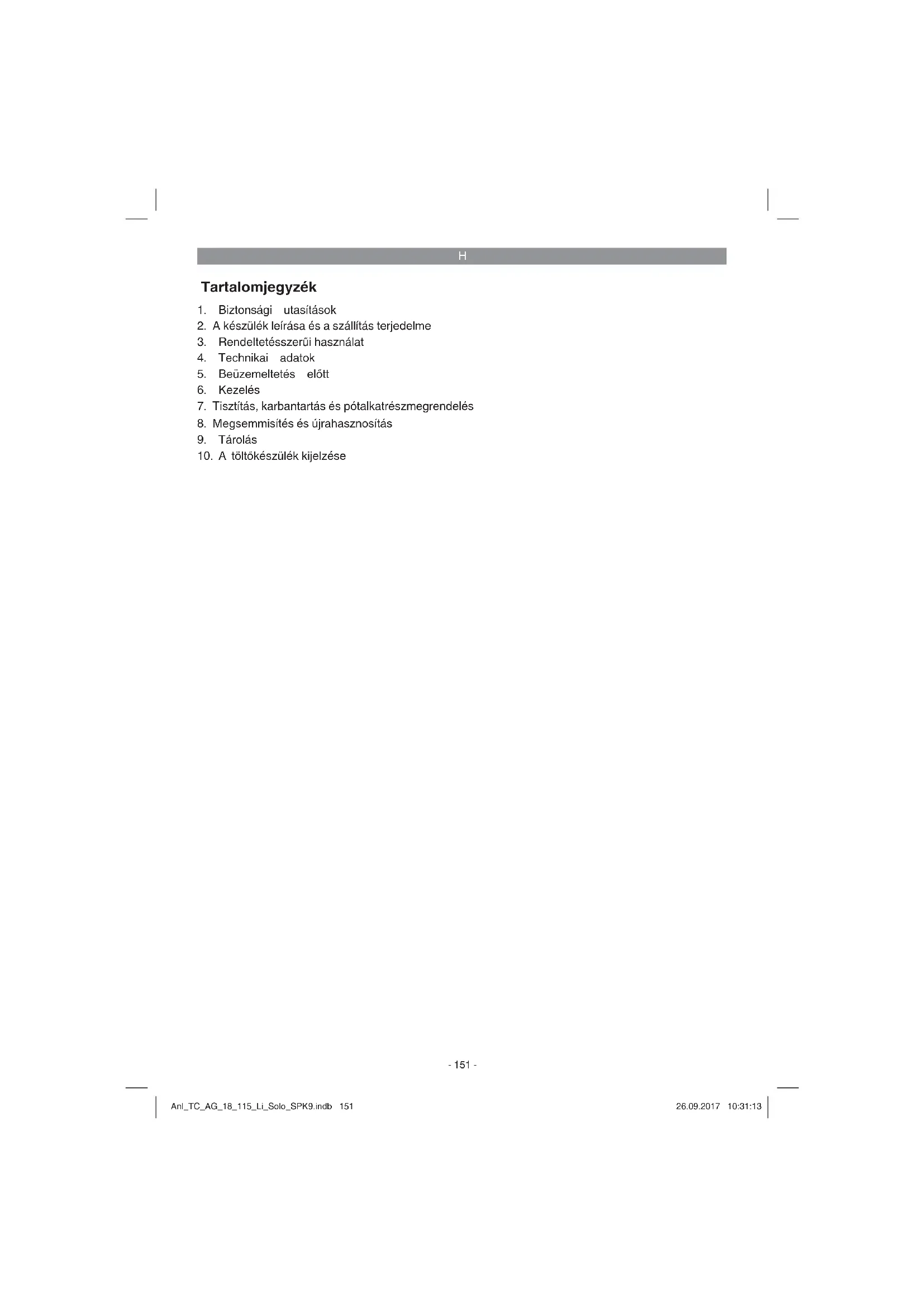 A sarokcsiszoló a megfelelő csiszolótárcsa és a megfelelő védőberendezés melett fém és kőzetek csiszolásár van meghatározva. Figyelmeztetés! Csak akkor szabad a sarokc- siszolót fém és kőzet vágására felhasználni, ha a tartozékként kapható védőberendezés fel van szerelve. A készüléket csak rendeltetése szerint szabad használni. Ezt túlhaladó bármilyen használat, nem számít rendeltetésszerűnek. Ebből adódó bármilyen kárért vagy bármilyen fajta sérülésért a használó ill. a kezelő felelős és nem a gyártó. Kérjük vegye fi gyelembe, hogy a készülékeink rendeltetésük szerint nem az ipari, kézműipari vagy gyári használatra lettek konstruálva. Nem vállalunk szavatosságot, ha a készülék ipari, kézműipari vagy gyári üzemek területén valamint egyenértékű tevékenységek területén van hasz- nálva. Anl_TC_AG_18_115_Li_Solo_SPK9.indb 153Anl_TC_AG_18_115_Li_Solo_SPK9.indb 153 26.09.2017 10:31:1426.09.2017 10:31:14H