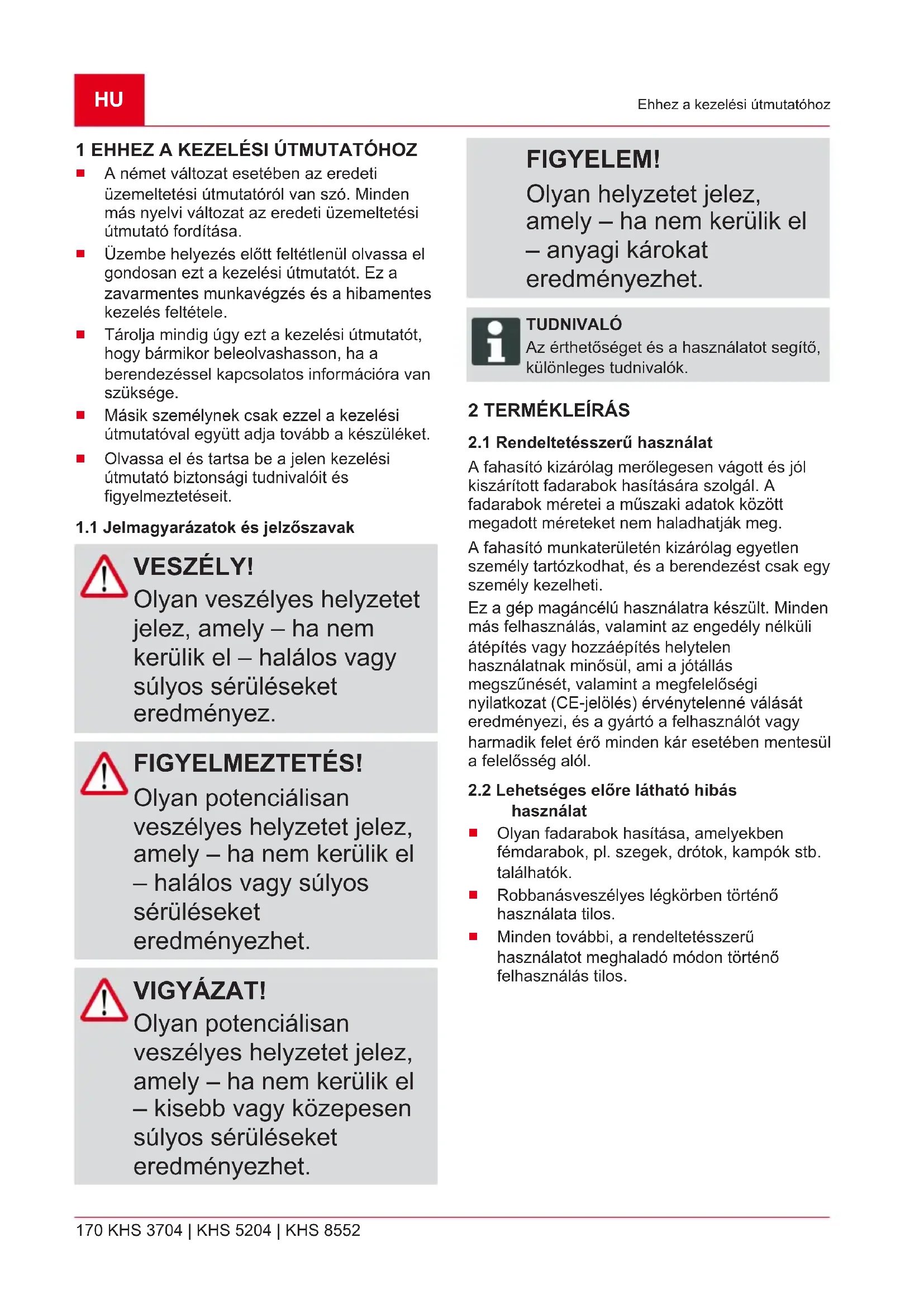 VESZÉLY! Olyan veszélyes helyzetet jelez, amely – ha nem kerülik el – halálos vagy súlyos sérüléseket eredményez. FIGYELMEZTETÉS! Olyan potenciálisan veszélyes helyzetet jelez, amely – ha nem kerülik el – halálos vagy súlyos sérüléseket eredményezhet. VIGYÁZAT! Olyan potenciálisan veszélyes helyzetet jelez, amely – ha nem kerülik el – kisebb vagy közepesen súlyos sérüléseket eredményezhet. FIGYELEM! Olyan helyzetet jelez, amely – ha nem kerülik el – anyagi károkat eredményezhet. TUDNIVALÓ Az érthetőséget és a használatot segítő, különleges tudnivalók.