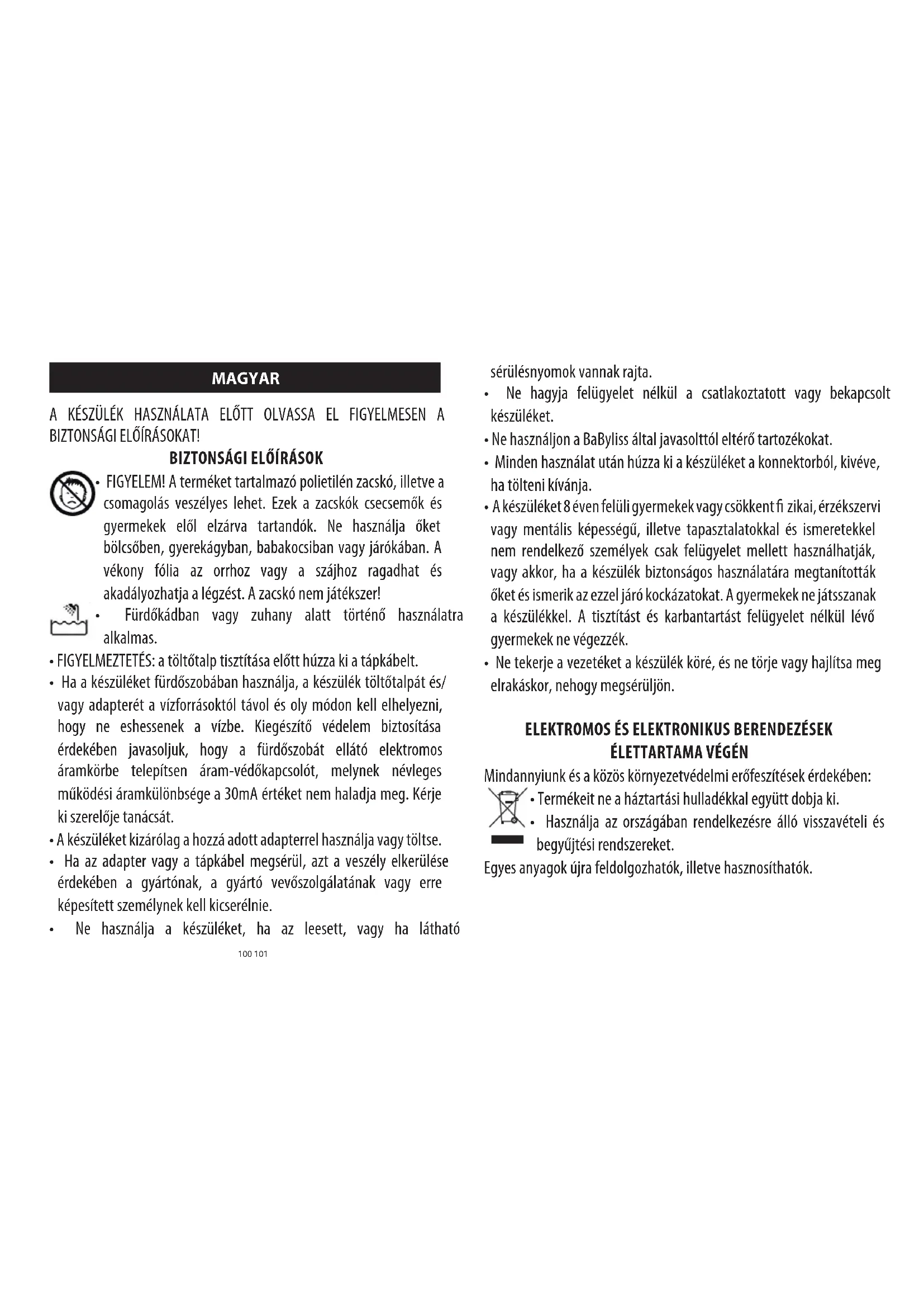 - Használja az országában rendelkezésre álló visszavételi és begyűjtési rendszereket. Egyes anyagok újra feldolgozhatók, illetve hasznosíthatók.102 103 AZ AKKUMULÁTOROK ÉS ELEMEK ÚJRAHASZNOSÍTÁSA A készülék leselejtezése előtt távolítsa el belőle az elemeket és akkumulátorokat, és azokat az erre a célra fenntartott helyen helyezze el. Ellenőrizze előtte, hogy az elemek és az akkumulátorok teljesen lemerült állapotban legyenek. Az akkumulátorok és elemek kiemelésével kapcsolatos információkért forduljon a BaByliss-hez. http://www.babyliss.com