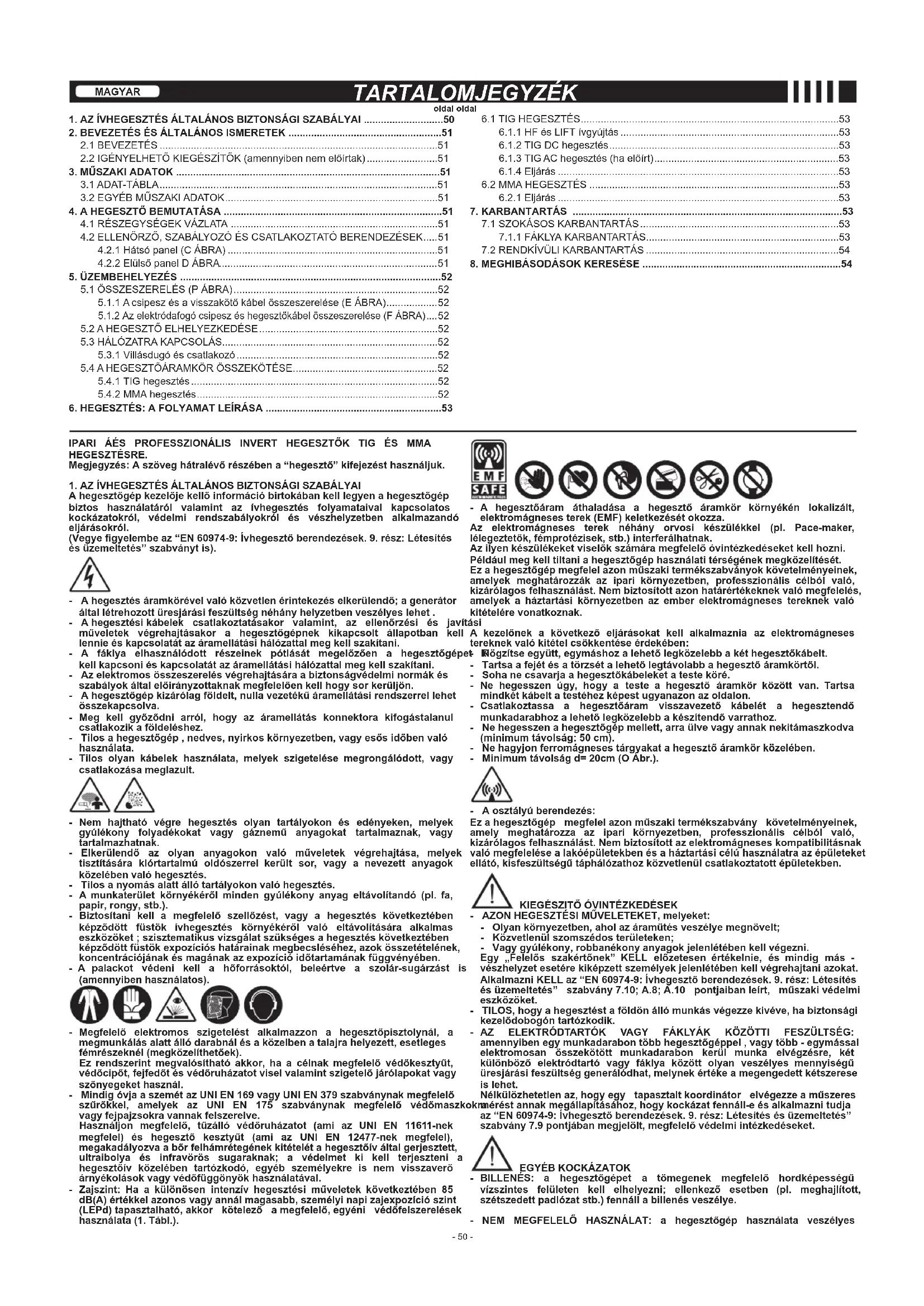 NEM KIELÉGÍTŐ MŰKÖDÉS ESETÉN, MIELŐTT SZISZTEMATIKUS FELÜLVIZSGÁLATBA KEZDENÉNEK VAGY SZERVIZHEZ FORDULNÁNAK, ELLENŐRIZNI KELL A KÖVETKEZŐKET: - Azt, hogy a potenciométer által szabályozott hegesztési áram az amper beosztású skála szerint megfelel-e az alkalmazott elektród átmérőjének és típusának. - Azt, hogy amikor a főkapcsoló “ON” állásban van, meggyullad-e a megfelelő lámpa, ellenkező esetben a meghibásodas oka általában az áramellátási vezetékben található (kábelek, villásdugó és/vagy csatlakozó, olvadóbiztosítékok stb.). - Azt, hogy nem ég-e a sárga kijelző (LED), mely a túl magas / túl alacsony feszültség, vagy rövidzárlat miatti hőszabályozási biztonsági beavatkozásra utal. - Meg kell győződni a nominalis szakaszosság arányának ellenőrzöttségéről; hővédelmi szabályozás beavatkozása esetén meg kell várni a hegesztőgép teljes kihűlését, ellenőrizni kell a szellőző-berendezés működőképességét. - Ellenőrizni kell a tápvezeték feszültségét: ha az érték tulságosan magas vagy túlságosan alacsony a hegesztőgép blokkolt állapotban marad. - Ellenőrizni kell, hogy nincs-e rövidzárlat a hegesztőgép végződésénél: amennyiben igen, meg kell szüntetni annak okát. - Ellenőrizni kell a hegesztési áramkör kapcsolásainak pontosságát, különösen azt, hogy a földelési kábel fogója valóban össze van-e kapcsolva a munkadarabbal, és hogy nem ékelődtek-e kapcsolat közé szigetelő anyagok (pl. festékek). - Az alkalmazott védelmi gáznak megfelelő minőségűnek (Argon 99.5) és mennyiségűnek kell lennie.- 55 - ROMÂNĂ CUPRINS