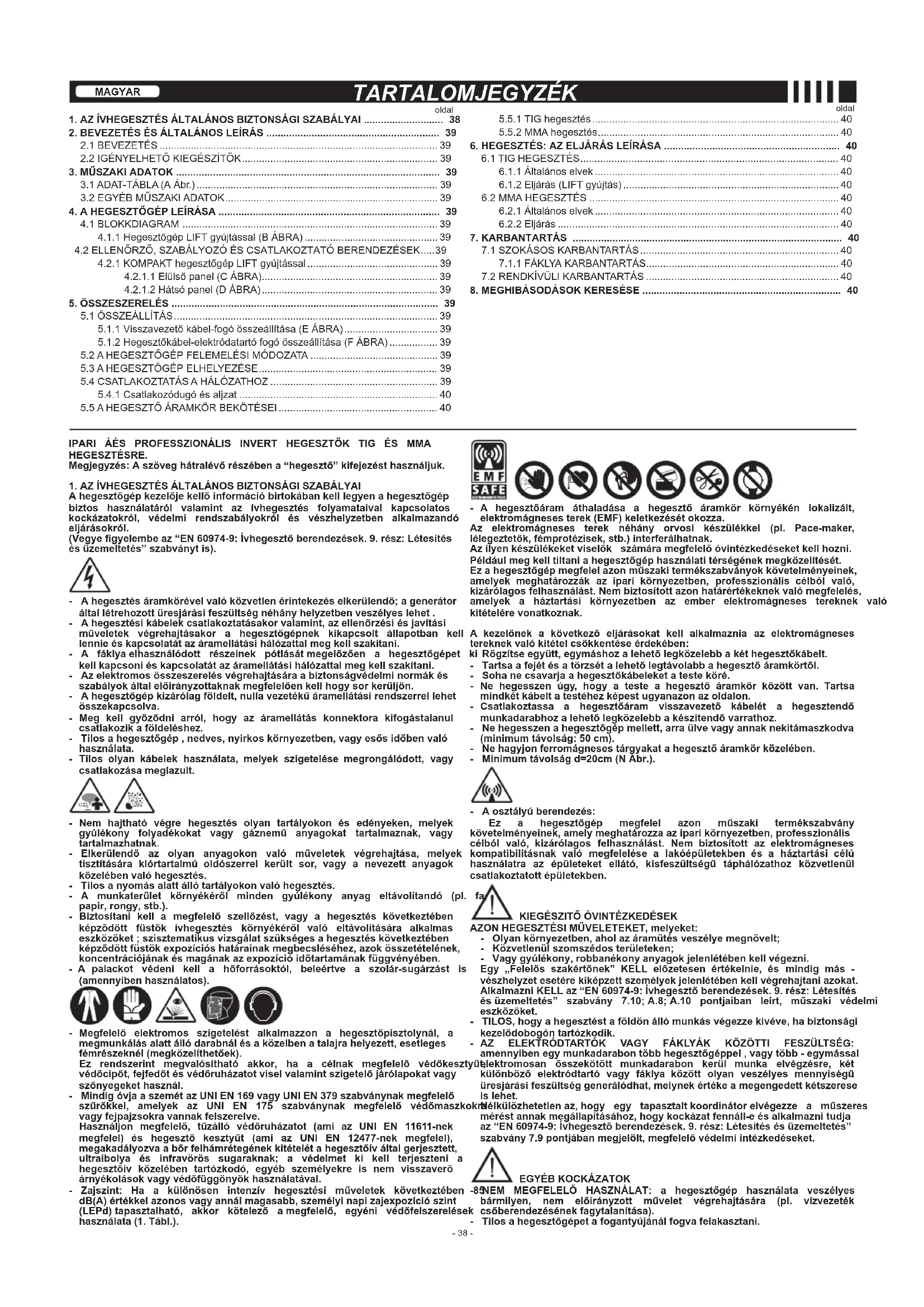 4.2.1 KOMPAKT hegesztőgép LIFT gyújtással .............................................. 39