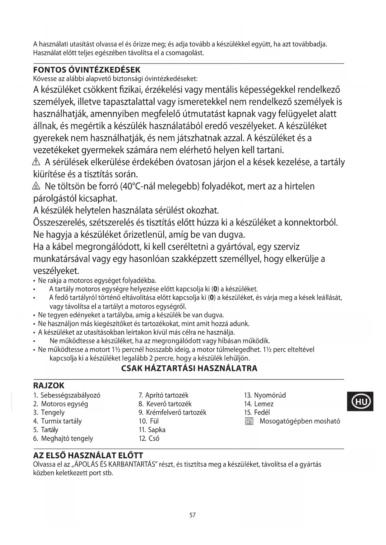 | Karbantart e1s e9s jav edt e1s | K f6nnyen tiszt edthat f3, a t e1l e9s a tartoz e9kok mosogat f3g e9pben moshat f3k. Rendszeresen ellen51rizze a tartoz e9kok e9s a motor e1llapot e1t. |