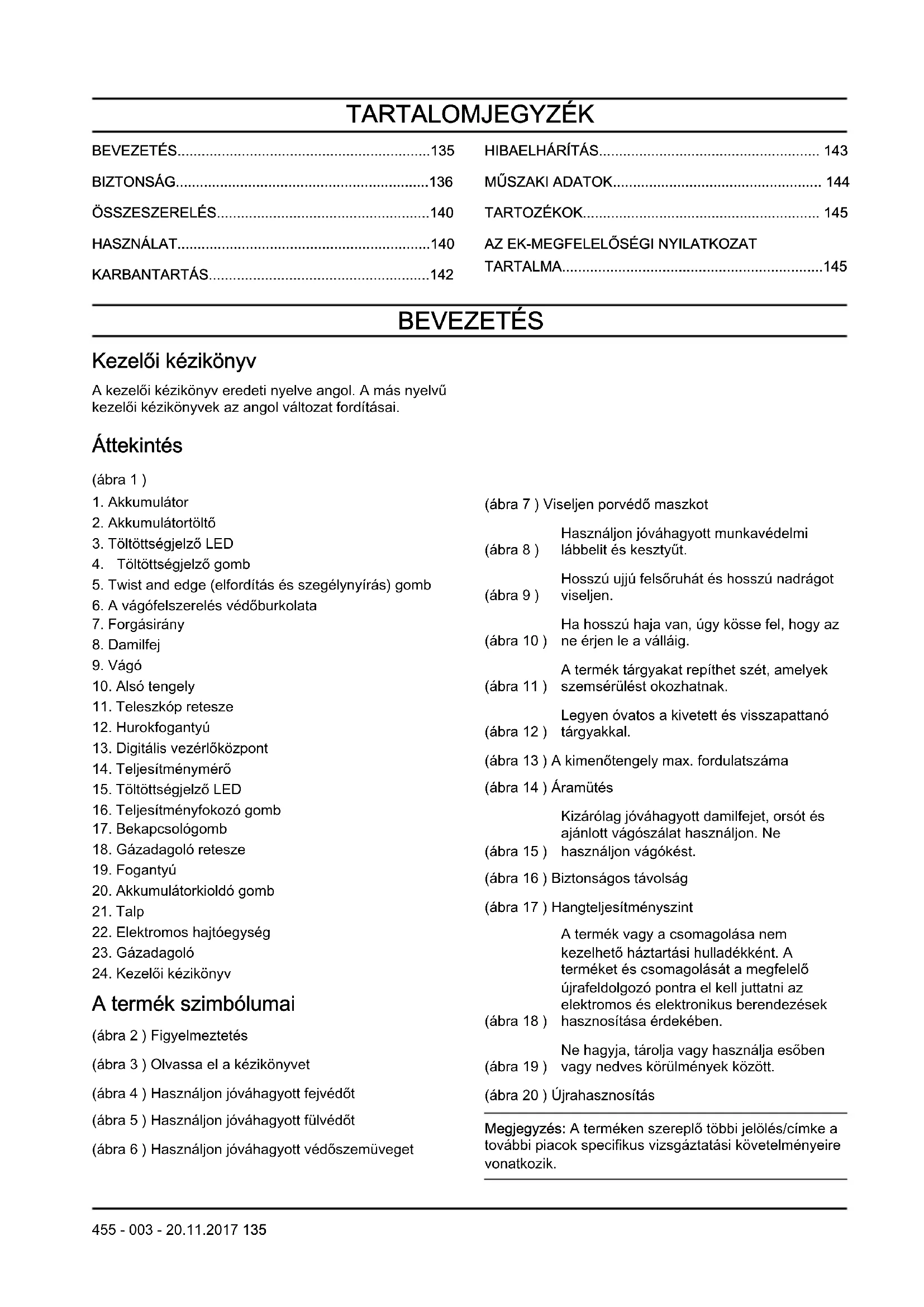 irányelvvel összhangban hangteljesítményként mért zajkibocsátás (LWA). A gép jelentésben szereplő hangteljesítményszintjét a legmagasabb szintet produkáló eredeti vágófelszereléssel mérték. A garantált és a mért hangteljesítmény közötti különbségnek az az oka, hogy a garantált hangteljesítmény tartalmazza a mérési eredményben lévő ingadozást és az azonos modellű gépek közti eltéréseket is a 2000/14/EK jelű irányelv értelmében. 144 455 - 003 - 20.11.20173. megjegyzés: A gép ekvivalens hangnyomásszintjére vonatkozó jelentési adatok az 3 dB (A) tipikus statisztikus ingadozásával (szórásával) rendelkeznek. TARTOZÉKOK Jóváhagyott tartozékok Type A vágófelszerelés védőburkolata Menetes tengely (M10L) Damilfej Vágószál Ø 2,4 mm (.095 in) 591 37 79-21