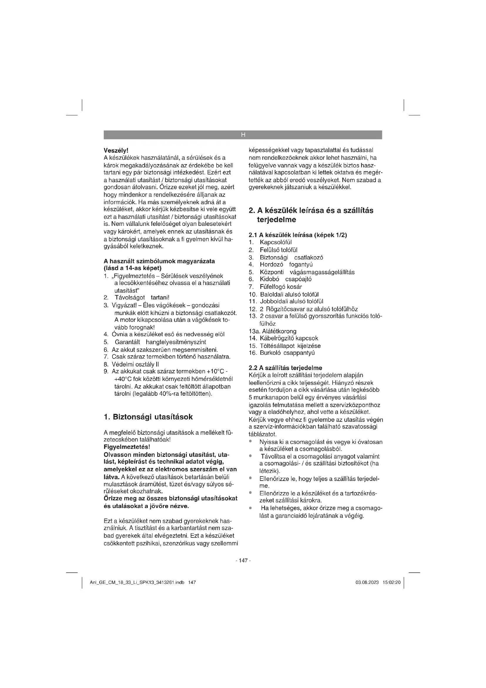 Vágásmagasság elállítás: .................................... ....................................... 25-65 mm; 5-fokozatban Figyelem! A készülék akkuk és töltőkészülék nélkül lesz les- zállítva és csak a Power-X-Change szeriai Li-Ion akkukkal szabad használni! A Power-X-Change szeriának a Li-Ion akkujait csak a Power-X-Charger-el szabad tölteni. Figyelem! A készüléket és a töltőkészüléket csak a Power- X-Change széria Li-Ion elemeihez szabad felhas- ználni. A zaj és a vibrálási értékek az EN ISO 3744: 1995, EN ISO 11201: 1996 és az EN ISO 20643: 2008 normáknak megfelelően lettek mérve. Anl_GE_CM_18_33_Li_SPK13_3413261.indb 148Anl_GE_CM_18_33_Li_SPK13_3413261.indb 148 03.08.2023 15:02:2003.08.2023 15:02:20H