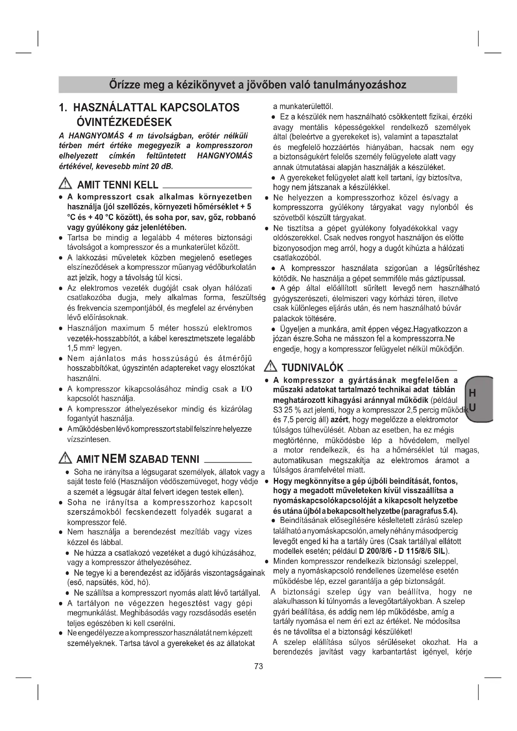 ● Sohaneirányítsaalégsugaratszemélyek,állatokvagya sajáttestefelé(Használjonvédőszemüveget,hogyvédje aszemétalégsugáráltalfelvertidegentestekellen). ● Soha ne irányítsa a kompresszorhoz kapcsolt szerszámokból fecskendezett folyadék sugarat a kompresszorfelé. ● Nem használja a berendezést mezítláb vagy vizes kézzeléslábbal. ● Nehúzzaacsatlakozóvezetéketadugókihúzásához, vagyakompresszoráthelyezéséhez. ● Netegyekiaberendezéstazidőjárásviszontagságainak (eső,napsütés,köd,hó). ● Neszállítsaakompresszortnyomásalattlévőtartállyal. ● A tartályon ne végezzen hegesztést vagy gépi megmunkálást.Meghibásodásvagyrozsdásodásesetén teljesegészébenkikellcserélni. ● Ne engedélyezze a kompresszor használatát nem képzett személyeknek.Tartsatávolagyerekeketésazállatokat amunkaterülettől. ● Ezakészüléknemhasználhatócsökkentettzikai,érzéki avagy mentális képességekkel rendelkező személyek által (beleértve a gyerekeket is), valamint a tapasztalat és megfelelőhozzáértés hiányában, hacsak nem egy abiztonságukértfelelősszemélyfelügyeletealattvagy annakútmutatásaialapjánhasználjákakészüléket. ● Agyerekeketfelügyeletalattkelltartani,ígybiztosítva, hogynemjátszanakakészülékkel. ● Ne helyezzen a kompresszorhoz közel és/vagy a kompresszorra gyúlékony tárgyakat vagy nylonból és szövetbőlkészülttárgyakat. ● Ne tisztítsa a gépet gyúlékony folyadékokkal vagy oldószerekkel.Csaknedvesrongyothasználjonéselőtte bizonyosodjonmegarról,hogyadugótkihúztaahálózati csatlakozóból. ● A kompresszor használata szigorúan a légsűrítéshez kötődik.Nehasználjaagépetsemmifélemásgáztípussal. ● Agép által előállított sűrített levegőnem használható gyógyszerészeti, élelmiszeri vagy kórházi téren, illetve csakkülönlegeseljárásután,ésnemhasználhatóbúvár palackoktöltésére. ● Ügyeljenamunkára,amitéppenvégez.Hagyatkozzona józanészre.Sohanemásszonfelakompresszorra.Ne engedje,hogyakompresszorfelügyeletnélkülműködjön. TUDNIVALÓK ● A kompresszor a gyártásának megfelelően a műszaki adatokat tartalmazó technikai adat táblán meghatározott kihagyási aránnyal működik (például S325%aztjelenti,hogyakompresszor2,5percigműködik és 7,5 percig áll) azért,hogymegelőzzeaelektromotor túlságostúlhevülését.Abbanazesetben,haezmégis megtörténne, működésbe lép a hővédelem, mellyel a motor rendelkezik, és ha ahőmérséklet túl magas, automatikusan megszakítja az elektromos áramot a túlságosáramfelvételmiatt. ● Hogy megkönnyítse a gép újbóli beindítását, fontos, hogy a megadott műveleteken kívül visszaállítsa a nyomáskapcsolókapcsolóját a kikapcsolt helyzetbe és utána újból a bekapcsolt helyzetbe (paragrafus 5.4). ● Beindításánakelősegítésérekésleltetettzárásúszelep található a nyomáskapcsolón, amely néhány másodpercig levegőtengedkihaatartályüres(Csaktartállyalellátott modellek esetén; például D 200/8/6 - D 115/8/6 SIL). ● Minden kompresszor rendelkezik biztonsági szeleppel, melyanyomáskapcsolórendellenesüzemeléseesetén működésbelép,ezzelgarantáljaagépbiztonságát. A biztonsági szelep úgy van beállítva, hogy ne alakulhassonkitúlnyomásalevegőtartályokban.Aszelep gyáribeállítása,ésaddignemlépműködésbe,amíga tartálynyomásaelnemérieztazértéket.Nemódosítsa ésnetávolítsaelabiztonságikészüléket! A szelep elállítása súlyos sérüléseket okozhat. Ha a berendezés javítást vagy karbantartást igényel, kérje74