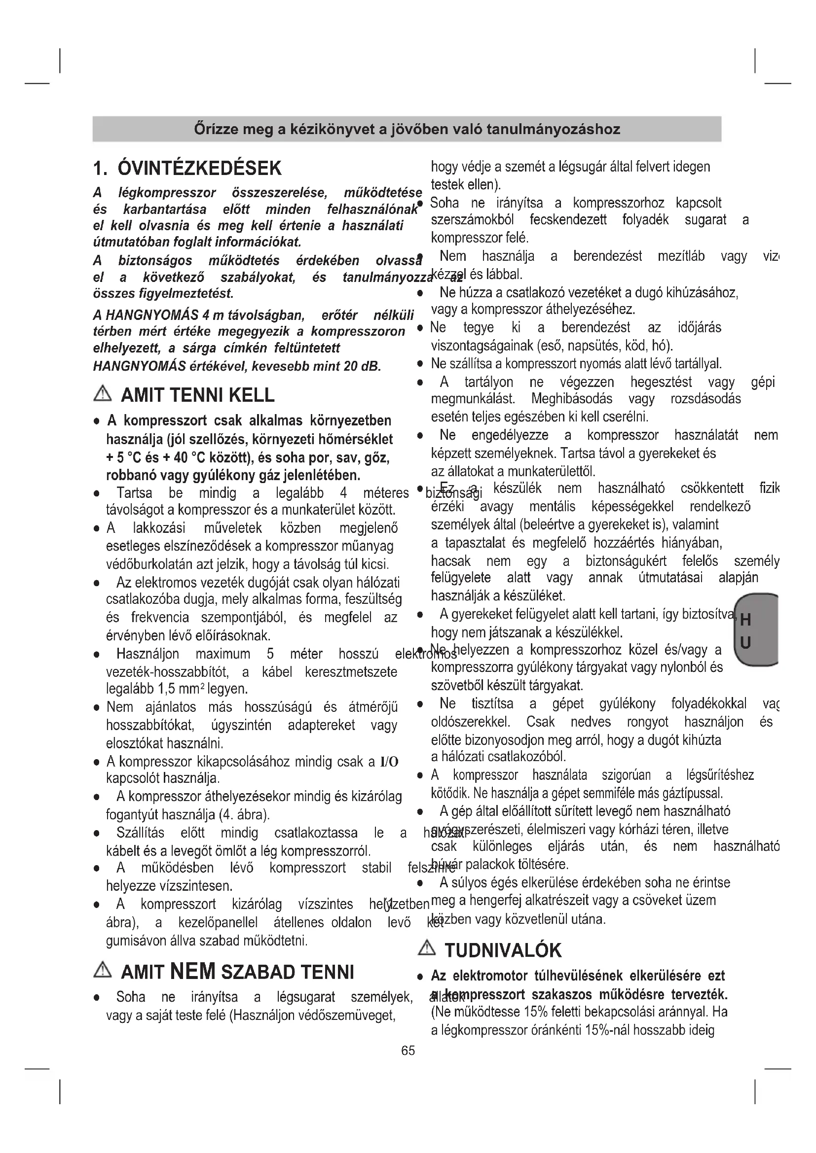 | Biztons e1g | Viseljen v e9d51szem fcs f6veget, ne l e9pje t fal a maxim e1lis nyom e1st, e9s gy51z51dj f6n meg arr f3l, hogy a kompresszor stabil fel fcletre van helyezve. |