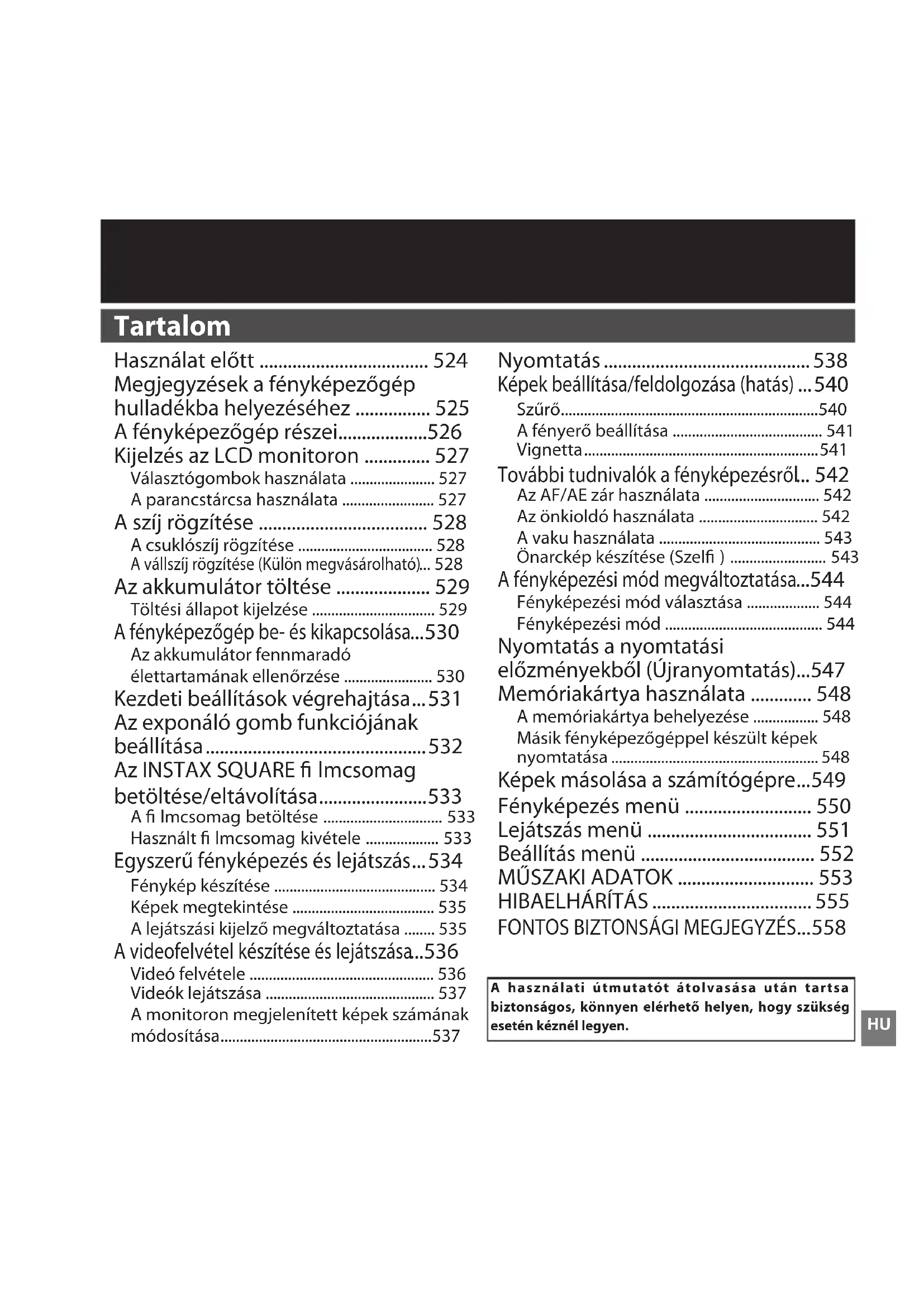 A termeket aBiztonsag figyelembe vetelevel terveztuk, esBiztonsagos mukodesre képes, ha rendeltetesszeruen, valamint a hasznalati utmutatónak es az utasitásoknak megfeleloen hasznaljak. Fontos, hogy a termeket es az INSTAX filmet is rendeltetesszerüen hasznaljak, es a felveteleket csak az itt, illetve az INSTAX mini filmvez mellekelt utasitásokban leirtak szerint nyomtassák. A konnyuésbiztonsagos hasznalat erdekében kovesse a jelen hasznalati utmutatóban leirtakat. Ajnlott ezt az utmutatot biztonsagos, konnyen elerhetohelyen tartani, hogy szükség eseten kéznél legyen.