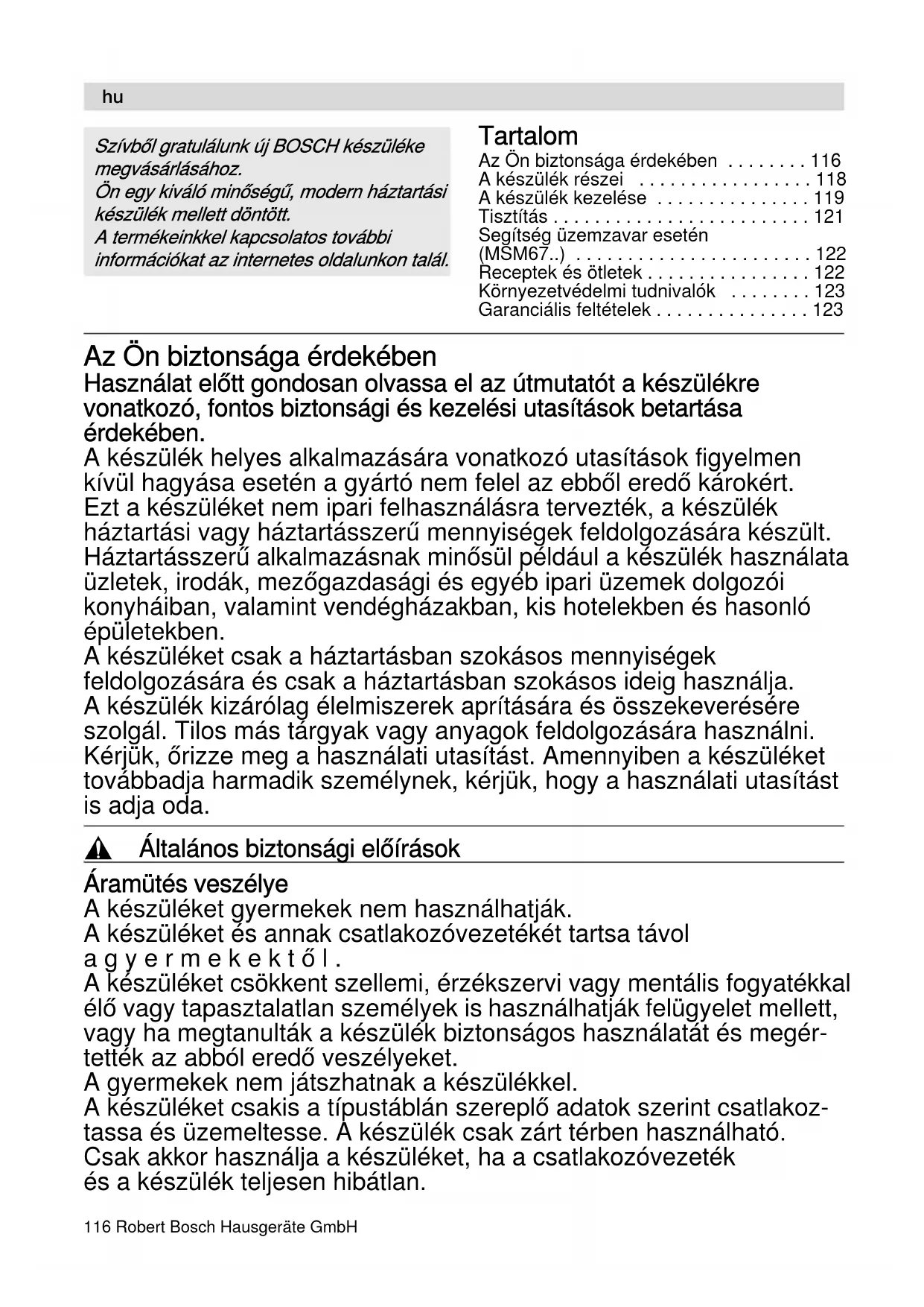 - Zastrzega się prawo wprowadzania zmian.116 Robert Bosch Hausgeräte GmbH Tartalom Az Ön biztonsága érdekében p. 116