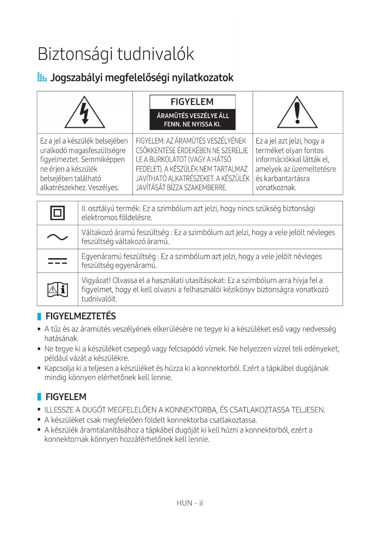 A készülék áramtalanításához a tápkábel dugóját ki kell húzni a konnektorból, ezért a konnektornak könnyen hozzáférhetőnek kell lennie. Biztonsági tudnivalók HUN - iiA Biztonsági óvintézkedések