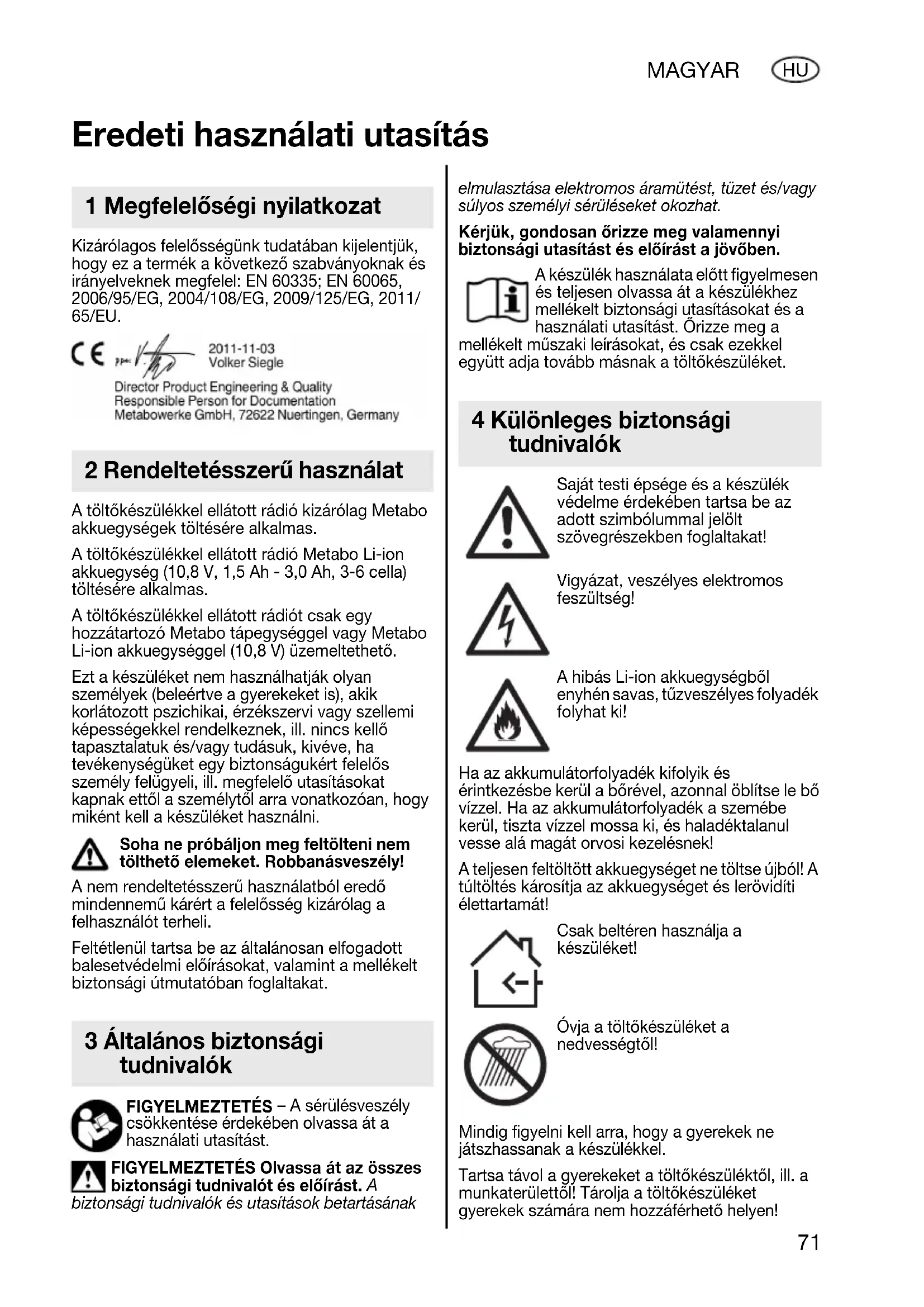 biztonsági tudnivalók és utasítások betartásának elmulasztása elektromos áramütést, tüzet és/vagy súlyos személyi sérüléseket okozhat. Kérjük, gondosan őrizze meg valamennyi biztonsági utasítást és előírást a jövőben. A készülék használata előtt figyelmesen és teljesen olvassa át a készülékhez mellékelt biztonsági utasításokat és a használati utasítást. Őrizze meg a mellékelt műszaki leírásokat, és csak ezekkel együtt adja tovább másnak a töltőkészüléket. Saját testi épsége és a készülék védelme érdekében tartsa be az adott szimbólummal jelölt szövegrészekben foglaltakat! Vigyázat, veszélyes elektromos feszültség! A hibás Li-ion akkuegységből enyhén savas, tűzveszélyes folyadék folyhat ki! Ha az akkumulátorfolyadék kifolyik és érintkezésbe kerül a bőrével, azonnal öblítse le bő vízzel. Ha az akkumulátorfolyadék a szemébe kerül, tiszta vízzel mossa ki, és haladéktalanul vesse alá magát orvosi kezelésnek! A teljesen feltöltött akkuegységet ne töltse újból! A túltöltés károsítja az akkuegységet és lerövidíti élettartamát! Csak beltéren használja a készüléket! Óvja a töltőkészüléket a nedvességtől! Mindig figyelni kell arra, hogy a gyerekek ne játszhassanak a készülékkel. Tartsa távol a gyerekeket a töltőkészüléktől, ill. a munkaterülettől! Tárolja a töltőkészüléket gyerekek számára nem hozzáférhető helyen! Eredeti használati utasítás 1 Megfelelőségi nyilatkozat 2 Rendeltetésszerű használat 3 Általános biztonsági tudnivalók 4 Különleges biztonsági tudnivalók72 MAGYAR