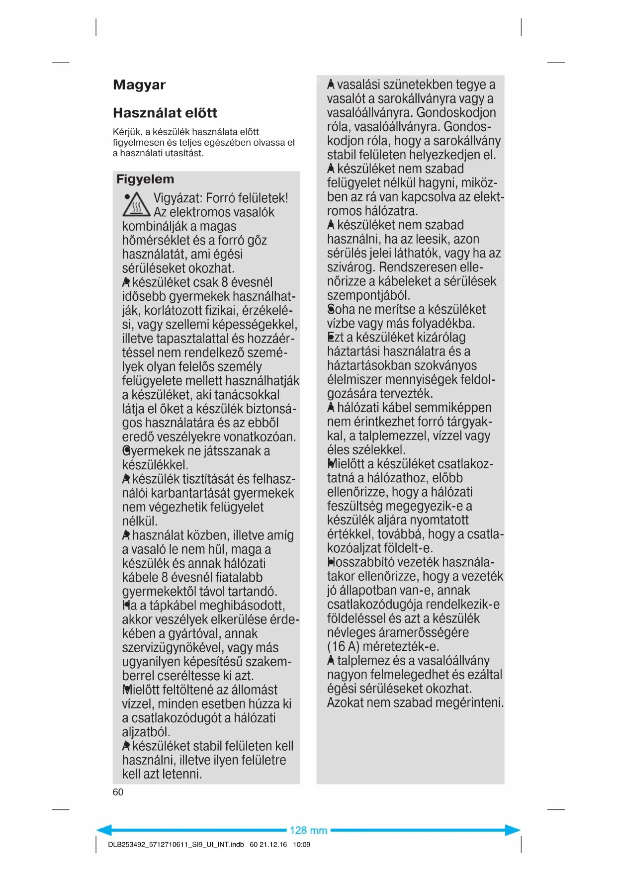 Vigyázat: Forró felületek! Az elektromos vasalók kombinálják a magas hőmérséklet és a forró gőz használatát, ami égési sérüléseket okozhat.