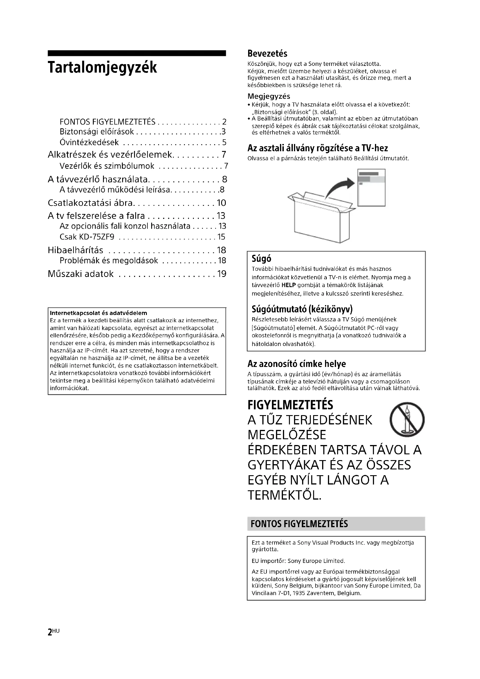 EGYÉB NYÍLT LÁNGOT A TERMÉKTŐL. Internetkapcsolat és adatvédelemEz a termék a kezdeti beállítás alatt csatlakozik az internethez, amint van hálózati kapcsolata, egyrészt az internetkapcsolat ellenőrzésére, később pedig a Kezdőképernyő konfigurálására. A rendszer erre a célra, és minden más internetkapcsolathoz is használja az IP-címét. Ha azt szeretné, hogy a rendszer egyáltalán ne használja az IP-címét, ne állítsa be a vezeték nélküli internet funkciót, és ne csatlakoztasson internetkábelt. Az internetkapcsolatokra vonatkozó további információkért tekintse meg a beállítási képernyőkön található adatvédelmi információkat. Súgó További hibaelhárítási tudnivalókat és más hasznos információkat közvetlenül a TV-n is elérhet. Nyomja meg a távvezérlő HELP gombját a témakörök listájának megjelenítéséhez, illetve a kulcsszó szerinti kereséshez. Súgóútmutató (kézikönyv) Részletesebb leírásért válassza a TV Súgó menüjének [Súgóútmutató] elemét. A Súgóútmutatót PC-ről vagy okostelefonról is megnyithatja (a vonatkozó tudnivalók a hátoldalon olvashatók).