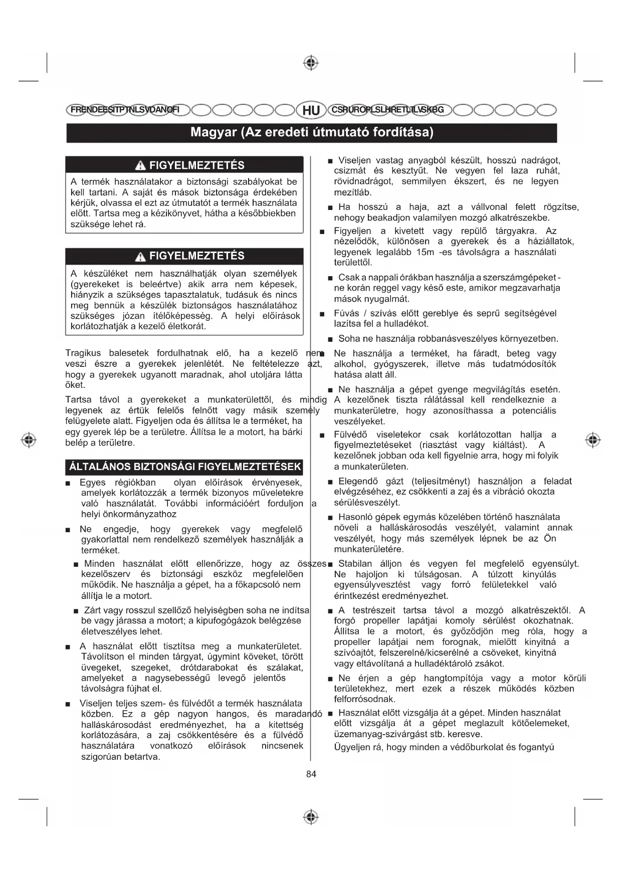 a munkaterületen. Ŷ (OHJHQGĘ Ji]W WHOMHVtWPpQ\W KDV]QiOMRQ D IHODGDW HOYpJ]pVpKH]H]FV|NNHQWLD]DMpVDYLEUiFLyRNR]WD sérülésveszélyt. Ŷ +DVRQOyJpSHNHJ\PiVN|]HOpEHQW|UWpQĘKDV]QiODWD Q|YHOL D KDOOiVNiURVRGiV YHV]pO\pW YDODPLQW DQQDN veszélyét, hogy más személyek lépnek be az Ön munkaterületére. Ŷ 6WDELODQ iOOMRQ pV YHJ\HQ IHO PHJIHOHOĘ HJ\HQV~O\W Ne hajoljon ki túlságosan. A túlzott kinyúlás HJ\HQV~O\YHV]WpVW YDJ\ IRUUy IHOOHWHNNHO YDOy érintkezést eredményezhet. Ŷ $ WHVWUpV]HLW WDUWVD WiYRO D PR]Jy DONDWUpV]HNWĘO $ IRUJy SURSHOOHU ODSiWMDL NRPRO\ VpUOpVW RNR]KDWQDN ÈOOtWVD OH D PRWRUW pV J\Ę]ĘGM|Q PHJ UyOD KRJ\ D SURSHOOHU ODSiWMDL QHP IRURJQDN PLHOĘWW NLQ\LWQi D V]tYyDMWyWIHOV]HUHOQpNLFVHUpOQpDFV|YHNHWNLQ\LWQi vagy eltávolítaná a hulladéktároló zsákot. Ŷ 1H pUMHQ D JpS KDQJWRPStWyMD YDJ\ D PRWRU N|UOL WHUOHWHNKH] PHUW H]HN D UpV]HN PĦN|GpV N|]EHQ IHOIRUUyVRGQDN Ŷ +DV]QiODWHOĘWWYL]VJiOMDiWDJpSHW0LQGHQKDV]QiODW HOĘWW YL]VJiOMD iW D JpSHW PHJOD]XOW N|WĘHOHPHNHW üzemanyag-szivárgást stb. keresve. hJ\HOMHQUiKRJ\PLQGHQDYpGĘEXUNRODWpVIRJDQW\~85 Magyar (Az eredeti útmutató fordítása) FR EN DE ES IT PT NL SV DA NO FI CS RU RO PL SL HR ET LT LV SK BG PHJIHOHOĘHQIHOOHJ\HQV]HUHOYHpVU|J]tWYH+DV]QiODW HOĘWWFVHUpOMHNLD]|VV]HVVpUOWDONDWUpV]W Ŷ 6RKD QHPĦN|GWHVVHDJpSHW PHJIHOHOĘHQIHOV]HUHOW WDUWR]pNRN QpONO )~YyJpSNpQW KDV]QiOYD PLQGLJ V]HUHOMH IHO D I~YyFV|YHNHW pV ]iUMD EH D] DMWyW 6]tYyJpSNpQWYDOyKDV]QiODWNRUPLQGLJV]HUHOMHIHOD V]tYyFV|YHNHWpVDV]tYy]ViNRW Ŷ Ne próbálja módosítani a terméket vagy olyan NLHJpV]tWĘNHWHOĘiOOtWDQLDPHO\HNQHNDWHUPpNNHOYDOy használata nem javasolt. FIGYELMEZTETÉS +DDJpSOHHVHWWHUĘVWpVWNDSRWWYDJ\UHQGHOOHQHVHQ kezd vibrálni, azonnal állítsa le a gépet, és vizsgálja át sérülések tekintetében vagy azonosítsa a vibráció RNiW0LQGHQVpUOpVWKLYDWDORVV]HUYL]N|]SRQWEDQNHOO megjavíttatni vagy kicseréltetni. Ŷ $ JpS ]HPDQ\DJJDO YDOy IHOW|OWpVH WiUROiVD pV V]iOOtWiVDHOĘWWiOOtWVDOHDPRWRUWpVKDJ\MDOHKĦOQL Ŷ $] ]HPDQ\DJ EHW|OWpVpKH] pV D] ]HPDQ\DJ keveréséhez válasszon egy lángtól (szikrák, lángok VWEJ\~OpNRQ\DQ\DJRNWyOWiYROLMyOV]HOOĘ]ĘKHO\HW Ŷ Ne dohányozzon az üzemanyag keverése vagy EHW|OWpVHN|]EHQ Ŷ Az üzemanyagot benzineskannában tárolja és keverje. $ N|]HOEHQ WDUWVRQ HJ\ PHJIHOHOĘ WtSXV~ WĦ]ROWy készüléket, hogy elolthassa az üzemanyagtüzeket. Ŷ $PRWRUEHLQGtWiVDHOĘWWQHIHOHMWVHHOEL]WRQViJRVDQ IHOKHO\H]QLD]]HPDQ\DJWDUWiO\EH|QWĘVDSNiMiW Ŷ 7|U|OMH OH D NLIRO\W EHQ]LQW 0HQMHQ P OiE WiYROViJUD D] ~MUDW|OWpV KHO\pWĘO D PRWRU EHLQGtWiVD HOĘWW Ŷ Arról számoltak be, hogy a kéziszerszámok használata VRUiQ IHOOpSĘ YLEUiFLy EL]RQ\RV V]HPpO\HNQpO hozzájárulhat az úgynevezett Raynaud-szindróma 5D\QDXG¶V 6\QGURPH QHYĦ iOODSRW NLDODNXOiViKR] $WQHWHLOHKHWQHND]XMMDN]VLEEDGiVDHOIHKpUHGpVH szúrások érzése, amelyek hidegnek kitéve gyakran IHOHUĘV|GQHN $] |U|NOĘGĘ WpQ\H]ĘN D KLGHJQHN kitettség és verejtékezés, a diéta, a dohányzás és PXQND N|]EHQ DONDOPD]RWW IRJiVRN YDOyV]tQĦOHJ mind hozzájárulhatnak ezen tünetek megjelenéséhez. $ YLEUiFLy KDWiVDLQDN FV|NNHQWpVH pUGHNpEHQ D NH]HOĘQHNEHNHOOWDUWDQLD]DOiEELyYLQWp]NHGpVHNHW Ɣ +LGHJ LGĘEHQ WDUWVD PHOHJHQ D WHVWpW $ JpS KDV]QiODWDNRUYLVHOMHQNHV]W\ĦWDNp]pVDFVXNOy melegen tartásához. Arról számoltak be, hogy a KLGHJLGĘMiUiVQDNIRQWRVV]HUHSHYDQD5D\QDXG szindróma kialakulásában. Ɣ %L]RQ\RV LGĘWDUWDP~ KDV]QiODW XWiQ PLQGLJ végezzen gyakorlatokat a vérkeringés javításához. Ɣ Gyakran tartson munkaszünetet. Korlátozza a napi PXQNDLGĘW Ha ezen állapot bármelyik tünetét tapasztalja, azonnal hagyja abba a munkát, és tájékoztassa az orvosát a WQHWHNUĘO FIGYELMEZTETÉS Injuries may be caused, or aggravated, by prolonged XVHRIDWRRO+DDJpSHWKRVV]~LGĘQiWNHOOKDV]QiOQLD tartson gyakran szünetet. Ŷ $ IRUJy DONDWUpV]HNNHO YDOy pULQWNH]pV RNR]WD VpUOpVHN YHV]pO\pQHN FV|NNHQWpVH pUGHNpEHQ mindig állítsa le a motort, vegye le a gyújtáskábelt és HOOHQĘUL]]HKRJ\PLQGHQPR]JyUpV]PHJiOOWPLHOĘWW Ɣ WLV]WtWiVYDJ\HOW|PĘGpVPHJV]QWHWpVH Ɣ DWHUPpNIHOJ\HOHWQpONOKDJ\iVD Ɣ IHOV]HUHOQpYDJ\HOWiYROtWDQiDWDUWR]pNRNDW Ɣ HOOHQĘU]LNDUEDQWDUWMDYDJ\GROJR]LNDJpSHQ FIGYELMEZTETÉS (OĘIRUGXOKDWKRJ\I~YyJpSHJ\KHYHGHUUHOYDQV]iOOtWYD Pontosan állítsa be a hevedert, hogy kényelmesen segítse a gép súlyának megtámasztását, és akassza a jobb oldalára. FIGYELMEZTETÉS 1p]]H PHJ KRJ\DQ NHOO PĦN|GWHWQL D J\RUVNLROGy PHFKDQL]PXVW pV J\DNRUROMD EH PLHOĘWW elkezdené használni a gépet. A helyes használat megakadályozhatja a súlyos sérüléseket vészhelyzetben. Ne viseljen további ruházatot a KHYHGHUHQ IHOO pV QH NRUOiWR]]D PiV PyGRQ D J\RUVNLROGyPHFKDQL]PXVKR]YDOyKR]]iIpUpVW FÚVÓGÉP BIZTONSÁGI FIGYELMEZTETÉSEK Ŷ 3RURV N|UOPpQ\HNN|]|WWYLVHOMHQDUFPDV]NRWKRJ\ FV|NNHQWVH D SRU EHV]tYiViEyO HUHGĘ VpUOpVHN veszélyét. Ŷ 1HLUiQ\tWVDDI~YyJpSHWN|]YHWOHQOHPEHUHNUHYDJ\ háziállatokra. Ŷ 6RKD QH WHJ\HQ VHPPLO\HQ WiUJ\DW D I~YyFV|YHN belsejébe. Ŷ 1HPĦN|GWHVVHDJpSHWQ\LWRWWDEODNN|]HOpEHQ Ŷ 3RURV N|UOPpQ\HN N|]|WW HQ\KpQ QHGYHVtWVH EH D IHOOHWHW Ŷ $ WHOMHV I~YyJpSFVĘKRVV]DEEtWyW KDV]QiOMD KRJ\ D OpJiUDPFVDN N|]YHWOHQO D WDODMIHOHWW MXVVRQ NL D86 Magyar (Az eredeti útmutató fordítása) FR EN DE ES IT PT NL SV DA NO FI CS RU RO PL SL HR ET LT LV SK BG