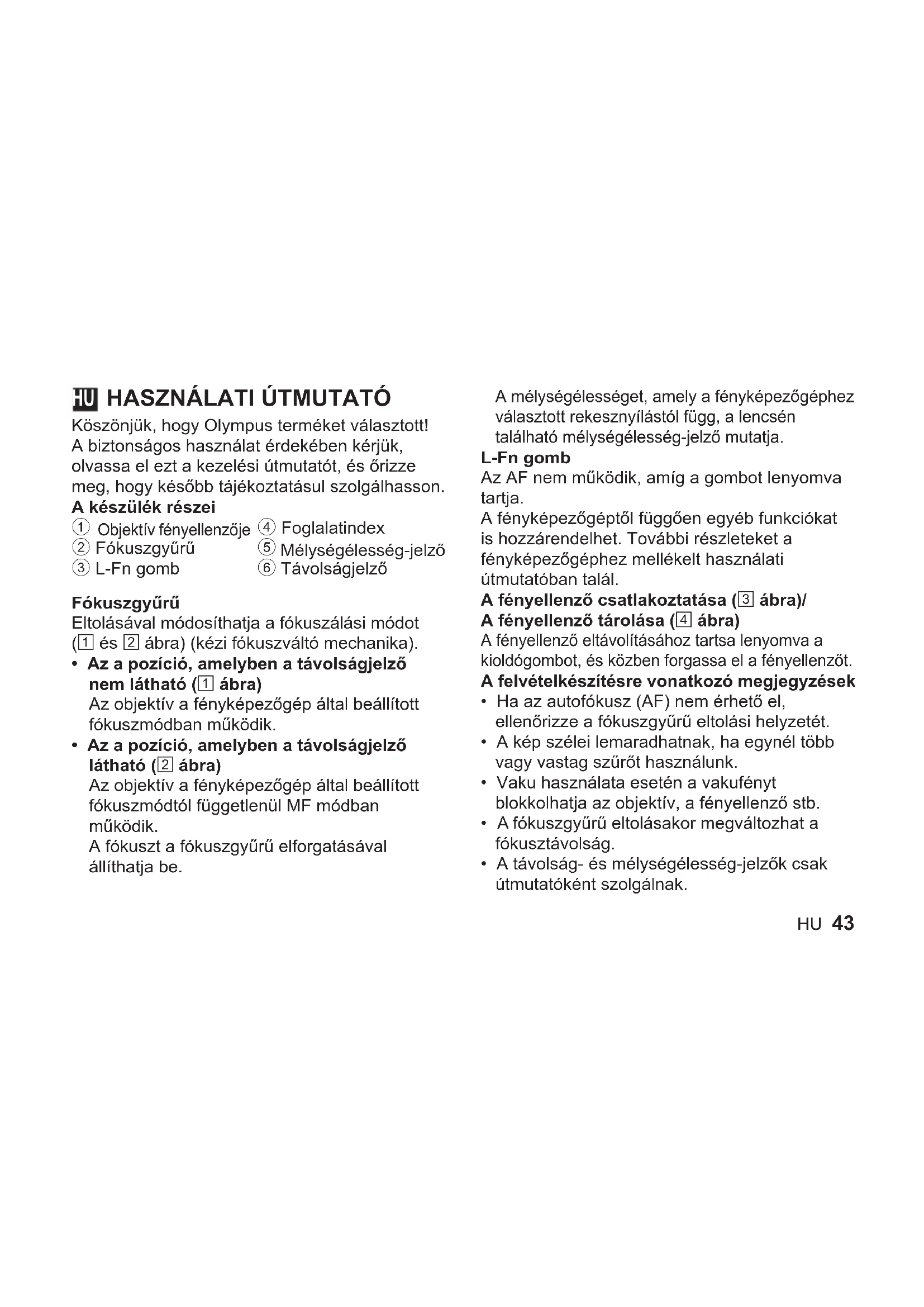 - A távolság- és mélységélesség-jelzők csak útmutatóként szolgálnak. HU44 HU Műszaki adatok Foglalat : Mikro-Four Thirds szabvány Gyújtótávolság :