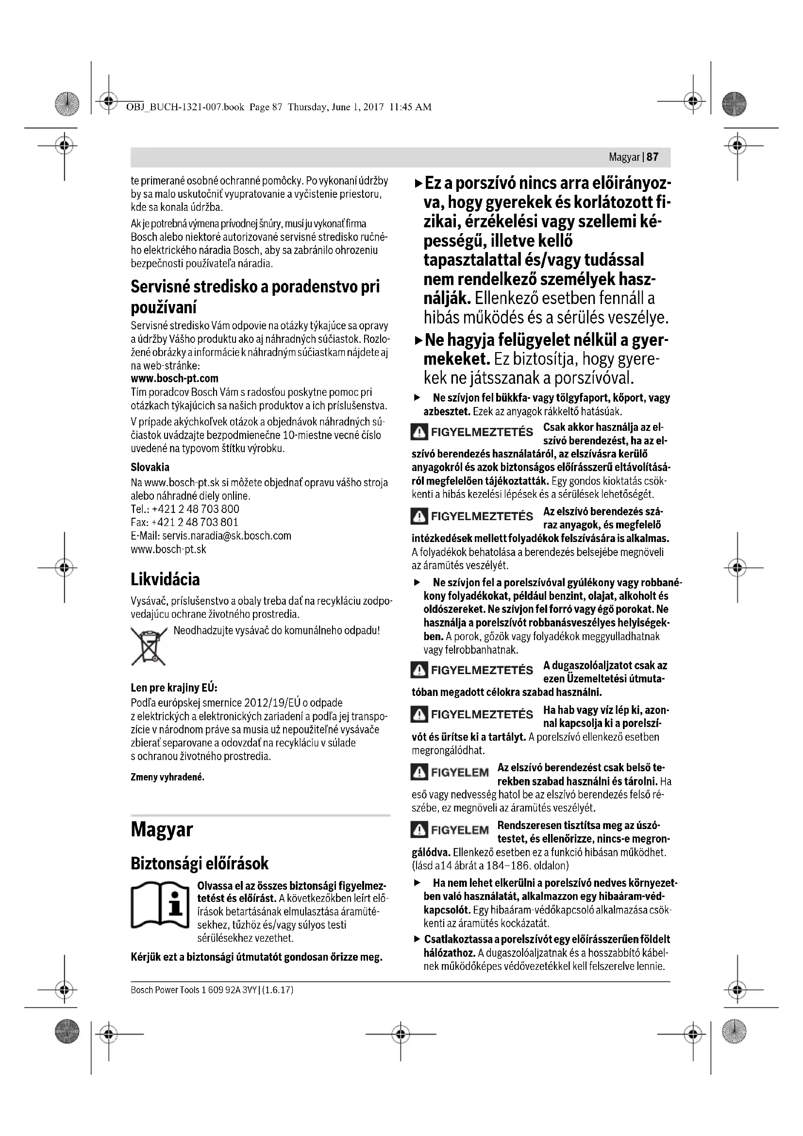Výmena skladacieho filtra 13 182 – 183 Čistenie plaváka 14 184 – 186 Voľba príslušenstva – 187 Cieľ činnosti Obrázok Dodržiavajte nasledovné Strana POZOR OBJ_BUCH-1321-007.book Page 86 Thursday, June 1, 2017 11:45 AMMagyar | 87 Bosch Power Tools 1 609 92A 3VY | (1.6.17) te primerané osobné ochranné pomôcky. Po vykonaní údržby by sa malo uskutočniť vyupratovanie a vyčistenie priestoru, kde sa konala údržba. Ak je potrebná výmena prívodnej šnúry, musí ju vykonať firma Bosch alebo niektoré autorizované servisné stredisko ručné- ho elektrického náradia Bosch, aby sa zabránilo ohrozeniu bezpečnosti používateľa náradia. Servisné stredisko a poradenstvo pri používaní Servisné stredisko Vám odpovie na otázky týkajúce sa opravy a údržby Vášho produktu ako aj náhradných súčiastok. Rozlo- žené obrázky a informácie k náhradným súčiastkam nájdete aj na web-stránke: www.bosch-pt.com Tím poradcov Bosch Vám s radosťou poskytne pomoc pri otázkach týkajúcich sa našich produktov a ich príslušenstva. V prípade akýchkoľvek otázok a objednávok náhradných sú- čiastok uvádzajte bezpodmienečne 10-miestne vecné číslo uvedené na typovom štítku výrobku. Slovakia Na www.bosch-pt.sk si môžete objednať opravu vášho stroja alebo náhradné diely online. Tel.: +421 2 48 703 800 Fax: +421 2 48 703 801 E-Mail: servis.naradia@sk.bosch.com www.bosch-pt.sk Likvidácia Vysávač, príslušenstvo a obaly treba dať na recykláciu zodpo- vedajúcu ochrane životného prostredia. Neodhadzujte vysávač do komunálneho odpadu! Len pre krajiny EÚ: Podľa európskej smernice 2012/19/EÚ o odpade z elektrických a elektronických zariadení a podľa jej transpo- zície v národnom práve sa musia už nepoužiteľné vysávače zbierať separovane a odovzdať na recykláciu v súlade s ochranou životného prostredia. Zmeny vyhradené. Magyar Biztonsági előírások Olvassa el az összes biztonsági figyelmez- tetést és előírást. A következőkben leírt elő- írások betartásának elmulasztása áramüté- sekhez, tűzhöz és/vagy súlyos testi sérülésekhez vezethet. Kérjük ezt a biztonsági útmutatót gondosan őrizze meg. Ez a porszívó nincs arra előirányoz- va, hogy gyerekek és korlátozott fi- zikai, érzékelési vagy szellemi ké- pességű, illetve kellő tapasztalattal és/vagy tudással nem rendelkező személyek hasz- nálják. Ellenkező esetben fennáll a hibás működés és a sérülés veszélye. Ne hagyja felügyelet nélkül a gyer- mekeket. Ez biztosítja, hogy gyere- kek ne játsszanak a porszívóval. Ne szívjon fel bükkfa- vagy tölgyfaport, kőport, vagy azbesztet. Ezek az anyagok rákkeltő hatásúak. Csak akkor használja az el- szívó berendezést, ha az el- szívó berendezés használatáról, az elszívásra kerülő anyagokról és azok biztonságos előírásszerű eltávolításá- ról megfelelően tájékoztatták. Egy gondos kioktatás csök- kenti a hibás kezelési lépések és a sérülések lehetőségét. Az elszívó berendezés szá- raz anyagok, és megfelelő intézkedések mellett folyadékok felszívására is alkalmas. A folyadékok behatolása a berendezés belsejébe megnöveli az áramütés veszélyét. Ne szívjon fel a porelszívóval gyúlékony vagy robbané- kony folyadékokat, például benzint, olajat, alkoholt és oldószereket. Ne szívjon fel forró vagy égő porokat. Ne használja a porelszívót robbanásveszélyes helyiségek- ben. A porok, gőzök vagy folyadékok meggyulladhatnak vagy felrobbanhatnak. A dugaszolóaljzatot csak az ezen Üzemeltetési útmuta- tóban megadott célokra szabad használni. Ha hab vagy víz lép ki, azon- nal kapcsolja ki a porelszí- vót és ürítse ki a tartályt. A porelszívó ellenkező esetben megrongálódhat. Az elszívó berendezést csak belső te- rekben szabad használni és tárolni. Ha eső vagy nedvesség hatol be az elszívó berendezés felső ré- szébe, ez megnöveli az áramütés veszélyét. Rendszeresen tisztítsa meg az úszó- testet, és ellenőrizze, nincs-e megron- gálódva. Ellenkező esetben ez a funkció hibásan működhet. (lásd a14 ábrát a 184–186. oldalon) Ha nem lehet elkerülni a porelszívó nedves környezet- ben való használatát, alkalmazzon egy hibaáram-véd- kapcsolót. Egy hibaáram-védőkapcsoló alkalmazása csök- kenti az áramütés kockázatát. Csatlakoztassa a porelszívót egy előírásszerűen földelt hálózathoz. A dugaszolóaljzatnak és a hosszabbító kábel- nek működőképes védővezetékkel kell felszerelve lennie. FIGYELMEZTETÉS FIGYELMEZTETÉS FIGYELMEZTETÉS FIGYELMEZTETÉS OBJ_BUCH-1321-007.book Page 87 Thursday, June 1, 2017 11:45 AM88 | Magyar 1 609 92A 3VY | (1.6.17) Bosch Power Tools Minden használat előtt ellenőrizze a porelszívót, a ká- belt és a csatlakozó dugót. Ne használja a porelszívót, ha ezek közül valamelyiken károsodás lépett fel. Ne nyissa fel saját maga a porelszívót, hanem azt csak szakképzett szakemberrel és csak eredeti pótalkatré- szek használatával javíttassa meg. Egy megrongálódott porelszívó, kábel, vagy csatlakozó dugó megnöveli az áramütés veszélyét. Ne préselje össze a kábelt és ne menjen át rajta jármű- vel, targoncával, stb. A hálózati csatlakozót sohase a kábelnél fogva húzza ki a dugaszoló aljzatból, hanem mindig a dugaszoló csatlakozót fogja meg. Sohase húz- za a porelszívót a mozgatáshoz a kábelnél fogva. Egy megrongálódott kábel megnöveli az áramütés veszélyét. Húzza ki a hálózati csatlakozó dugót a dugaszolóaljzat- ból, mielőtt az elszívó berendezésen karbantartási munkákat kezd, mielőtt azt megtisztítja, azon beállítá- sokat hajt végre, a tartozék alkatrészeket cseréli, vagy az elszívó berendezést elrakja. Ez az elővigyázatossági intézkedés meggátolja a porelszívó akaratlan üzembe he-