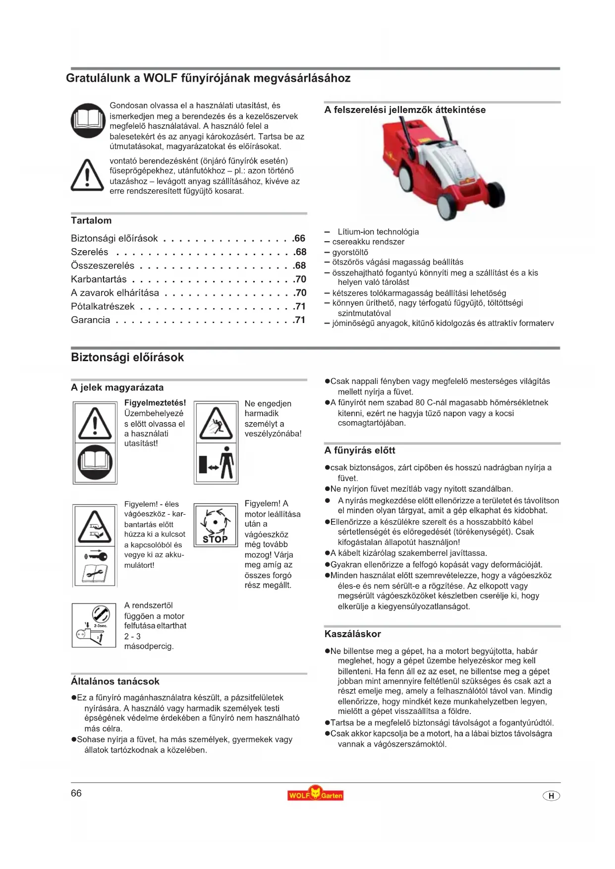 - H Gratulálunk a WOLF f^nyírójának megvásárlásához Tartalom Biztonsági elírások p. 66