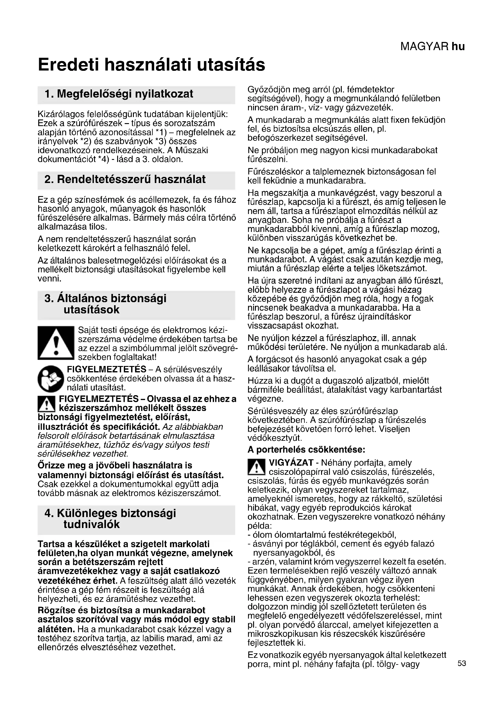 Eredeti használati utasítás Kizárólagos felelősségünk tudatában kijelentjük: Ezek a szúrófűrészek – típus és sorozatszám alapján történő azonosítással *1) – megfelelnek az irányelvek *2) és szabványok *3) összes idevonatkozó rendelkezéseinek. A Műszaki dokumentációt *4) - lásd a 3. oldalon. Ez a gép színesfémek és acéllemezek, fa és fához hasonló anyagok, műanyagok és hasonlók fűrészelésére alkalmas. Bármely más célra történő alkalmazása tilos. A nem rendeltetésszerű használat során keletkezett károkért a felhasználó felel. Az általános balesetmegelőzési előírásokat és a mellékelt biztonsági utasításokat figyelembe kell venni. Saját testi épsége és elektromos kézi- szerszáma védelme érdekében tartsa be az ezzel a szimbólummal jelölt szövegré- szekben foglaltakat! FIGYELMEZTETÉS – A sérülésveszély csökkentése érdekében olvassa át a hasz- nálati utasítást. FIGYELMEZTETÉS – Olvassa el az ehhez a kéziszerszámhoz mellékelt összes biztonsági figyelmeztetést, előírást, illusztrációt és specifikációt. Az alábbiakban felsorolt előírások betartásának elmulasztása áramütésekhez, tűzhöz és/vagy súlyos testi sérülésekhez vezethet. Őrizze meg a jövőbeli használatra is valamennyi biztonsági előírást és utasítást. Csak ezekkel a dokumentumokkal együtt adja tovább másnak az elektromos kéziszerszámot. Tartsa a készüléket a szigetelt markolati felületen,ha olyan munkát végezne, amelynek során a betétszerszám rejtett áramvezetékekhez vagy a saját csatlakozó vezetékéhez érhet. A feszültség alatt álló vezeték érintése a gép fém részeit is feszültség alá helyezheti, és ez áramütéshez vezethet. Rögzítse és biztosítsa a munkadarabot asztalos szorítóval vagy más módol egy stabil alátéten. Ha a munkadarabot csak kézzel vagy a testéhez szorítva tartja, az labilis marad, ami az ellenőrzés elvesztéséhez vezethet. Győződjön meg arról (pl. fémdetektor segítségével), hogy a megmunkálandó felületben nincsen áram-, víz- vagy gázvezeték. A munkadarab a megmunkálás alatt fixen feküdjön fel, és biztosítsa elcsúszás ellen, pl. befogószerkezet segítségével. Ne próbáljon meg nagyon kicsi munkadarabokat fűrészelni.