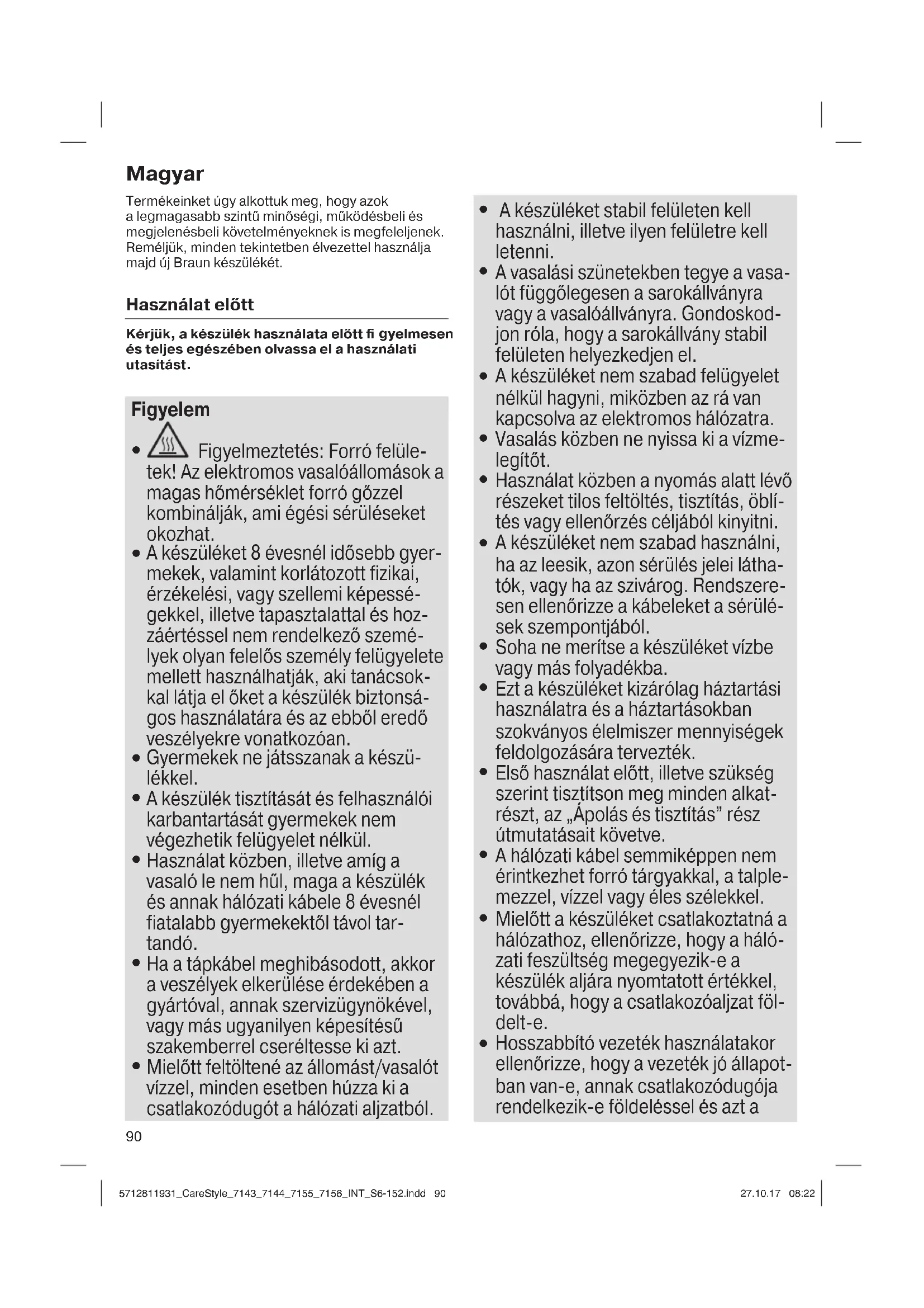 Hosszabbító vezeték használatakor ellenőrizze, hogy a vezeték jó állapot- ban van-e, annak csatlakozódugója rendelkezik-e földeléssel és azt a 5712811931_CareStyle_7143_7144_7155_7156_INT_S6-152.indd 905712811931_CareStyle_7143_7144_7155_7156_INT_S6-152.indd 90 27.10.17 08:2227.10.17 08:2291 készülék névleges áramerősségére (16 A) méretezték-e.
