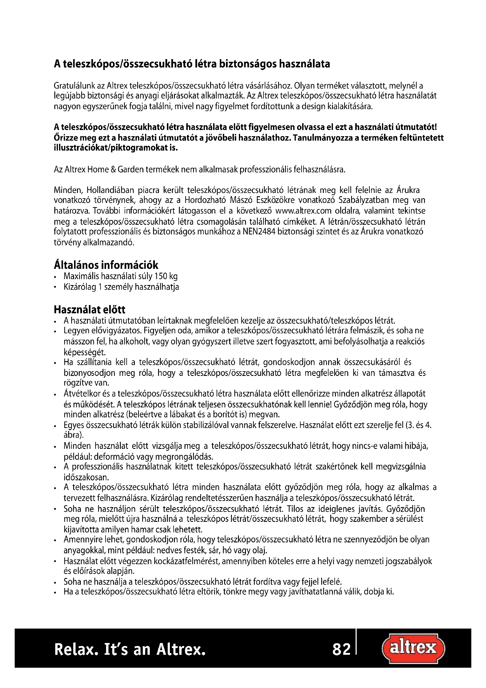 5.A teleszkópos/összecsukható létra biztonságos használata Gratulálunk az Altrex teleszkópos/összecsukható létra vásárlásához. Olyan terméket választott, melynél a legújabb biztonsági és anyagi eljárásokat alkalmazták. Az Altrex teleszkópos/összecsukható létra használatát nagyon egyszerűnek fogja találni, mivel nagy figyelmet fordítottunk a design kialakítására. A teleszkópos/összecsukható létra használata előtt figyelmesen olvassa el ezt a használati útmutatót! Őrizze meg ezt a használati útmutatót a jövőbeli használathoz. Tanulmányozza a terméken feltüntetett illusztrációkat/piktogramokat is. Az Altrex Home & Garden termékek nem alkalmasak professzionális felhasználásra. Minden, Hollandiában piacra került teleszkópos/összecsukható létrának meg kell felelnie az Árukra vonatkozó törvénynek, ahogy az a Hordozható Mászó Eszközökre vonatkozó Szabályzatban meg van határozva. További információkért látogasson el a következő www.altrex.com oldalra, valamint tekintse meg a teleszkópos/összecsukható létra csomagolásán található címkéket. A létrán/összecsukható létrán folytatott professzionális és biztonságos munkához a NEN2484 biztonsági szintet és az Árukra vonatkozó törvény alkalmazandó. Általános információk Maximális használati súly 150 kg Kizárólag 1 személy használhatja Használat előtt A használati útmutatóban leírtaknak megfelelően kezelje az összecsukható/teleszkópos létrát. Legyen elővigyázatos. Figyeljen oda, amikor a teleszkópos/összecsukható létrára felmászik, és soha ne másszon fel, ha alkoholt, vagy olyan gyógyszert illetve szert fogyasztott, ami befolyásolhatja a reakciós képességét. Ha szállítania kell a teleszkópos/összecsukható létrát, gondoskodjon annak összecsukásáról és bizonyosodjon meg róla, hogy a teleszkópos/összecsukható létra megfelelően ki van támasztva és rögzítve van. Átvételkor és a teleszkópos/összecsukható létra használata előtt ellenőrizze minden alkatrész állapotát és működését. A teleszkópos létrának teljesen összecsukhatónak kell lennie! Győződjön meg róla, hogy minden alkatrész (beleértve a lábakat és a borítót is) megvan. Egyes összecsukható létrák külön stabilizálóval vannak felszerelve. Használat előtt ezt szerelje fel (3. és 4. ábra). Minden használat előtt vizsgálja meg a teleszkópos/összecsukható létrát, hogy nincs-e valami hibája, például: deformáció vagy megrongálódás. A professzionális használatnak kitett teleszkópos/összecsukható létrát szakértőnek kell megvizsgálnia időszakosan. A teleszkópos/összecsukható létra minden használata előtt győződjön meg róla, hogy az alkalmas a tervezett felhasználásra. Kizárólag rendeltetésszerűen használja a teleszkópos/összecsukható létrát. Soha ne használjon sérült teleszkópos/összecsukható létrát. Tilos az ideiglenes javítás. Győződjön meg róla, mielőtt újra használná a teleszkópos létrát/összecsukható létrát, hogy szakember a sérülést kijavította amilyen hamar csak lehetett. Amennyire lehet, gondoskodjon róla, hogy teleszkópos/összecsukható létra ne szennyeződjön be olyan anyagokkal, mint például: nedves festék, sár, hó vagy olaj. Használat előtt végezzen kockázatfelmérést, amennyiben köteles erre a helyi vagy nemzeti jogszabályok és előírások alapján. Soha ne használja a teleszkópos/összecsukható létrát fordítva vagy fejjel lefelé. Ha a teleszkópos/összecsukható létra eltörik, tönkre megy vagy javíthatatlanná válik, dobja ki.