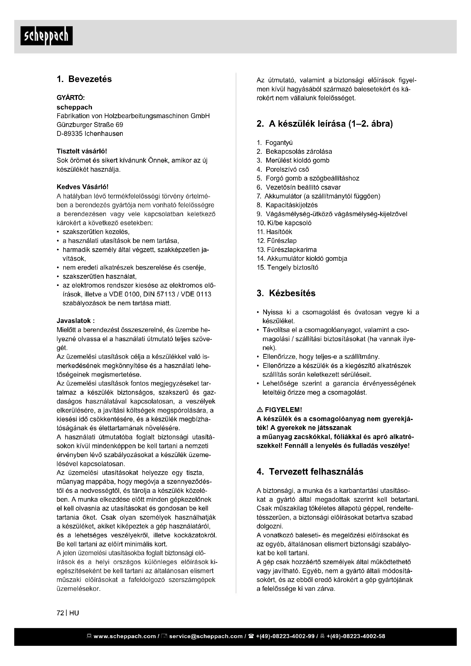 - az elektromos rendszer kiesése az elektromos elő- írások, illetve a VDE 0100, DIN 57113 / VDE 0113 szabályozások be nem tartása miatt. Javaslatok : Mielőtt a berendezést összeszerelné, és üzembe he- lyezné olvassa el a használati útmutató teljes szöve- gét. Az üzemelési utasítások célja a készülékkel való is- merkedésének megkönnyítése és a használati lehe- tőségeinek megismertetése. Az üzemelési utasítások fontos megjegyzéseket tar- talmaz a készülék biztonságos, szakszerű és gaz- daságos használatával kapcsolatosan, a veszélyek elkerülésére, a javítási költségek megspórolására, a kiesési idő csökkentésére, és a készülék megbízha- tóságának és élettartamának növelésére. A használati útmutatóba foglalt biztonsági utasítá- sokon kívül mindenképpen be kell tartani a nemzeti érvényben lévő szabályozásokat a készülék üzeme- lésével kapcsolatosan. Az üzemelési utasításokat helyezze egy tiszta, műanyag mappába, hogy megóvja a szennyeződés- től és a nedvességtől, és tárolja a készülék közelé- ben. A munka elkezdése előtt minden gépkezelőnek el kell olvasnia az utasításokat és gondosan be kell tartania őket. Csak olyan személyek használhatják a készüléket, akiket kiképeztek a gép használatáról, és a lehetséges veszélyekről, illetve kockázatokról. Be kell tartani az előírt minimális kort. A jelen üzemelési utasításokba foglalt biztonsági elő- írások és a helyi országos különleges előírások ki- egészítéseként be kell tartani az általánosan elismert műszaki előírásokat a fafeldolgozó szerszámgépek üzemelésekor. www.scheppach.com / service@scheppach.com / +(49)-08223-4002-99 / +(49)-08223-4002-58