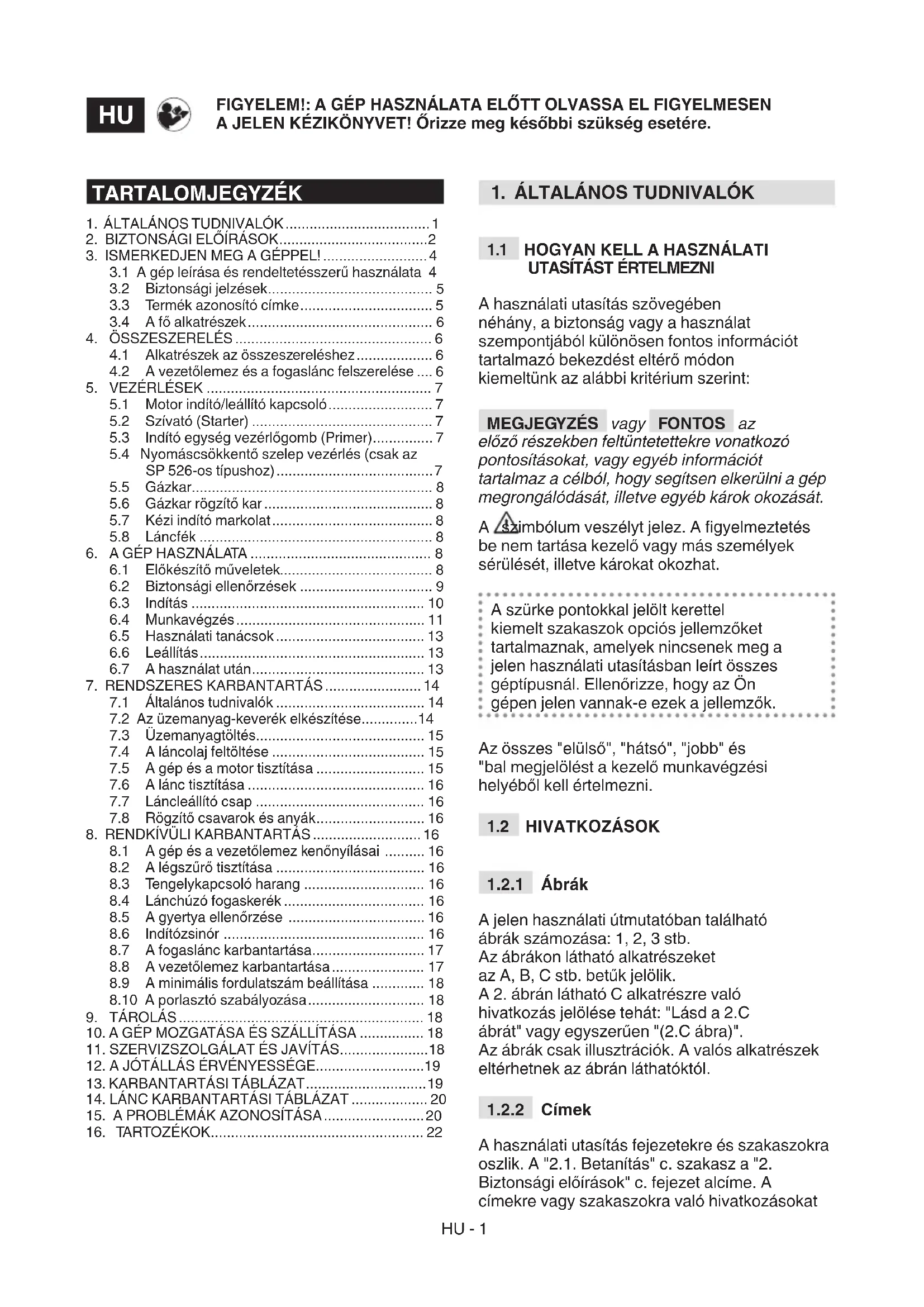 A használati utasítás fejezetekre és szakaszokra oszlik. A "2.1. Betanítás" c. szakasz a "2. Biztonsági előírások" c. fejezet alcíme. A címekre vagy szakaszokra való hivatkozásokat FIGYELEM!: A GÉP HASZNÁLATA ELŐTT OLVASSA EL FIGYELMESEN A JELEN KÉZIKÖNYVET! Őrizze meg későbbi szükség esetére.