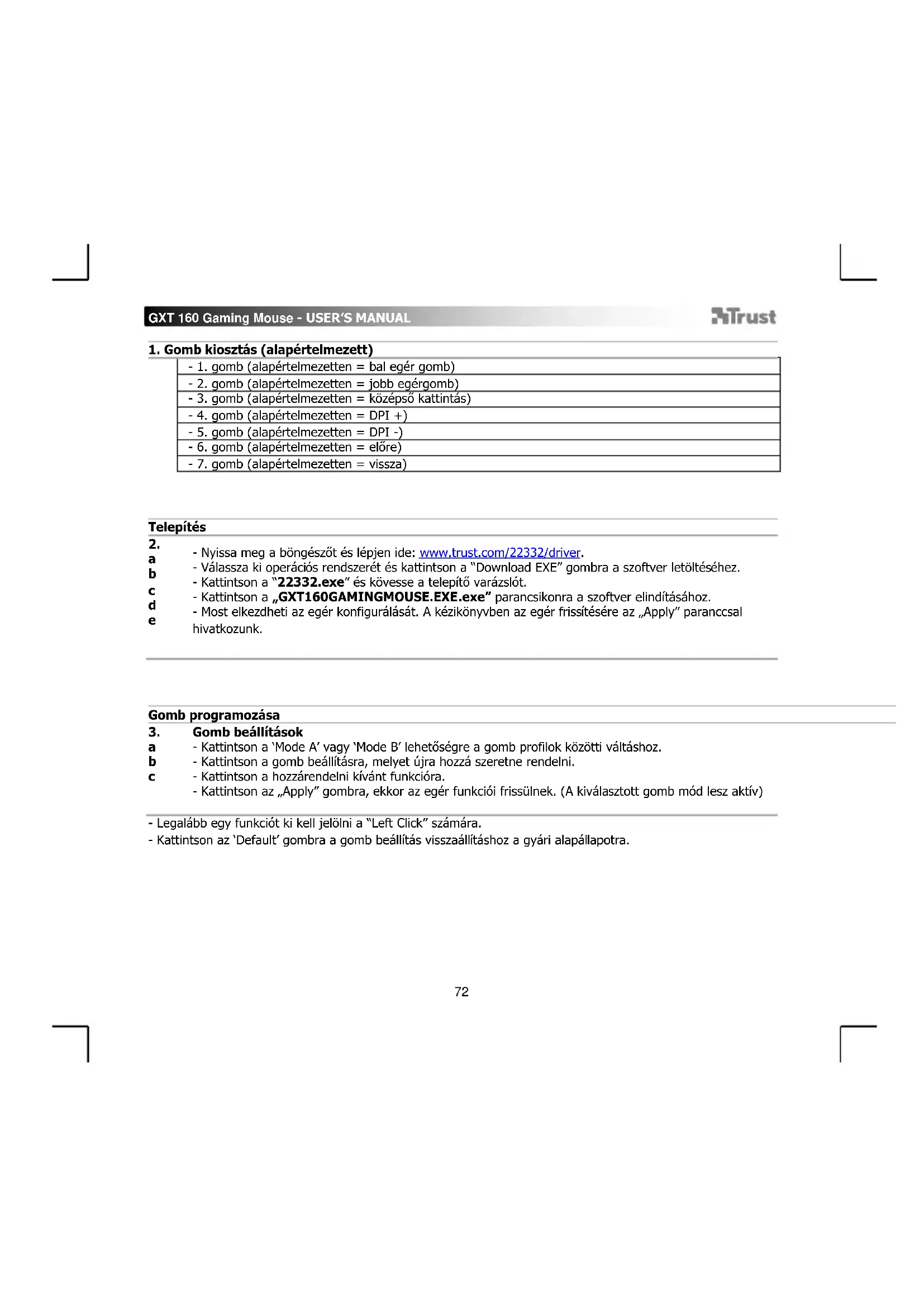 - Nyissa meg a böngészőt és lépjen ide: www.trust.com/22332/driver. - Válassza ki operációs rendszerét és kattintson a “Download EXE” gombra a szoftver letöltéséhez. - Kattintson a “22332.exe” és kövesse a telepítő varázslót. - Kattintson a „GXT160GAMINGMOUSE.EXE.exe” parancsikonra a szoftver elindításához. - Most elkezdheti az egér konfigurálását. A kézikönyvben az egér frissítésére az „Apply” paranccsal hivatkozunk.