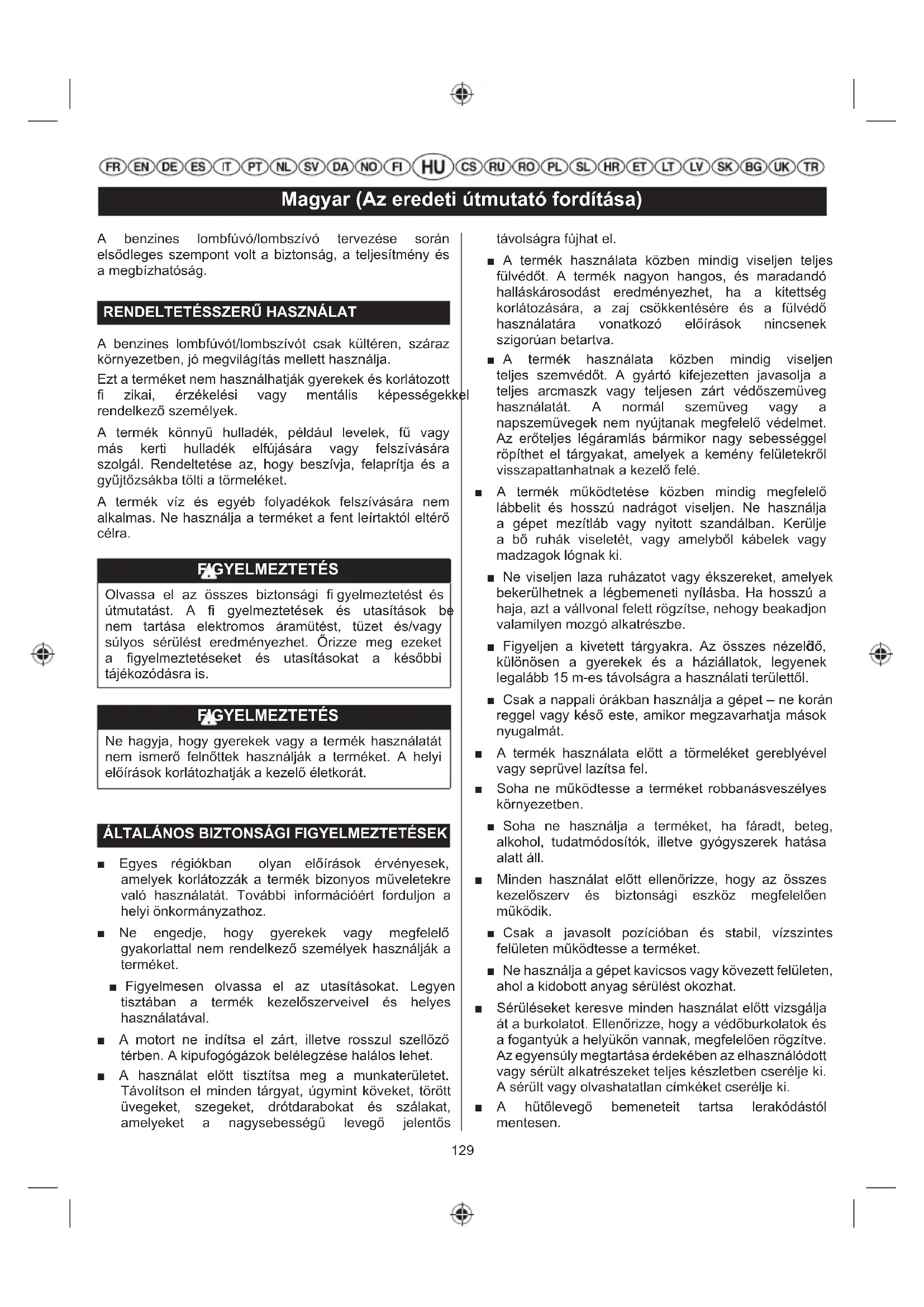 ■ Egyes régiókban olyan előírások érvényesek, amelyek korlátozzák a termék bizonyos műveletekre való használatát. További információért forduljon a helyi önkormányzathoz. ■ Ne engedje, hogy gyerekek vagy megfelelő gyakorlattal nem rendelkező személyek használják a terméket. ■ Figyelmesen olvassa el az utasításokat. Legyen tisztában a termék kezelőszerveivel és helyes használatával. ■ A motort ne indítsa el zárt, illetve rosszul szellőző térben. A kipufogógázok belélegzése halálos lehet. ■ A használat előtt tisztítsa meg a munkaterületet. Távolítson el minden tárgyat, úgymint köveket, törött üvegeket, szegeket, drótdarabokat és szálakat, amelyeket a nagysebességű levegő jelentős távolságra fújhat el. ■ A termék használata közben mindig viseljen teljes fülvédőt. A termék nagyon hangos, és maradandó halláskárosodást eredményezhet, ha a kitettség korlátozására, a zaj csökkentésére és a fülvédő használatára vonatkozó előírások nincsenek szigorúan betartva. ■ A termék használata közben mindig viseljen teljes szemvédőt. A gyártó kifejezetten javasolja a teljes arcmaszk vagy teljesen zárt védőszemüveg használatát. A normál szemüveg vagy a napszemüvegek nem nyújtanak megfelelő védelmet. Az erőteljes légáramlás bármikor nagy sebességgel röpíthet el tárgyakat, amelyek a kemény felületekről visszapattanhatnak a kezelő felé. ■ A termék működtetése közben mindig megfelelő lábbelit és hosszú nadrágot viseljen. Ne használja a gépet mezítláb vagy nyitott szandálban. Kerülje a bő ruhák viseletét, vagy amelyből kábelek vagy madzagok lógnak ki. ■ Ne viseljen laza ruházatot vagy ékszereket, amelyek bekerülhetnek a légbemeneti nyílásba. Ha hosszú a haja, azt a vállvonal felett rögzítse, nehogy beakadjon valamilyen mozgó alkatrészbe. ■ Figyeljen a kivetett tárgyakra. Az összes nézelő dő, különösen a gyerekek és a háziállatok, legyenek legalább 15 m-es távolságra a használati területtől. ■ Csak a nappali órákban használja a gépet – ne korán reggel vagy késő este, amikor megzavarhatja mások nyugalmát. ■ A termék használata előtt a törmeléket gereblyével vagy seprűvel lazítsa fel. ■ Soha ne működtesse a terméket robbanásveszélyes környezetben. ■ Soha ne használja a terméket, ha fáradt, beteg, alkohol, tudatmódosítók, illetve gyógyszerek hatása alatt áll. ■ Minden használat előtt ellenőrizze, hogy az összes kezelőszerv és biztonsági eszköz megfelelően működik. ■ Csak a javasolt pozícióban és stabil, vízszintes felületen működtesse a terméket. ■ Ne használja a gépet kavicsos vagy kövezett felületen, ahol a kidobott anyag sérülést okozhat. ■ Sérüléseket keresve minden használat előtt vizsgálja át a burkolatot. Ellenőrizze, hogy a védőburkolatok és a fogantyúk a helyükön vannak, megfelelően rögzítve. Az egyensúly megtartása érdekében az elhasználódott vagy sérült alkatrészeket teljes készletben cserélje ki. A sérült vagy olvashatatlan címkéket cserélje ki. ■ A hűtőlevegő bemeneteit tartsa lerakódástól mentesen.130 Magyar (Az eredeti útmutató fordítása) ■ Soha ne működtesse a gépet, ha emberek - különösen gyerekek - vagy állatok vannak a közelben. ■ Kerülje a termék használatát rossz időjárási feltételek mellett, különösen villámlás esetén. ■ Ne használja a gépet gyenge megvilágítás esetén. A kezelőnek tiszta rálátással kell rendelkeznie a munkaterületre, hogy azonosíthassa a potenciális veszélyeket. ■ Hasonló gépek egymás közelében történő használata növeli a halláskárosodás veszélyét, valamint annak veszélyét, hogy más személyek lépnek be az Ön munkaterületére. ■ Mindig biztosan támaszkodjon meg a lejtőkön. Gyalogoljon, ne fusson. ■ Mindig tartson megfelelő testtartást és egyensúlyt. Ne hajoljon ki túlságosan. A túlzott kihajlás egyensúlyvesztést eredményezhet. ■ Ne hagyja, hogy ruházata, kezei vagy bármilyen más testrésze az etetőcsúszdába, a kidobócsúszdába vagy bármilyen mozgó alkatrész közelébe kerüljön. ■ Soha ne működtesse a terméket hibás védőburkolatokkal vagy védőlemezekkel, illetve biztonsági berendezések, például felhelyezett hulladékgyűjtő nélkül. ■ Semmilyen módon ne módosítsa a gépet vagy használjon a gyártó által nem ajánlott alkatrészeket és tartozékokat. FIGYELMEZTETÉS A terméket csak akkor használja szívó üzemmódban, ha előzőleg összeszerelte a felső és alsó szívócsövet. Ezt a műveletet csak egyszer kell elvégezni. Ne működtesse a gépet szívó üzemmódban, ha csak a felső szívócső van felszerelve. A személyi sérülés kockázata jelentősen megnő, ha nem tartja be ezt a fi gyelmeztetést. FIGYELMEZTETÉS Ha a gép leesett, erős ütést kapott vagy rendellenesen kezd vibrálni, azonnal állítsa le a gépet, és vizsgálja át sérülések tekintetében vagy azonosítsa a vibráció okát. Minden sérülést hivatalos szervizközpontban kell megjavíttatni vagy kicseréltetni. ■ Ne érintse meg a zajtompító és henger körüli területeket, ezek a részek használat közben felforrósodnak. ■ Az üzemanyag újratöltése előtt állítsa le a motort és várjon, amíg a termék lehűl. ■ Az üzemanyag újratöltéséhez és keveréséhez jól szellőző helyet válasszon, ahol nincs nyílt láng, szikrák vagy egyéb gyújtóforrás, illetve nincsenek gyúlékony anyagok. ■ Ne dohányozzon az üzemanyag keverése vagy betöltése közben. ■ Az üzemanyagot benzineskannában tárolja és keverje. A közelben tartson egy megfelelő típusú tűzoltó készüléket, hogy elolthassa az üzemanyagtüzeket. ■ A motor elindítása előtt ne felejtse el az üzemanyagtank sapkáját szorosan visszatenni. ■ Tör