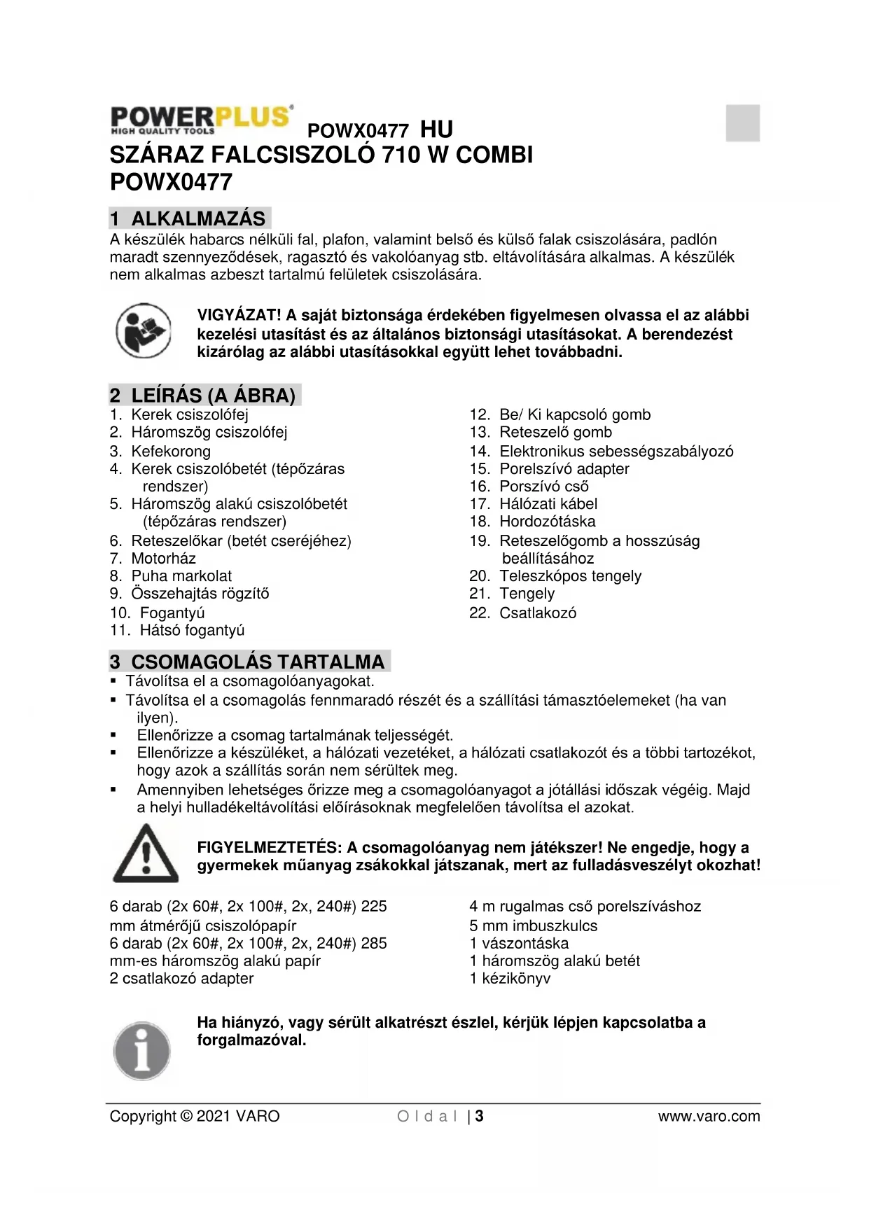 Ha a gép elhasználódott, ne dobja a háztartási szemétbe, hanem gondoskodjon annak környezetbarát elhelyezéséről! Az elhasználódott elektromos termékek hulladékait ne dobja a háztartási szemétbe. Kérjük, hogy gondoskodjon azok újrahasznosításáról, amennyiben erre lehetősége van. Az újrahasznosítási lehetőségeket illetően érdeklődjön a helyi köztisztasági szerveknél vagy a forgalmazónál!POWX0477 HU Copyright © 2021 VARO O l d a l | 12 www.varo.com