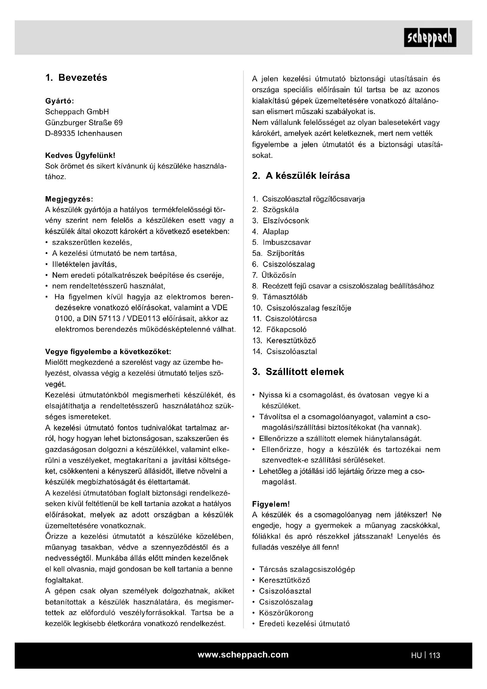 - Ha gyelmen kívül hagyja az elektromos beren- dezésekre vonatkozó előírásokat, valamint a VDE 0100, a DIN 57113 / VDE0113 előírásait, akkor az elektromos berendezés működésképtelenné válhat. Vegye gyelembe a következőket: Mielőtt megkezdené a szerelést vagy az üzembe he- lyezést, olvassa végig a kezelési útmutató teljes szö- vegét. Kezelési útmutatónkból megismerheti készülékét, és elsajátíthatja a rendeltetésszerű használatához szük- séges ismereteket. A kezelési útmutató fontos tudnivalókat tartalmaz ar- ról, hogy hogyan lehet biztonságosan, szakszerűen és gazdaságosan dolgozni a készülékkel, valamint elke- rülni a veszélyeket, megtakarítani a javítási költsége- ket, csökkenteni a kényszerű állásidőt, illetve növelni a készülék megbízhatóságát és élettartamát. A kezelési útmutatóban foglalt biztonsági rendelkezé- seken kívül feltétlenül be kell tartania azokat a hatályos előírásokat, melyek az adott országban a készülék üzemeltetésére vonatkoznak. Őrizze a kezelési útmutatót a készüléke közelében, műanyag tasakban, védve a szennyeződéstől és a nedvességtől. Munkába állás előtt minden kezelőnek el kell olvasnia, majd gondosan be kell tartania a benne foglaltakat. A gépen csak olyan személyek dolgozhatnak, akiket betanítottak a készülék használatára, és megismer- tettek az előforduló veszélyforrásokkal. Tartsa be a kezelők legkisebb életkorára vonatkozó rendelkezést.www.scheppach.com