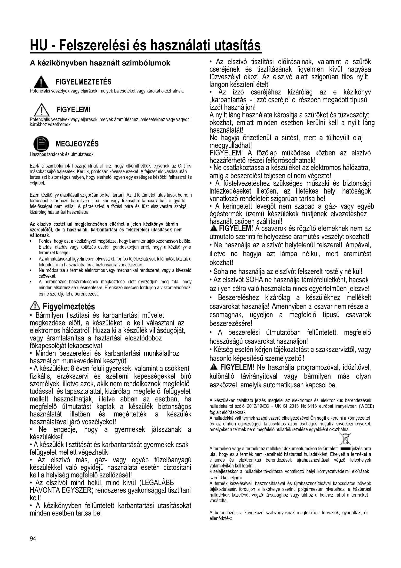 MEGJEGYZÉS Hasznos tanácsok és útmutatások Ezek a szimbólumok hozzájárulnak ahhoz, hogy elkerülhetőek legyenek az Önt és másokat sújtó balesetek. Kérjük, pontosan kövesse ezeket. A fejezet elolvasása után tartsa azt biztonságos helyen, hogy elérhető legyen egy esetleges későbbi felhasználás céljából. Ezen kézikönyv utasításait szigorúan be kell tartani. Az itt feltüntetett utasítások be nem tartásából származó bármilyen hiba, kár vagy tűzesettel kapcsolatban a gyártó felelősséget nem vállal. A páraelszívó a főzési pára és füst elszívására szolgál, kizárólag háztartási használatra. Az elszívó esztétikai megjelenésében eltérhet a jelen kézikönyv ábráin szereplőtől, de a használati, karbantartási és felszerelési utasítások nem változnak.