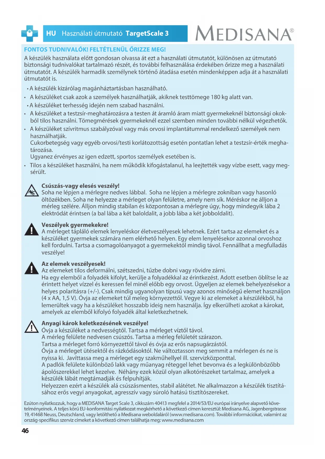 i tehdy, pokud je škoda na přístroji uznána jako případ záruky. MEDISANA AG Jagenbergstraße 19, 41468 NEUSS Německo E-Mail: info@medisana.de Internet: www.medisana.com46 HU Használati útmutató TargetScale 3 FONTOS TUDNIVALÓK! FELTÉTLENÜL ŐRIZZE MEG! A készülék használata előtt gondosan olvassa át ezt a használati útmutatót, különösen az útmutató biztonsági tudnivalókat tartalmazó részét, és további felhasználása érdekében őrizze meg a használati útmutatót. A készülék harmadik személynek történő átadása esetén mindenképpen adja át a használati útmutatót is.